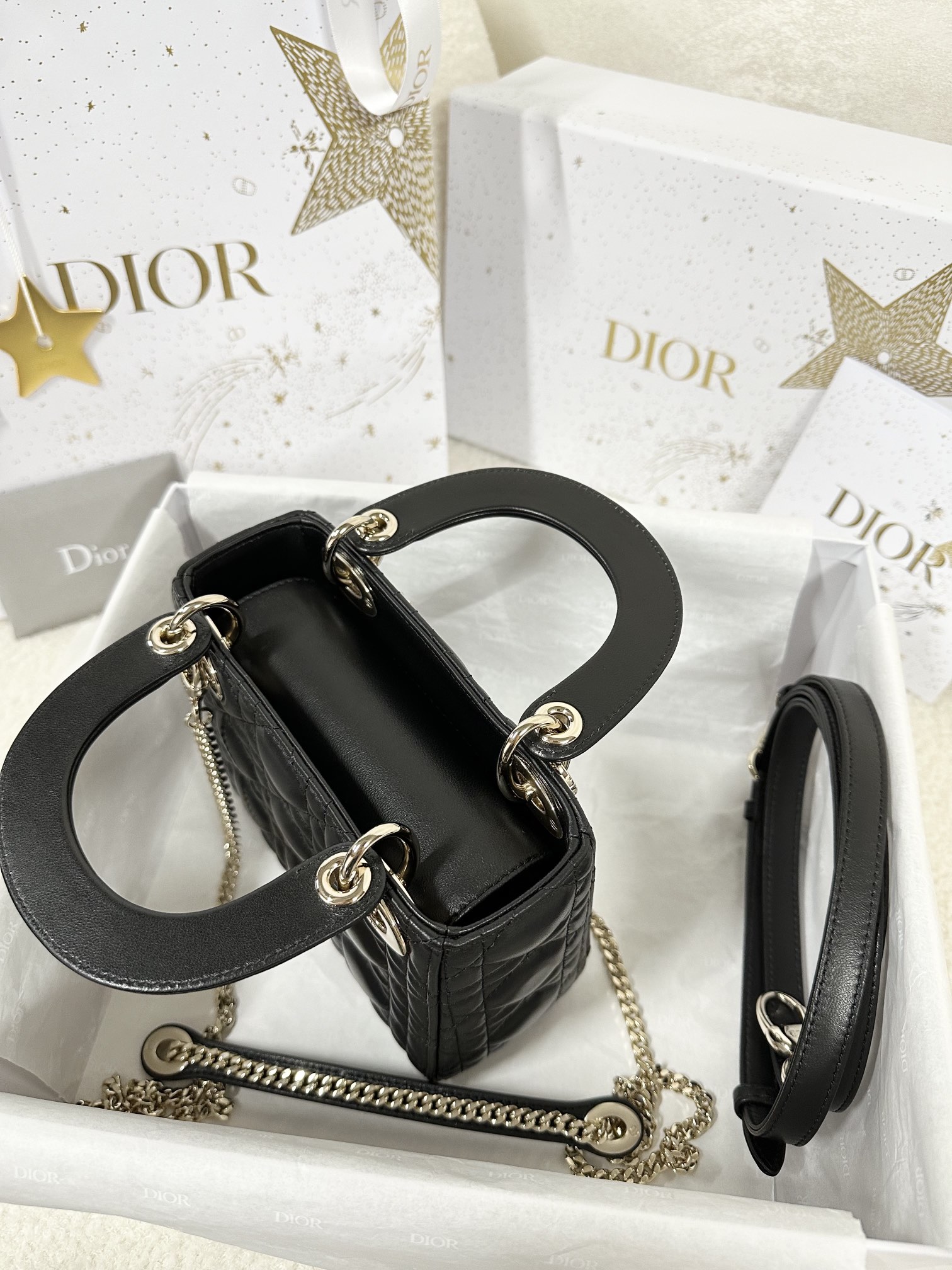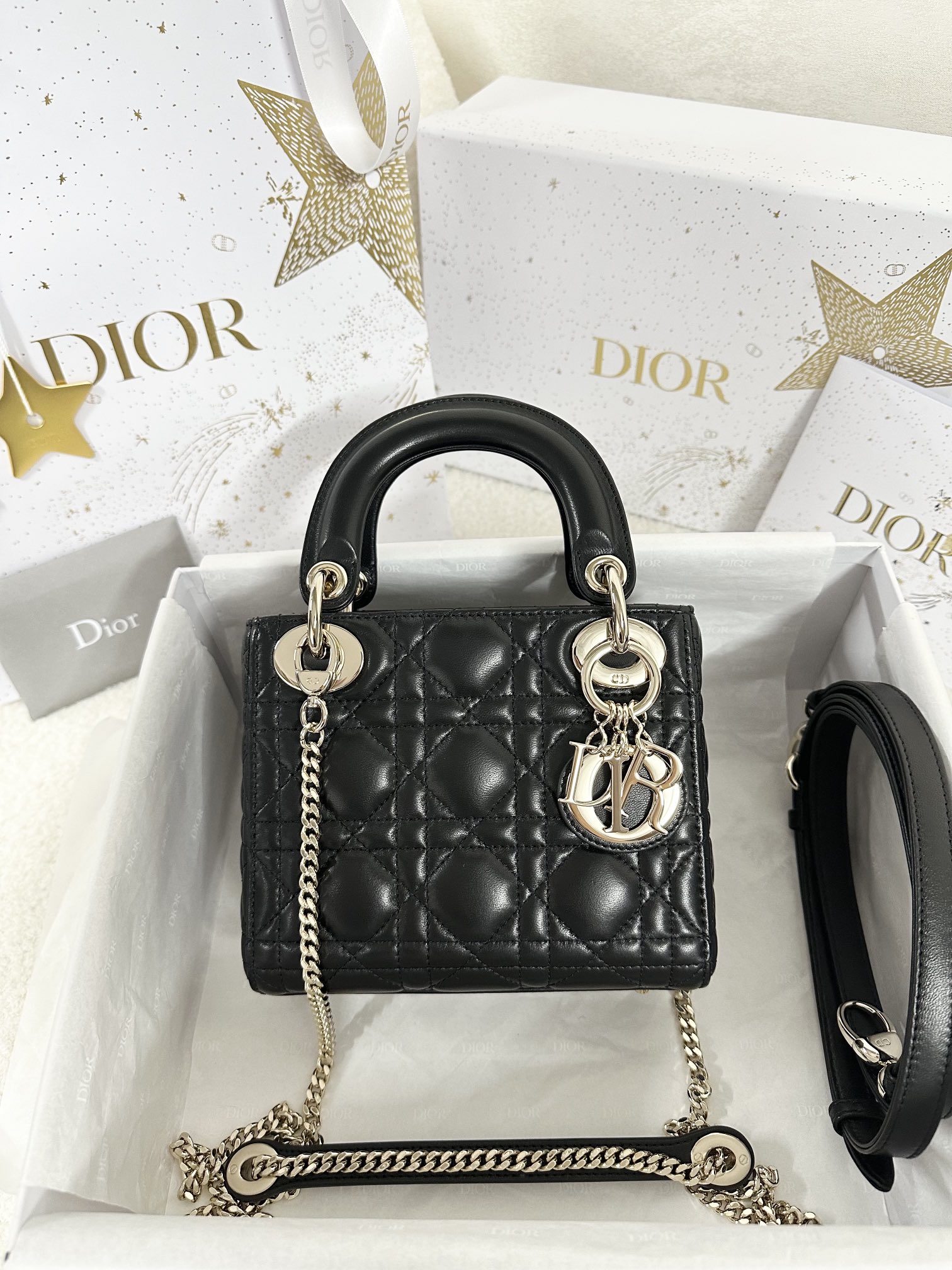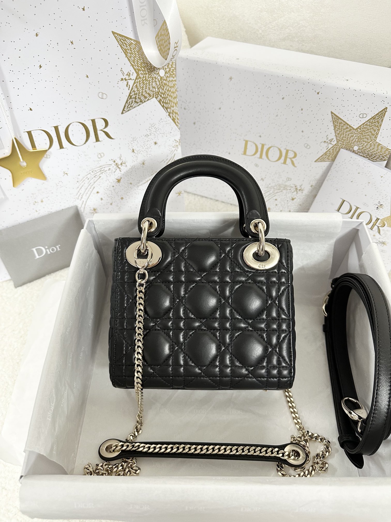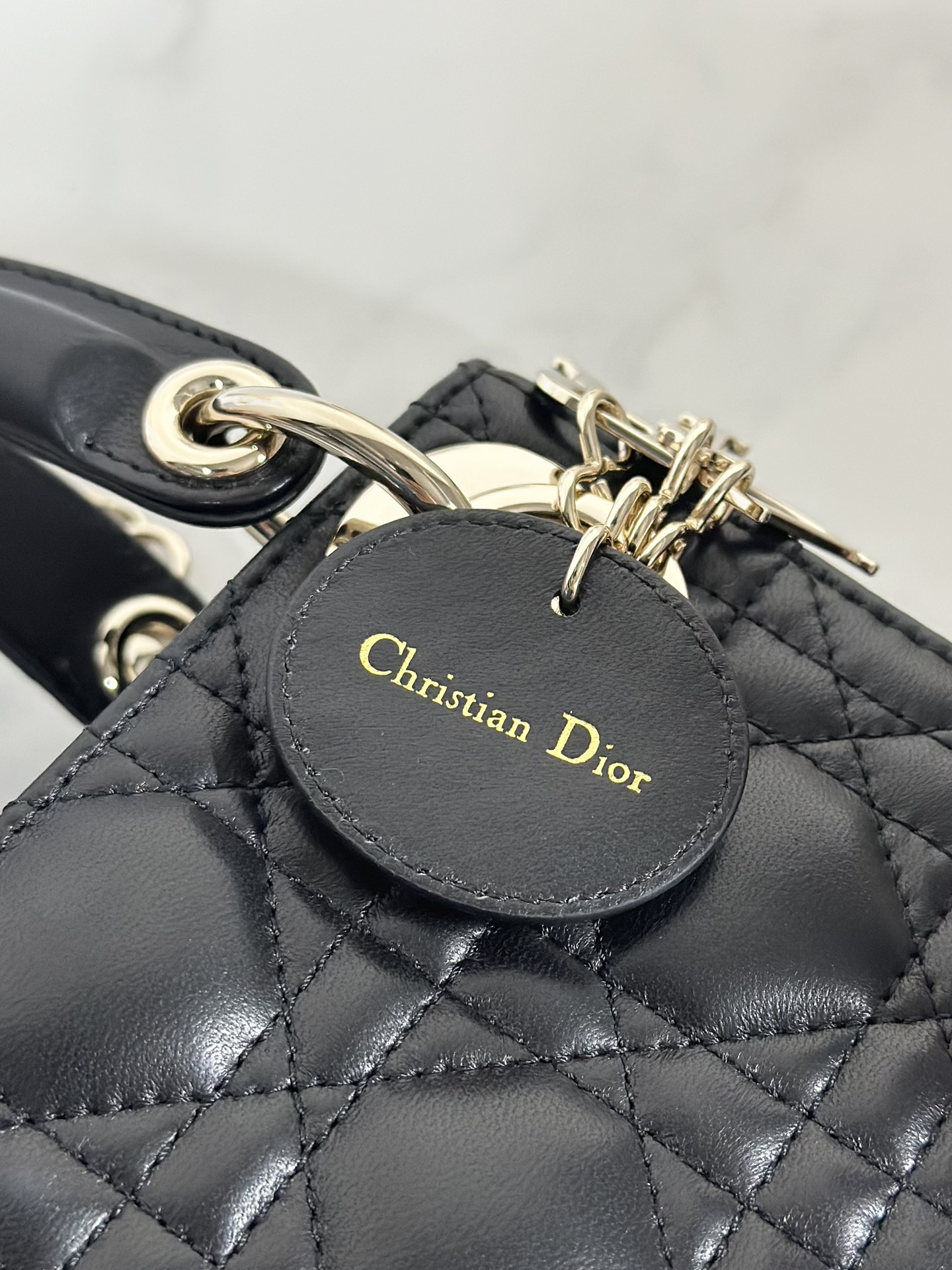 黑色羊皮金扣 Lady 戴妃包,标志性的字母吊饰,经典的菱格,手感极好的绵羊皮,人手必备的三格小包😍。迷人优雅又气场十足💃🏻,斜挎手拎也是女人味十足,经典时尚风格。ins和众多时尚icon都人手一个的美包,别错过哦❤️ size:17*7*15cm