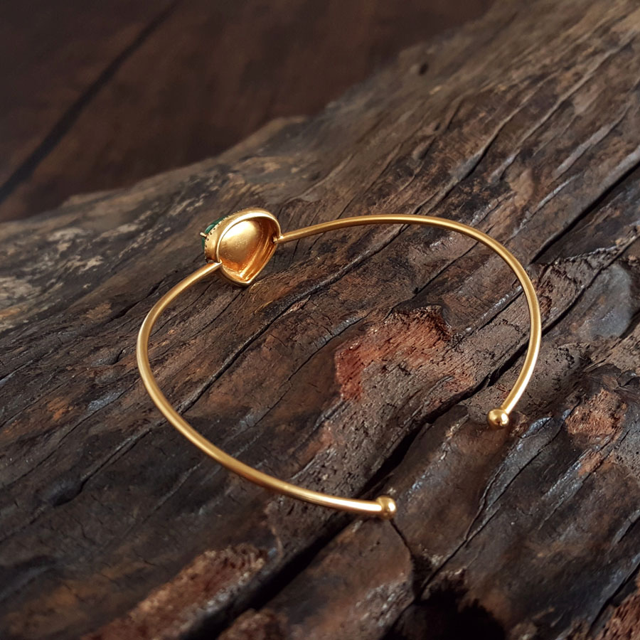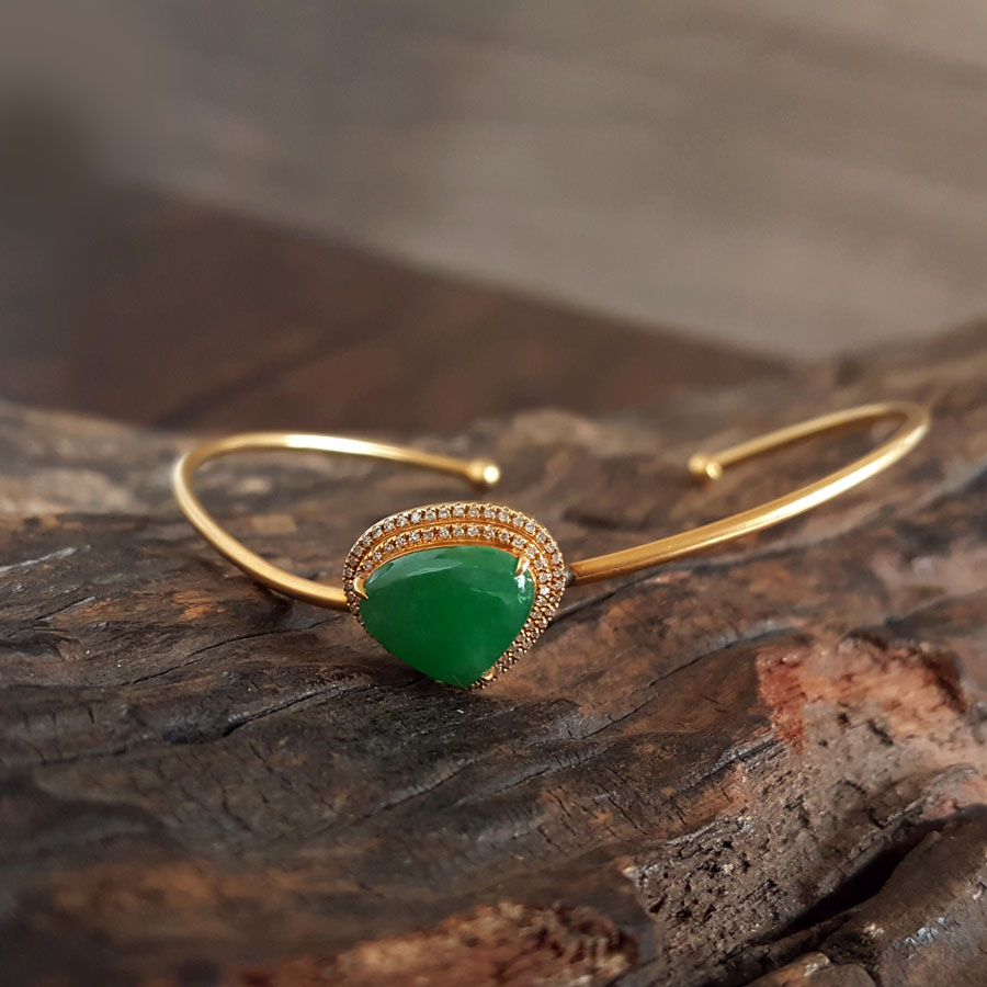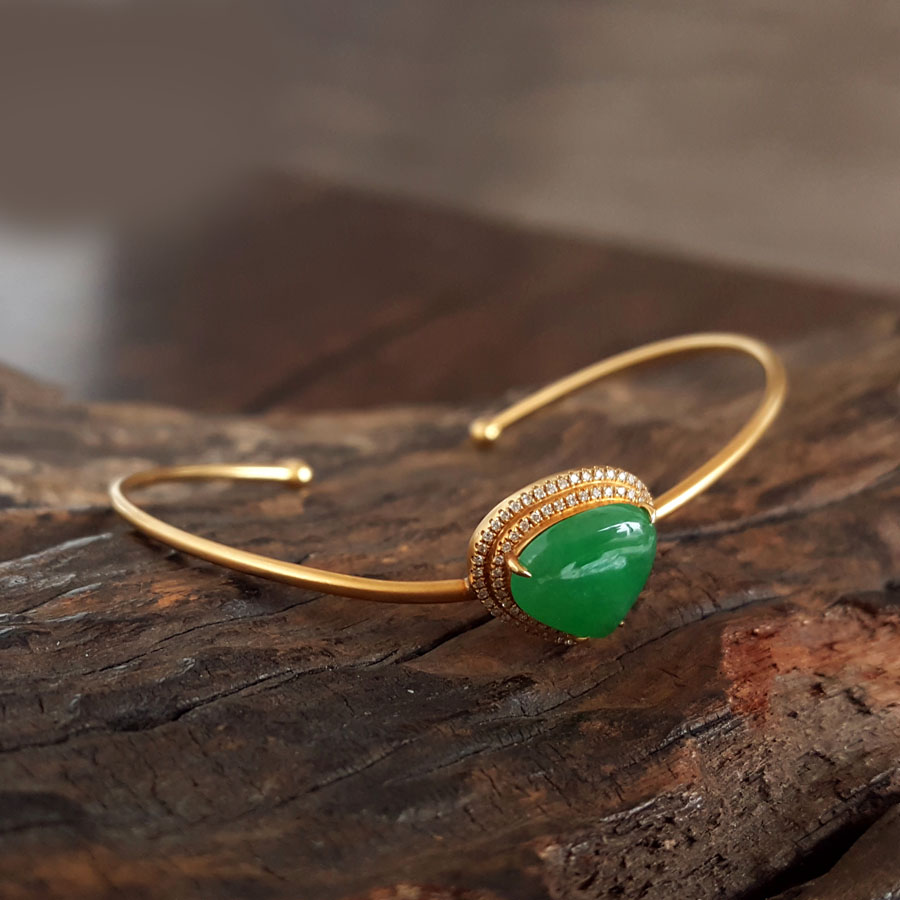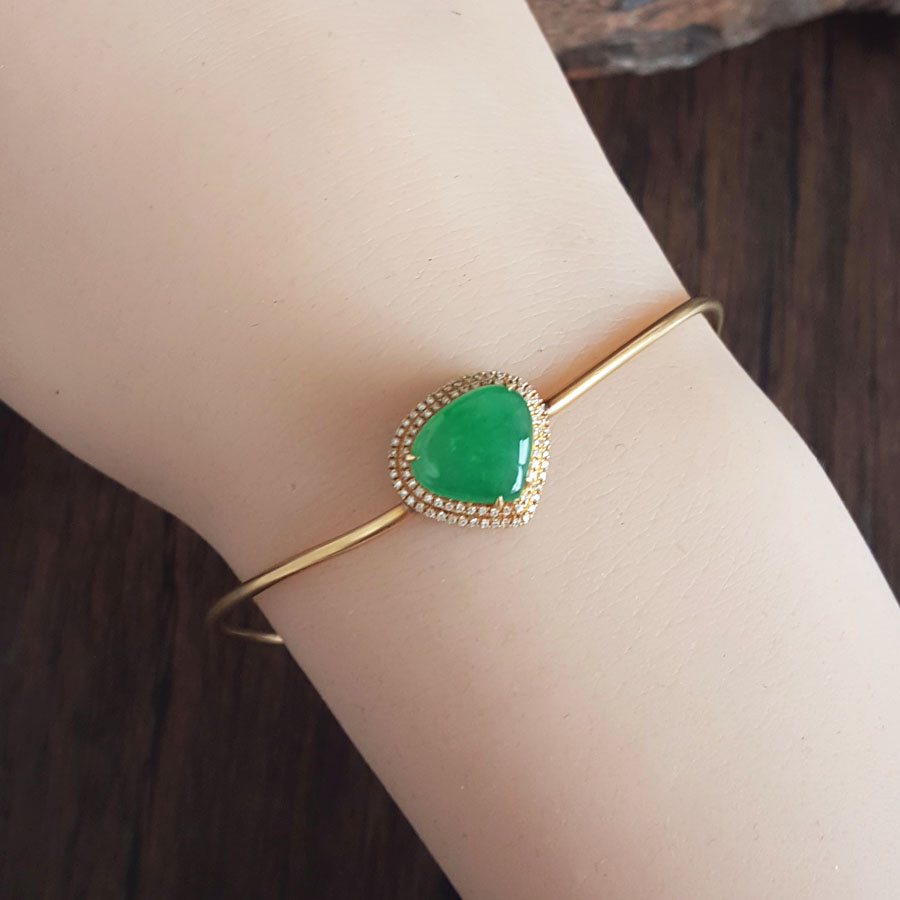 名称 | AU750黄金镶钻镶天然细腻满绿冰种水滴蛋面造型翡翠开口手镯 |