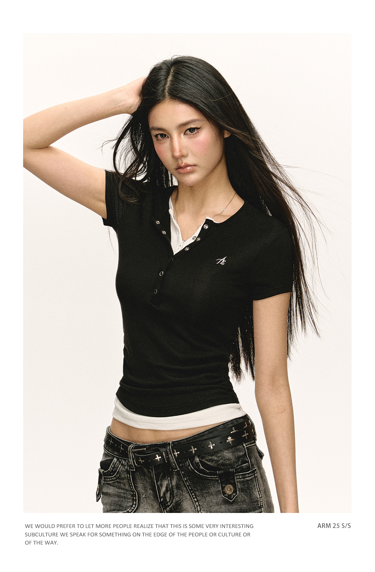 Ariseism 美式复古辣妹假两件短袖T恤女2025夏季新款修身显瘦上衣