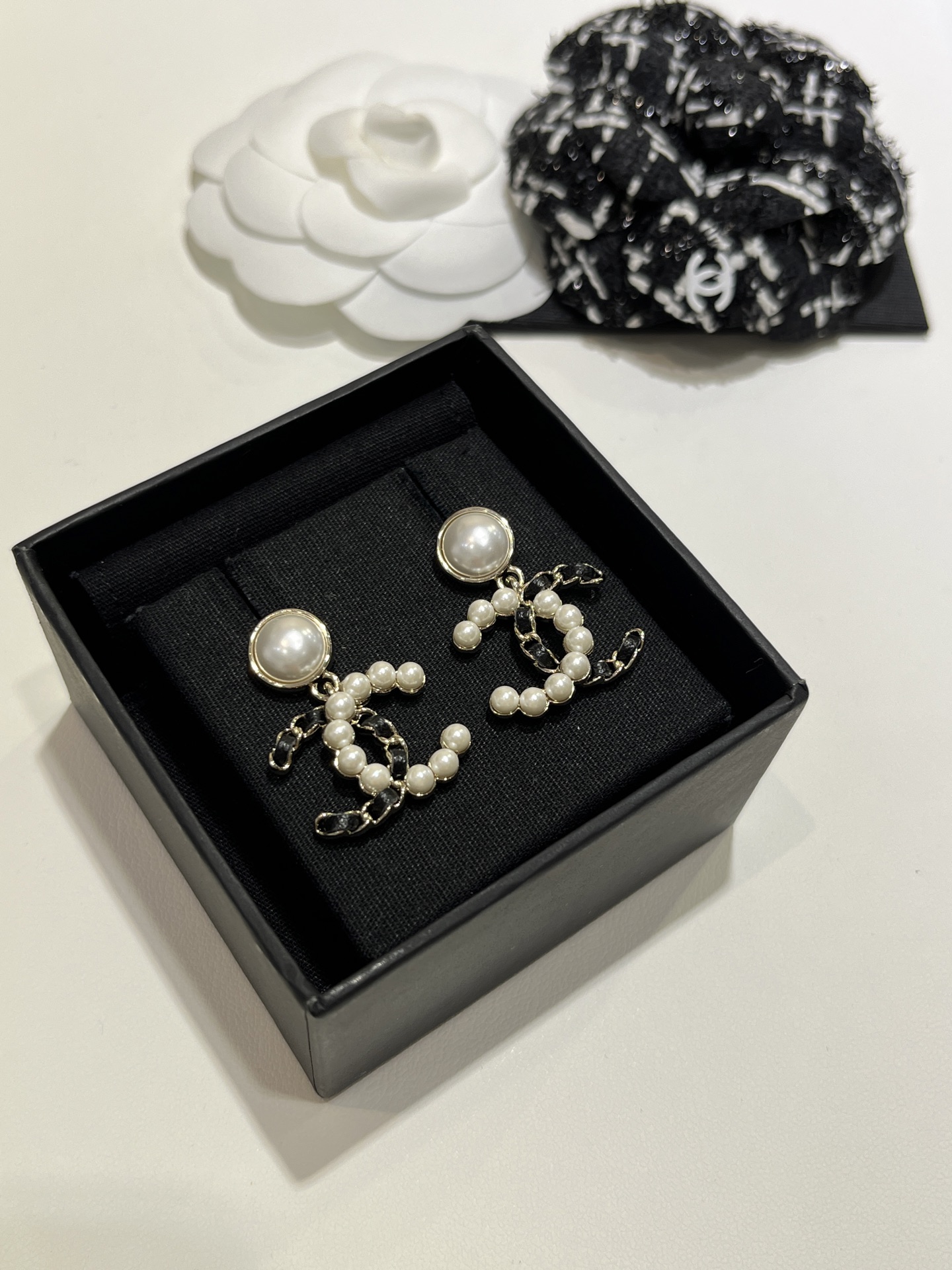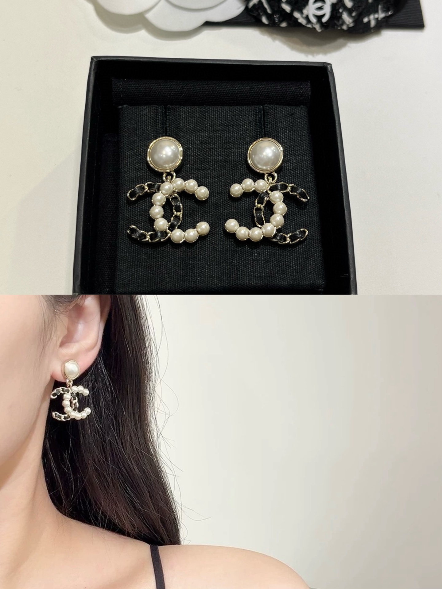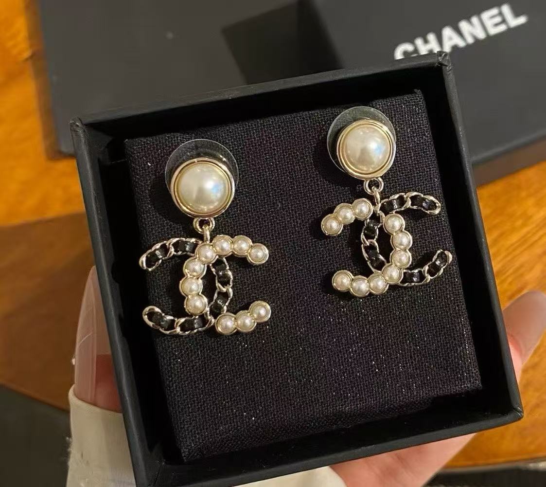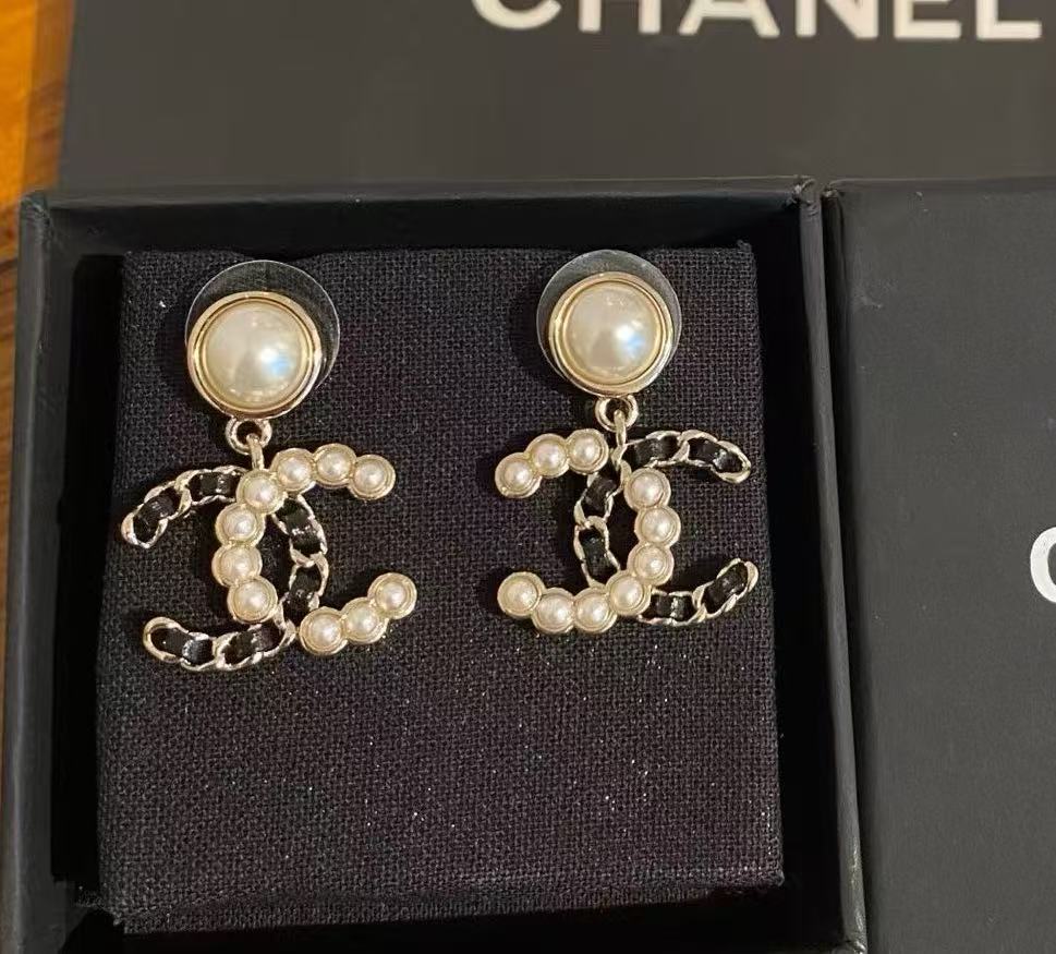 𝑪𝒉𝒂𝒏𝒆* 25K新款珍珠拼皮穿链双C耳环