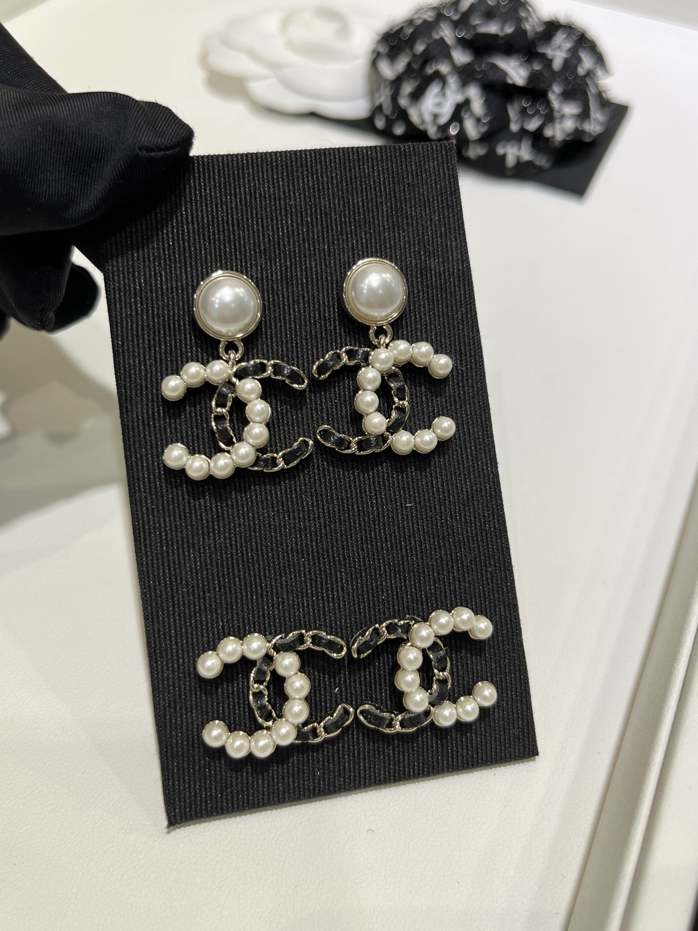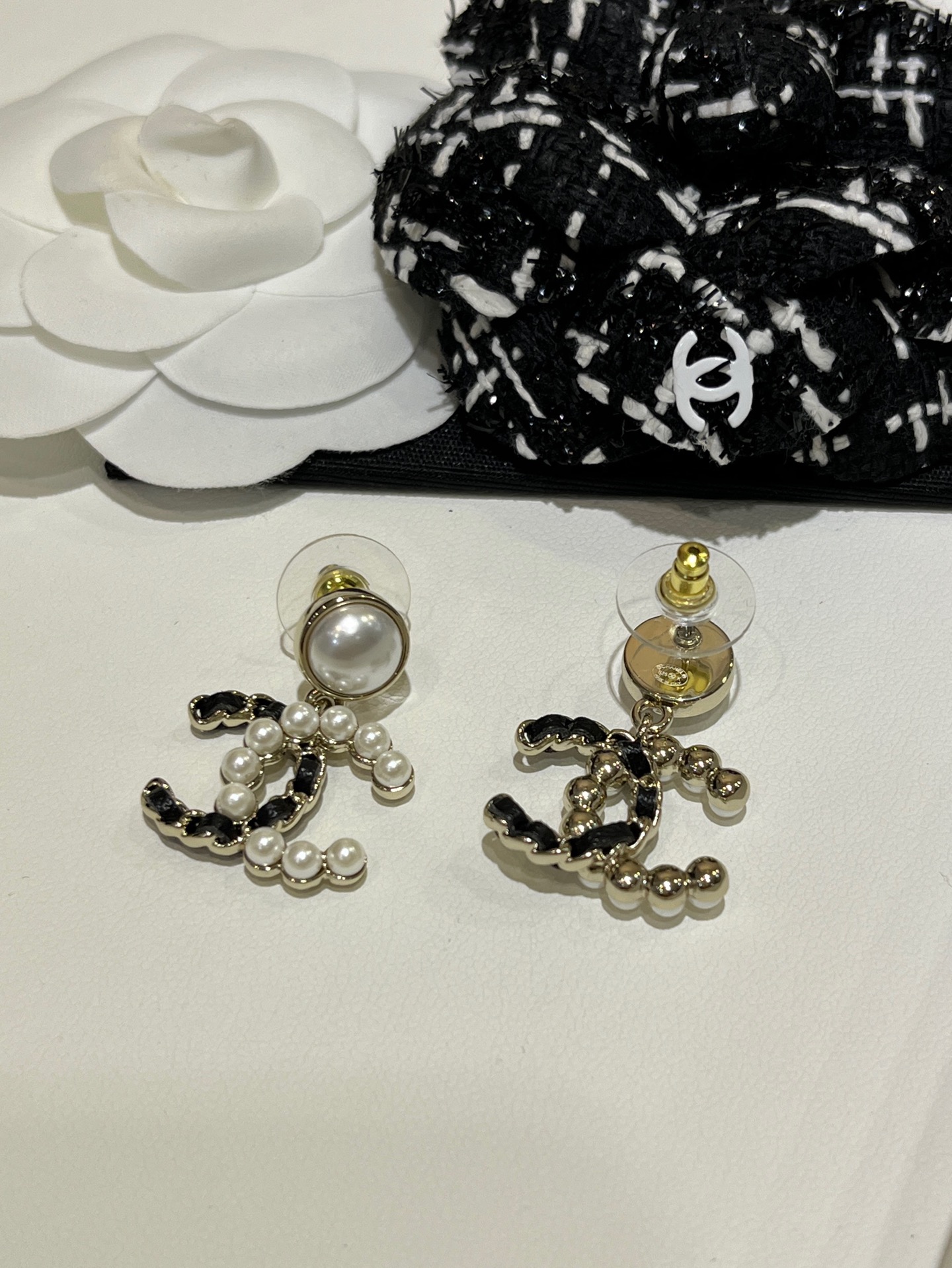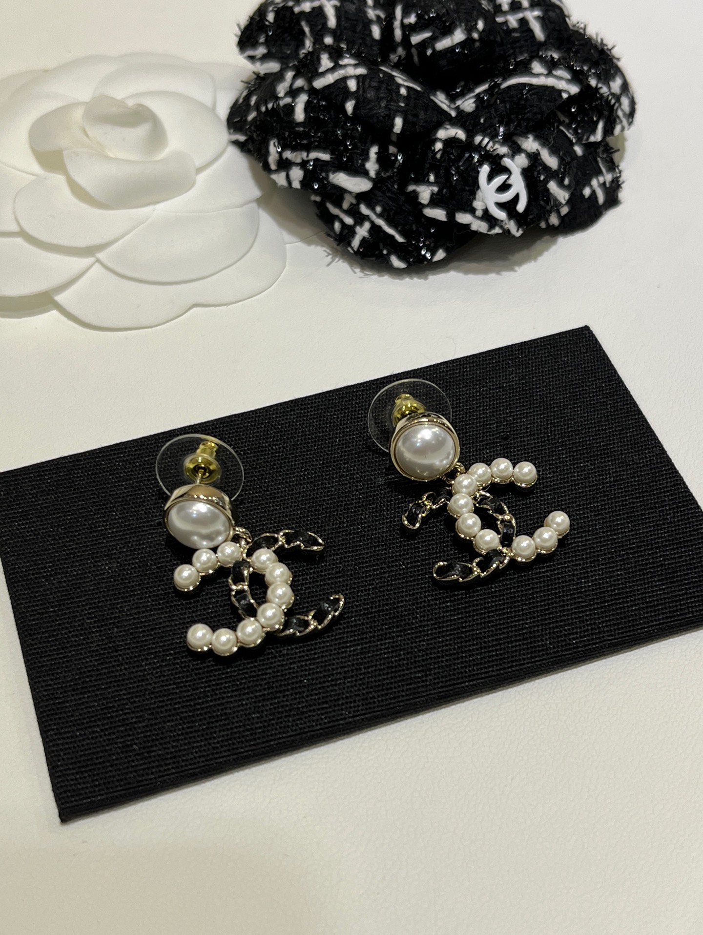𝑪𝒉𝒂𝒏𝒆* 25K新款珍珠拼皮穿链双C耳环