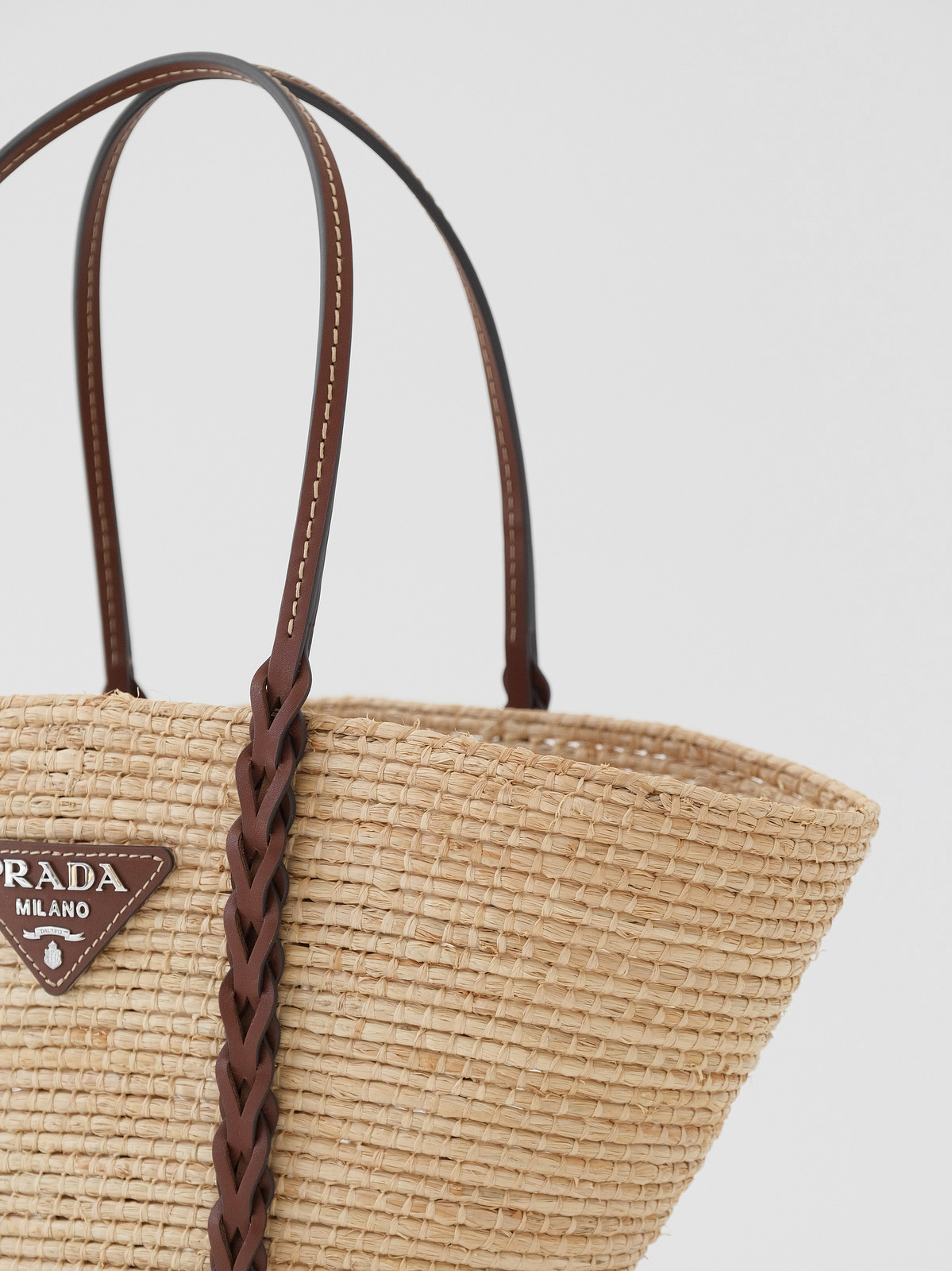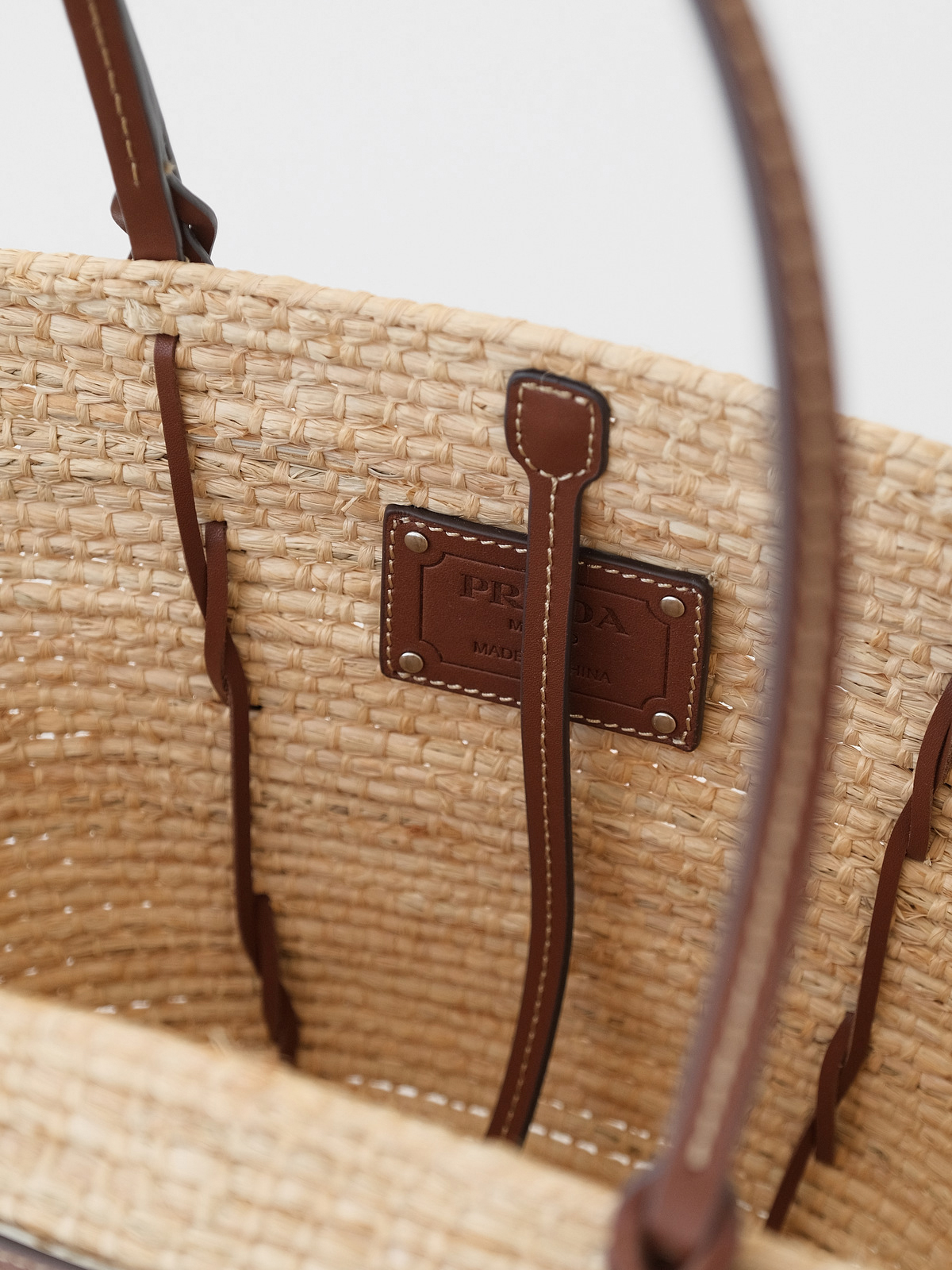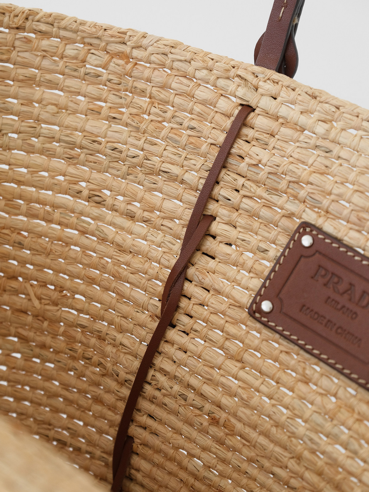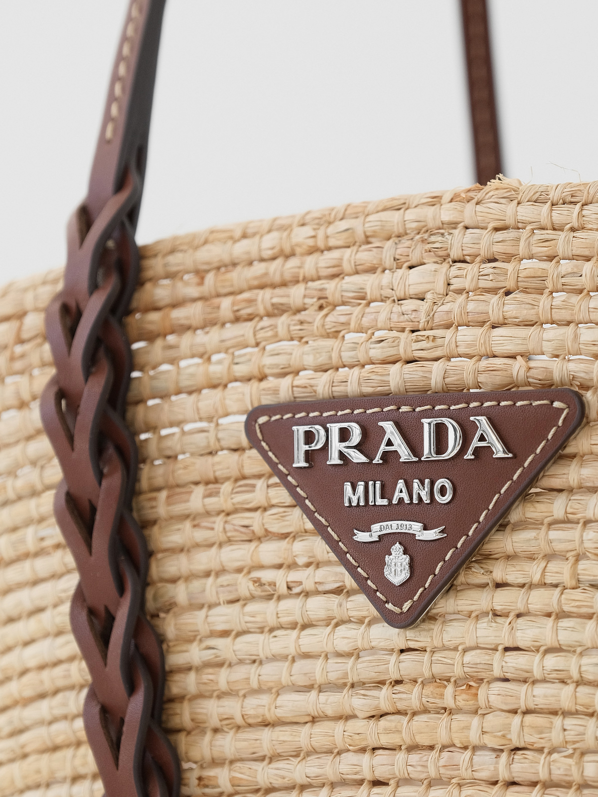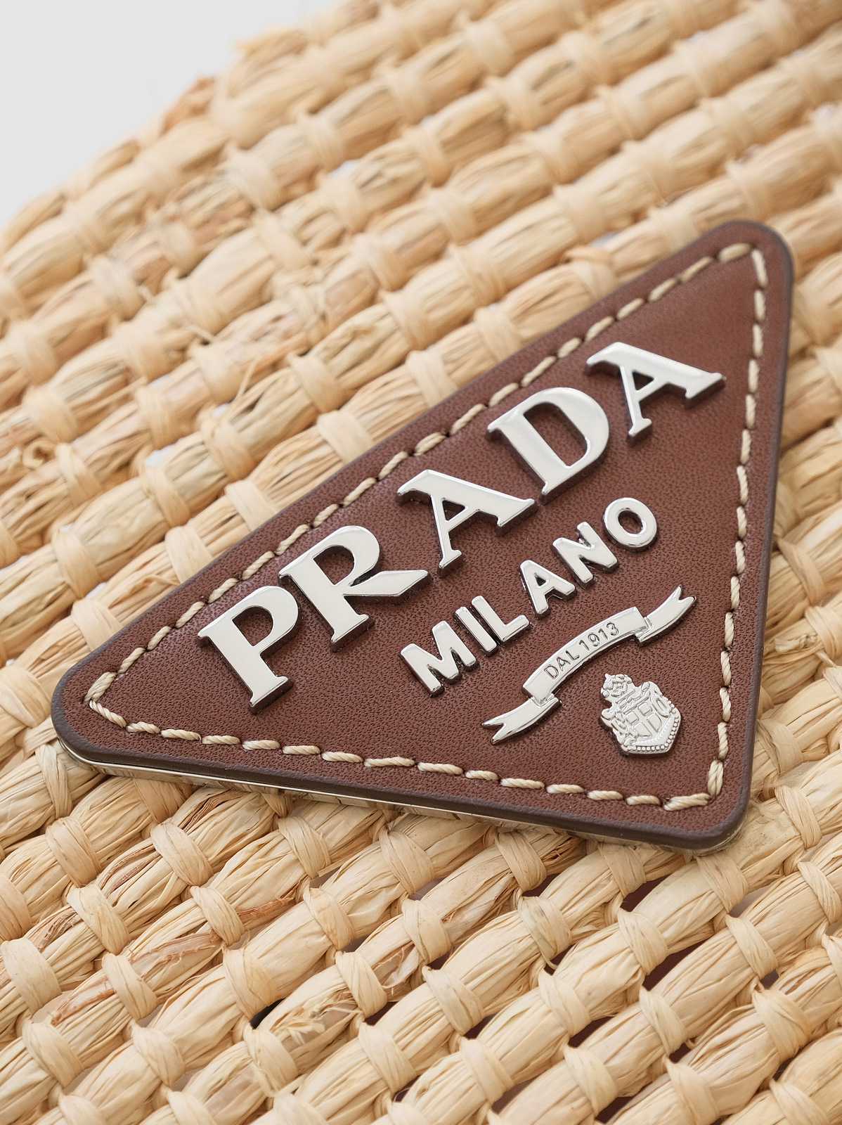 BT348-PRADA普拉达 三角形烫印徽标 稻草柳条拼皮革 托特包Tote包购物袋单肩手提包 原色(RG*MM)