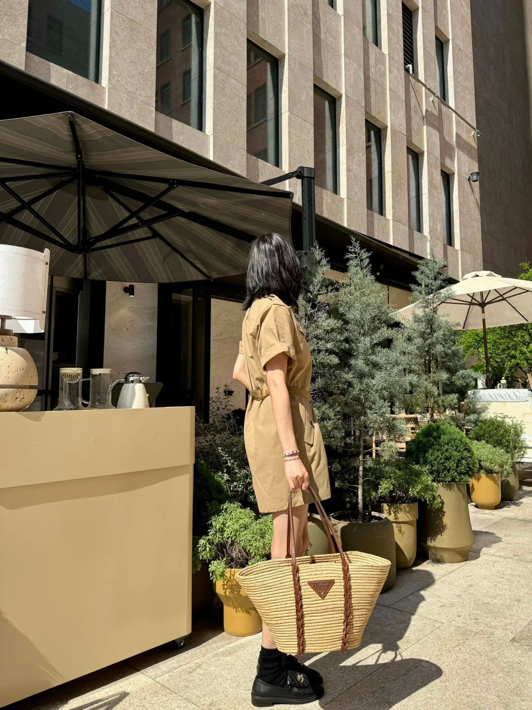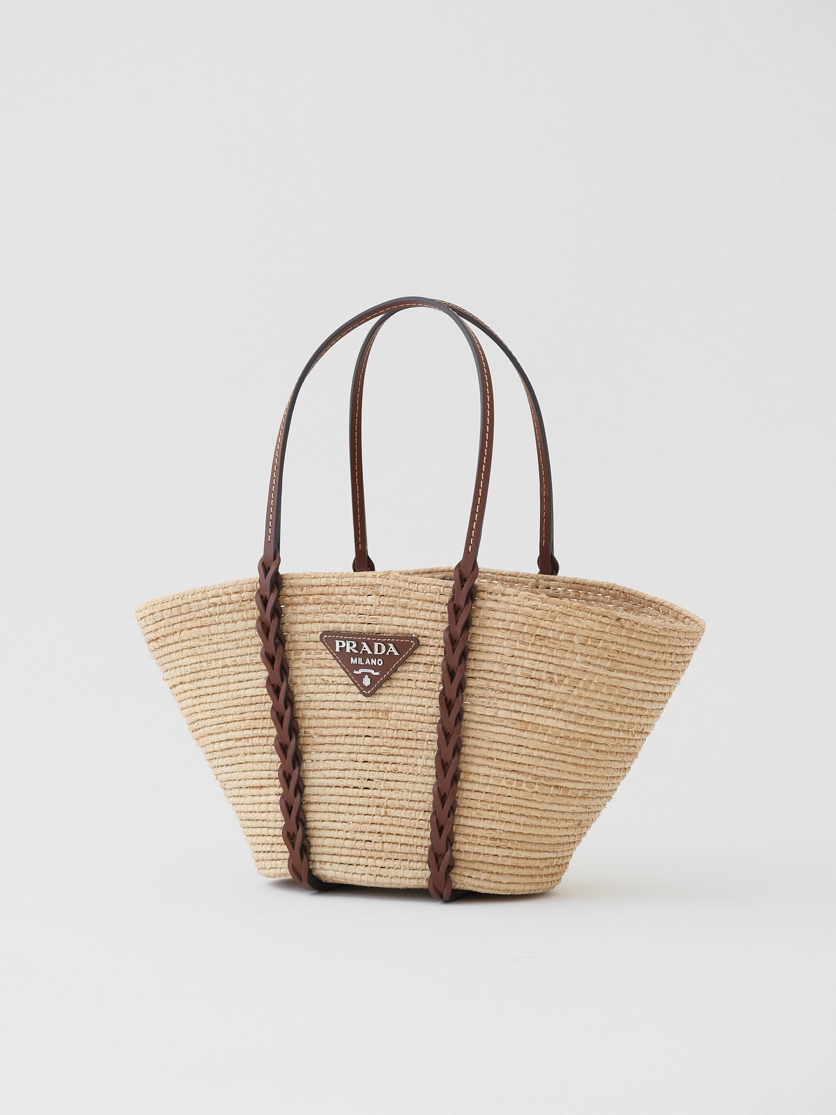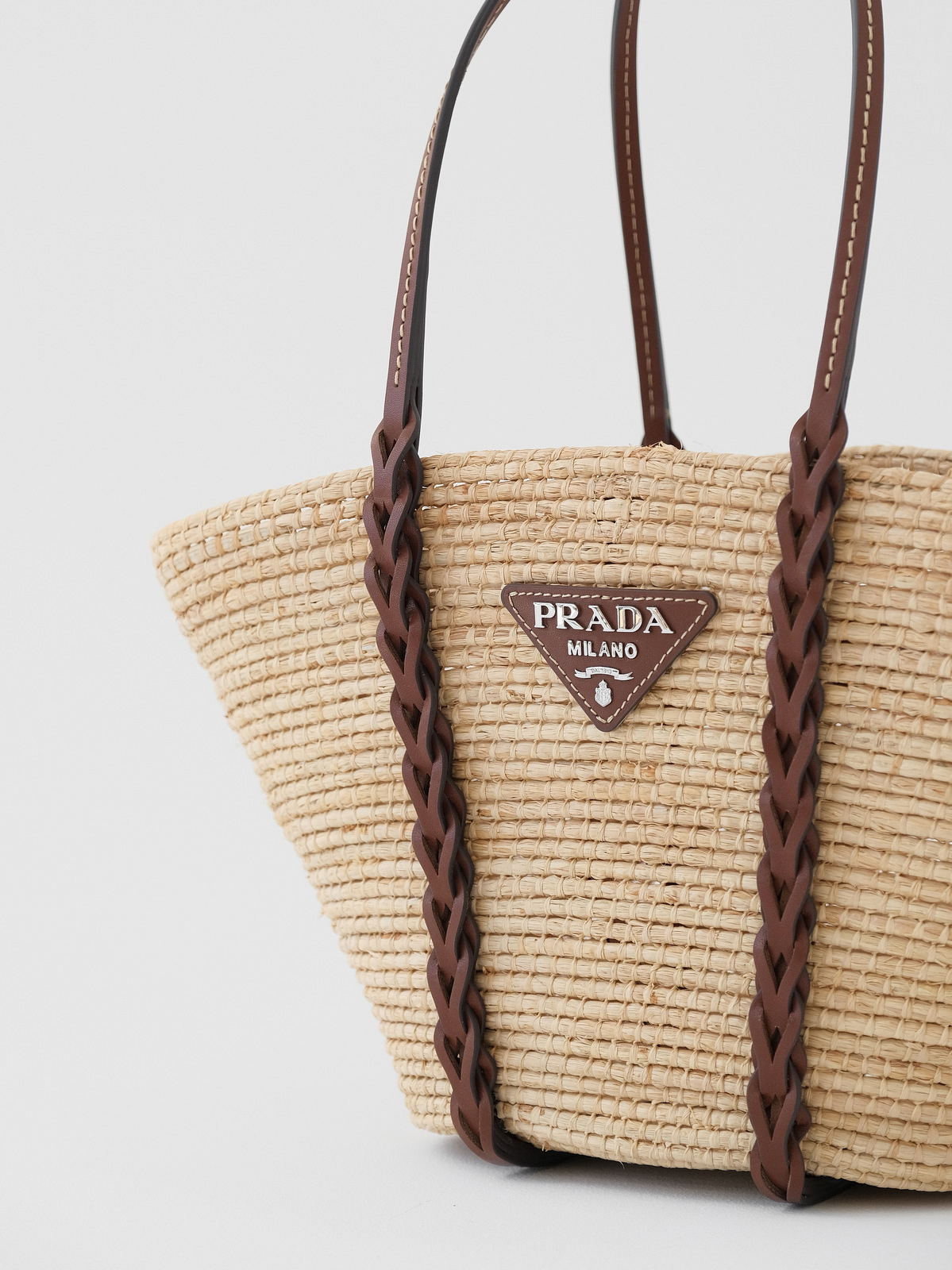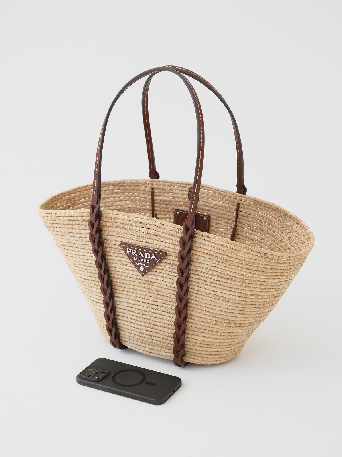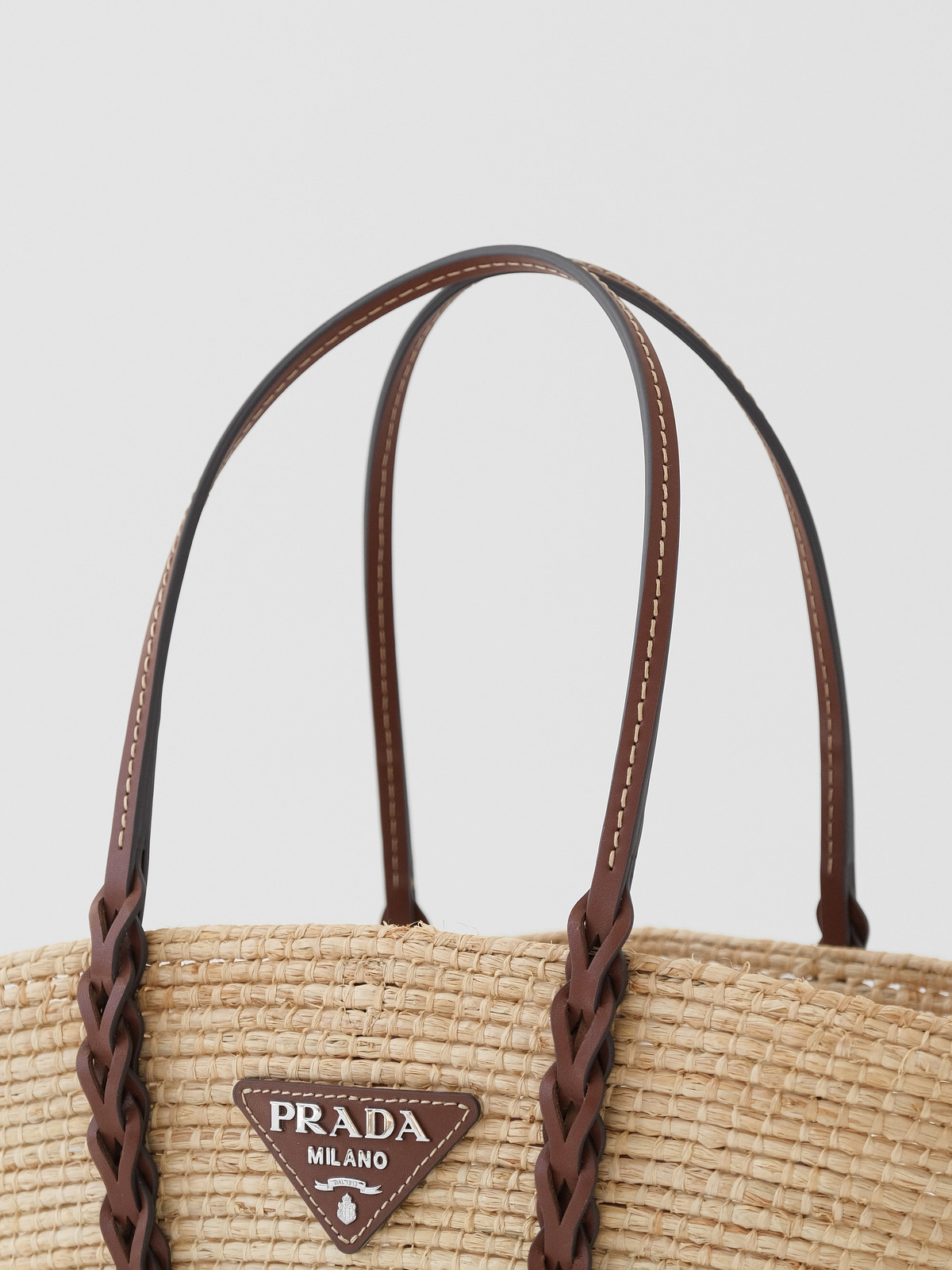 BT348-PRADA普拉达 三角形烫印徽标 稻草柳条拼皮革 托特包Tote包购物袋单肩手提包 原色(RG*MM)