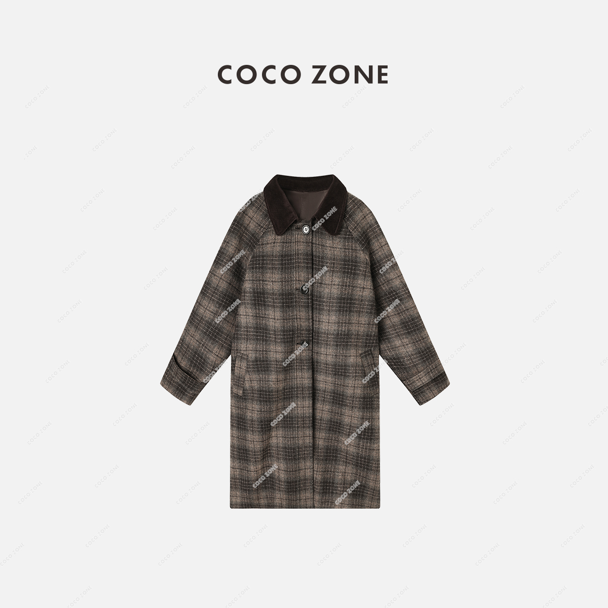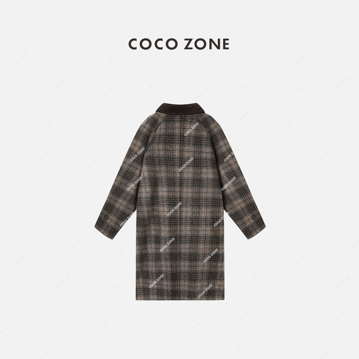 COCO ZONE法式复古格纹灯芯绒翻领中长款毛呢外套23C19845