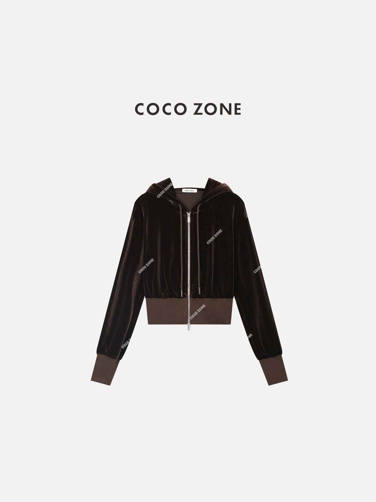 COCO ZONE 咖色丝绒短款连帽系绳外套袖口下摆设计23C19190
