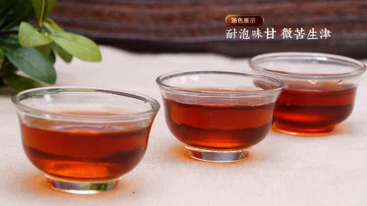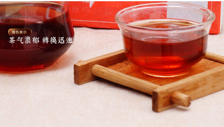 鉴别一款普洱生熟茶好坏有 一步非常关键,茶品优质者茶汤非常通透,劣质普洱茶黑不见底,而且里面杂质,辟如茶渣非常多,此款茶为上上之品,茶汤自然非常通透,因为在生产过程当中茶 厂使用静电技术将茶叶里面原本的杂质全部去除,稍微有一点碎的叶片均弃之,所以,您收到的茶品均为非常干净,茶汤红浓透亮,看上去犹如红酒般漂亮,迷人。