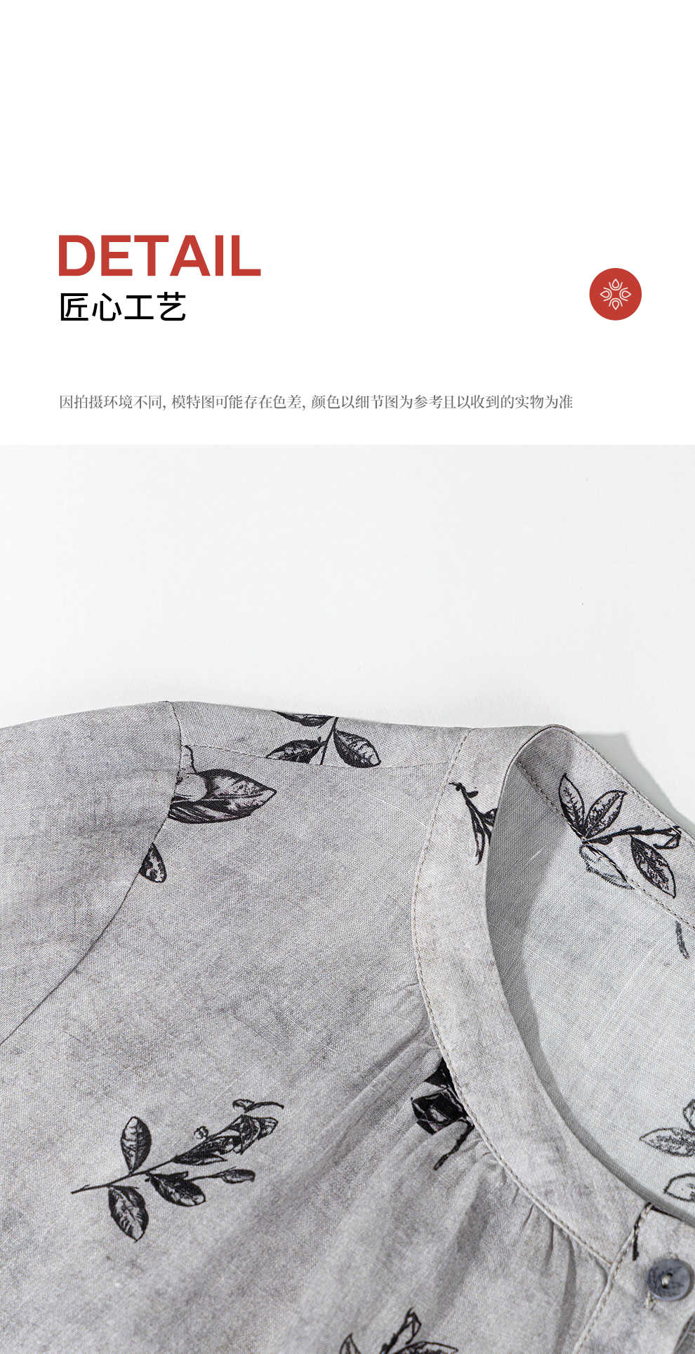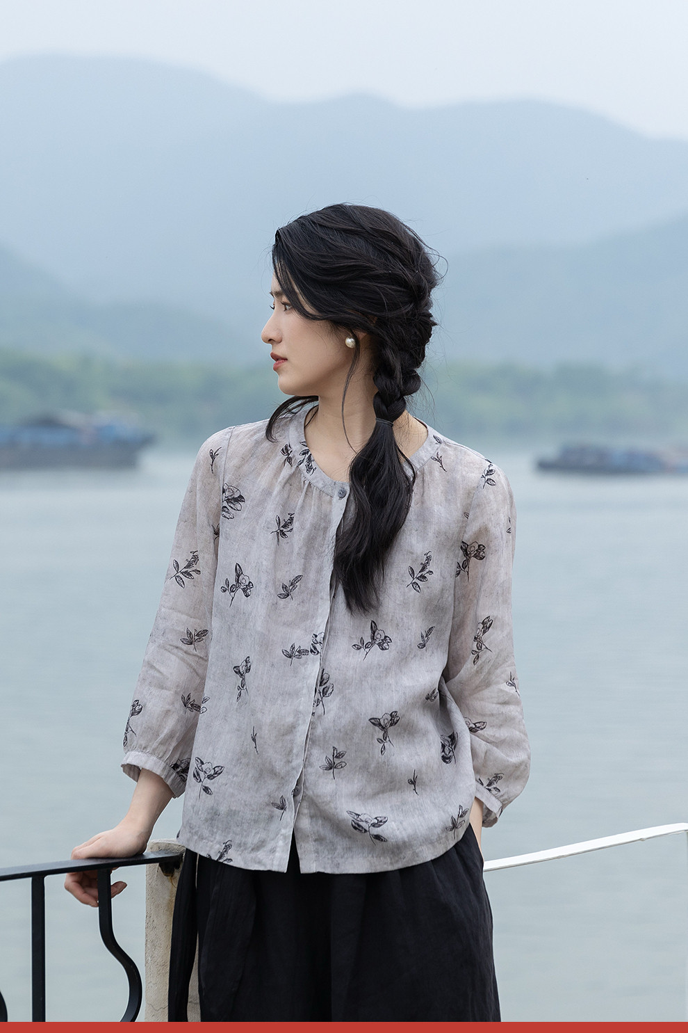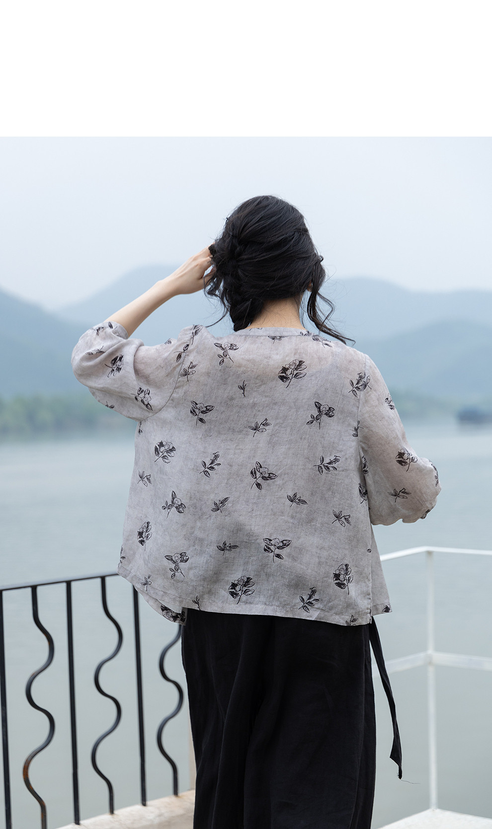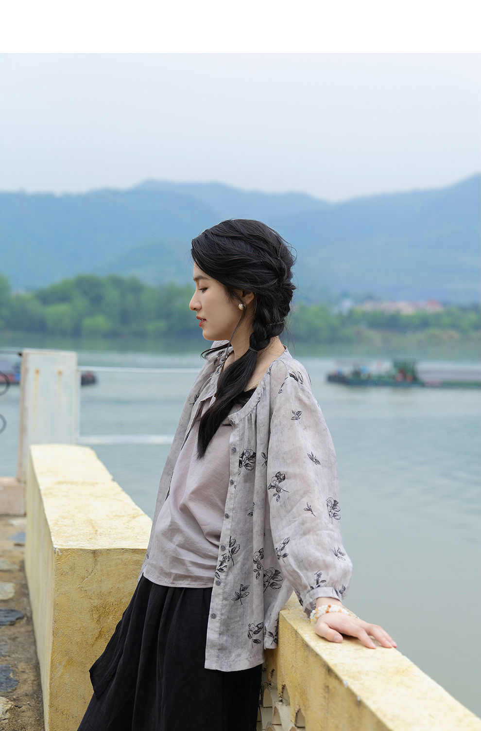 绽放旅行女装346朵/原创印花苎麻天丝正常肩七分袖开襟衬衫女开衫