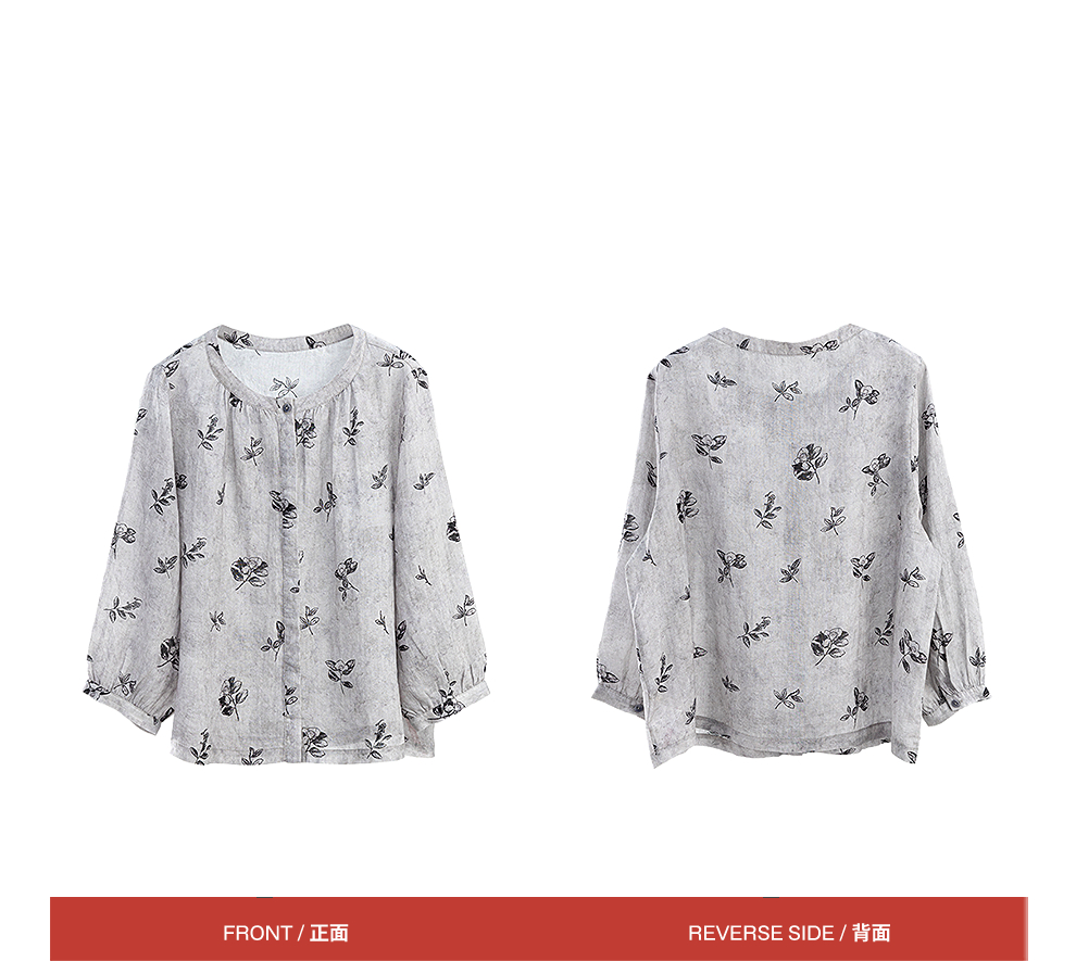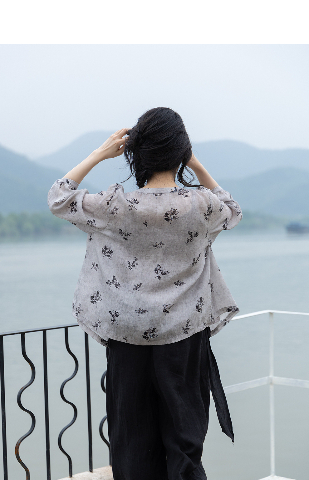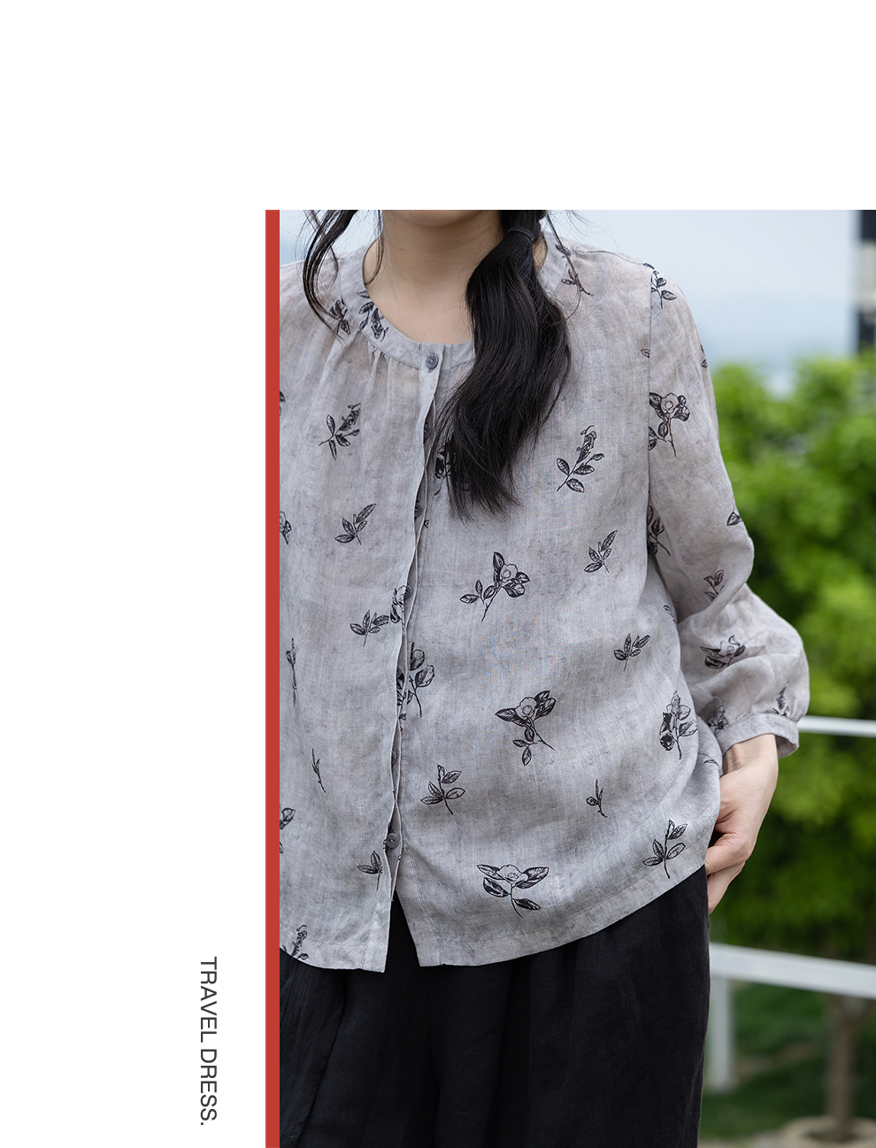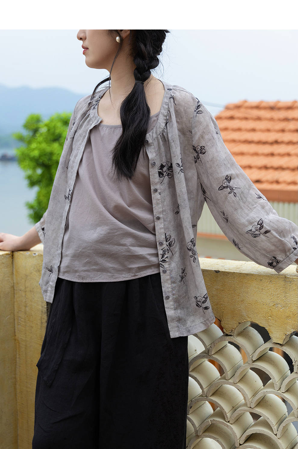 绽放旅行女装346朵/原创印花苎麻天丝正常肩七分袖开襟衬衫女开衫