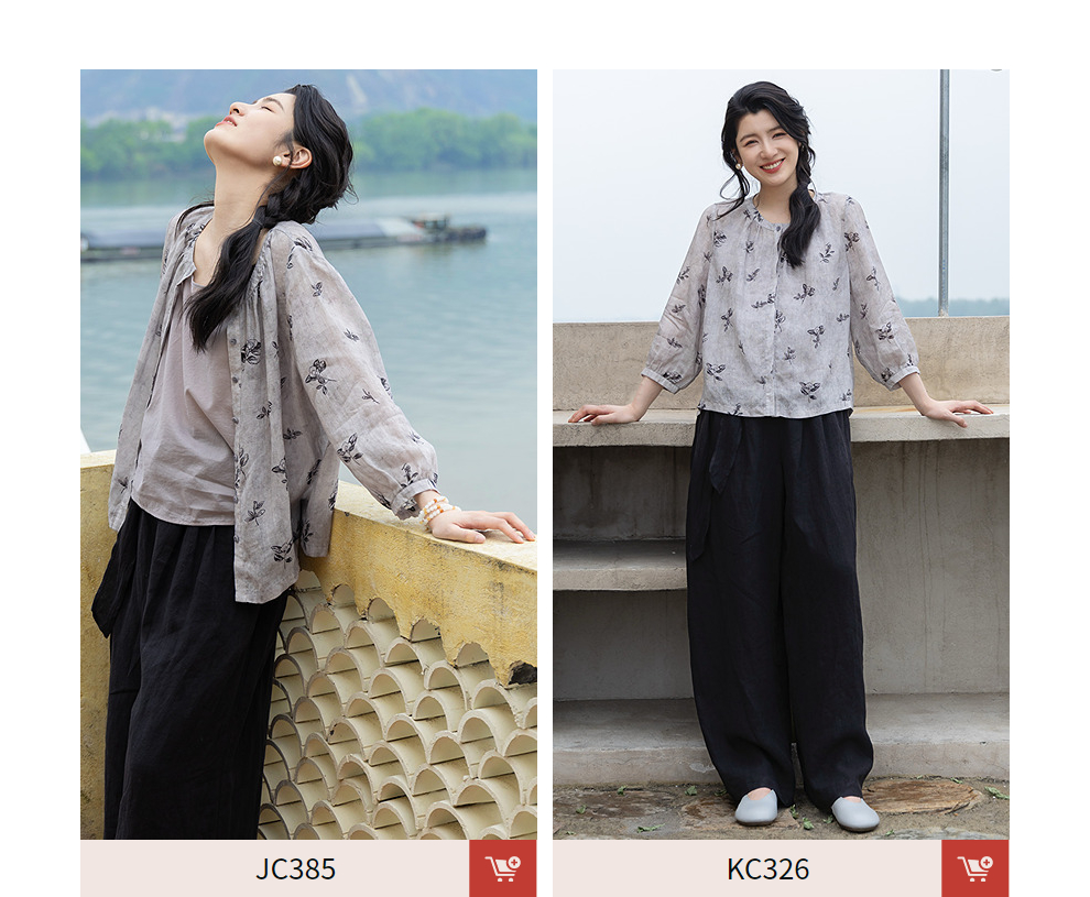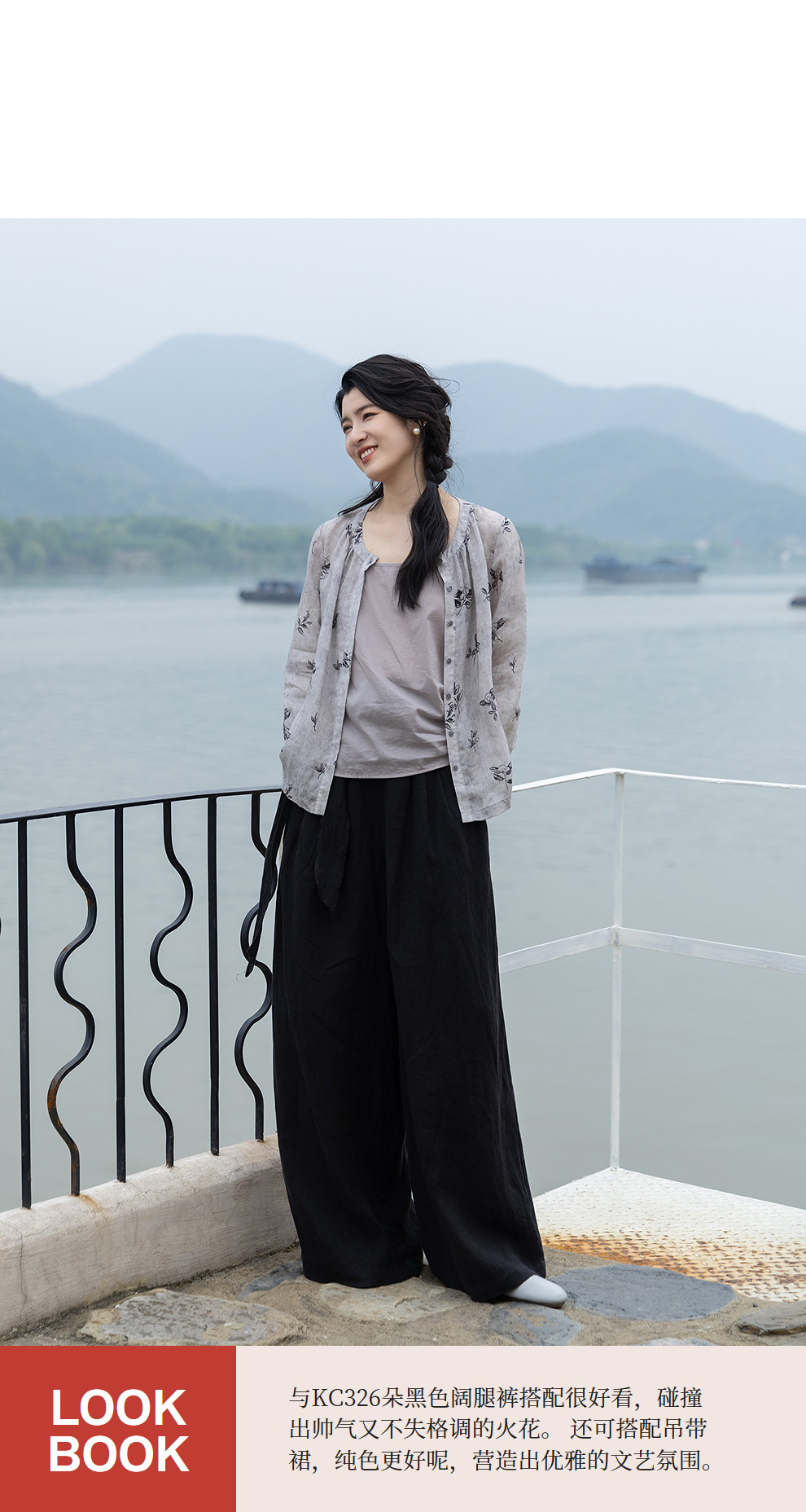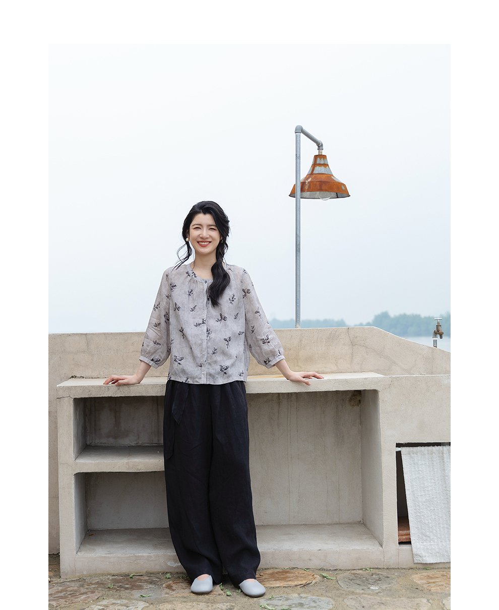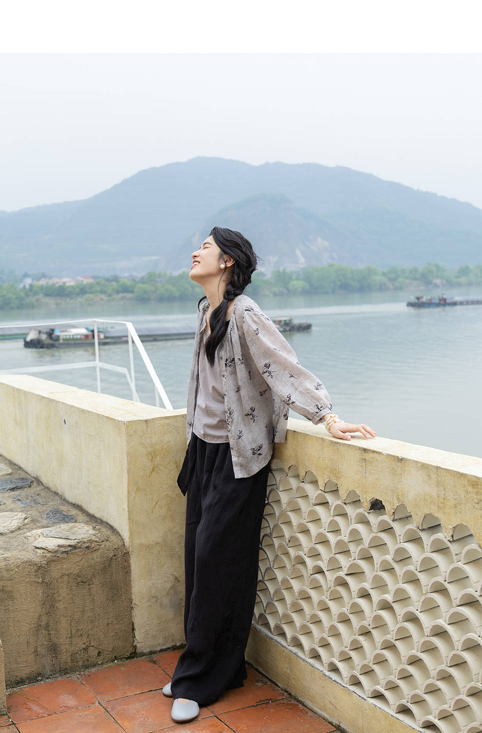 绽放旅行女装346朵/原创印花苎麻天丝正常肩七分袖开襟衬衫女开衫