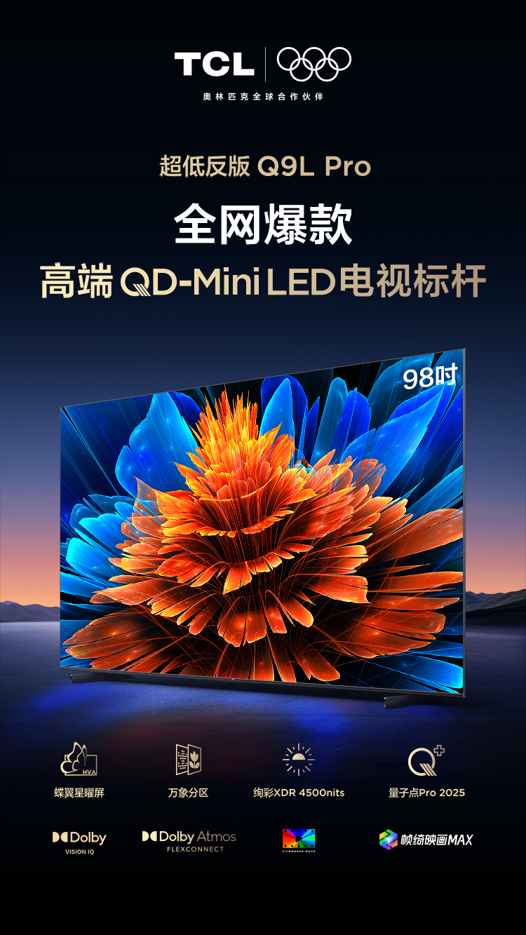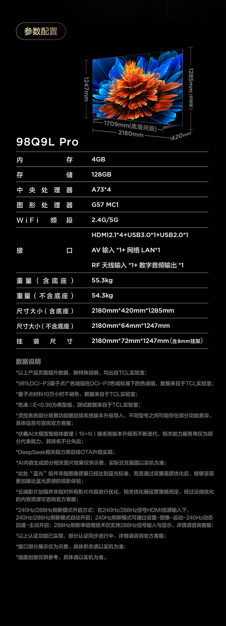 TCL电视 98Q9L Pro 98英寸 QD-Mini LED 蝶翼星曜屏 万象分区 绚彩XDR 4500nits 超薄电视