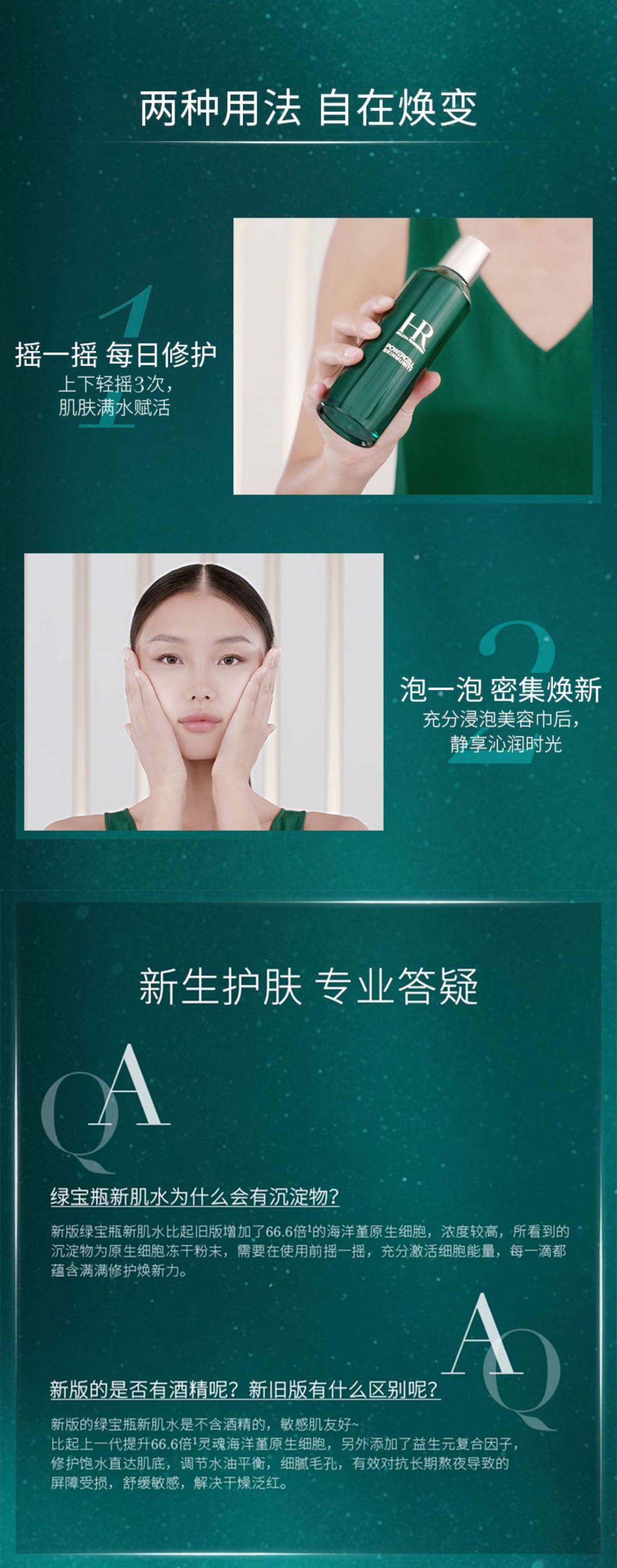 | HR赫莲娜绿宝瓶新肌水,高功效的贵妇精华水, 主打深层补水和修护受损,是可直达肌底的一款精华水~ 蓄能新肌水·新new版熟龄肌必备的精华水 满满一整瓶鲜活亢氧化能量,深度滋养水润 从此肌活肌肤新生程序 用前摇一摇,底下有海洋堇提取精华的沉淀,维稳肌肤,修护屏障,改善泛红统统搞定。 主打成分:海茴香愈伤组织提取物-舒缓敏感,修护肌肤 透明质酸+VE-深层补水,渗透肌肤 益生元复合因子-镇静舒缓,加速褪红 0酒精温和配方,不刺激,油皮混油皮都很使用~ - 产品质地:水状质地,清爽好吸收,有淡淡的中草药香味。。 使用方法:使用前摇一摇,激活活性成分。 (产品内有沉淀物,为原生细胞冻干粉末,使用前摇一摇,充分激活细胞能量。) 混油皮:全脸正常使用,T区湿敷片打圈,脸颊做提升; 油皮:全脸正常打圈使用,不宜过量,适量吸收即可; 干皮:提升使用,可以多湿敷; 敏感肌肤:T区提升,多湿敷,脸颊适量湿敷。 (敏感肌肤使用前可以进行耳后测试) 发货时效:72小时(节假日顺延) 发货地:广东 备案文号:国妆网备进字(沪)2020004197 |