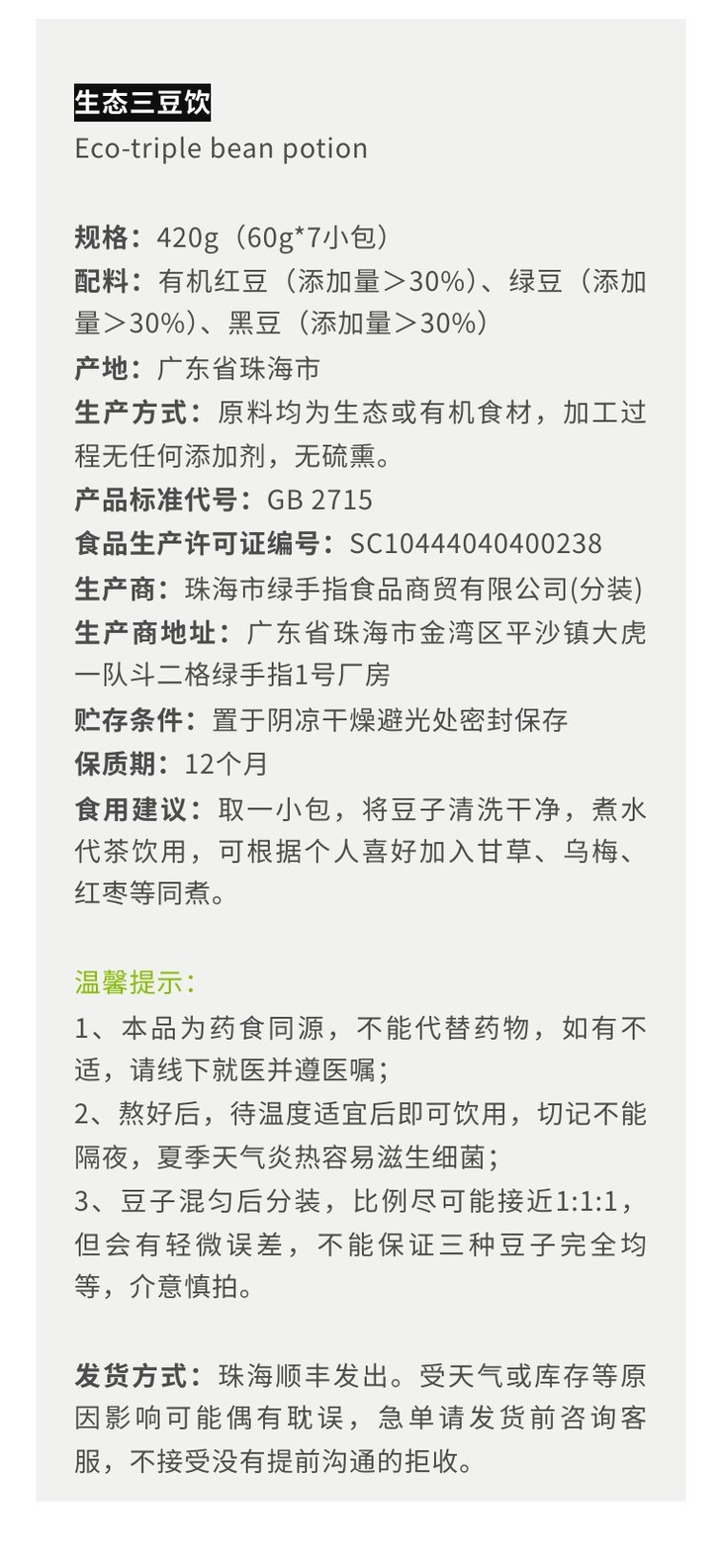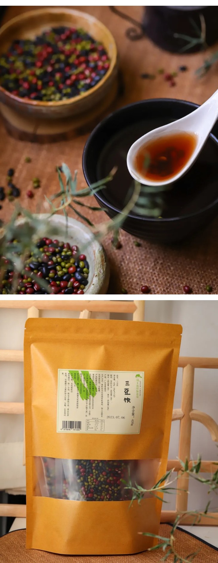 三豆饮的原料皆来源于生态农友的生态或有机食材,红豆来自在东北平原进行有机种植的地海农业,绿豆和黑豆来自在陕西做生态种植的新农人张嘉祯,三豆饮为绿家自有加工厂进行加工,过程无添加,无硫熏。