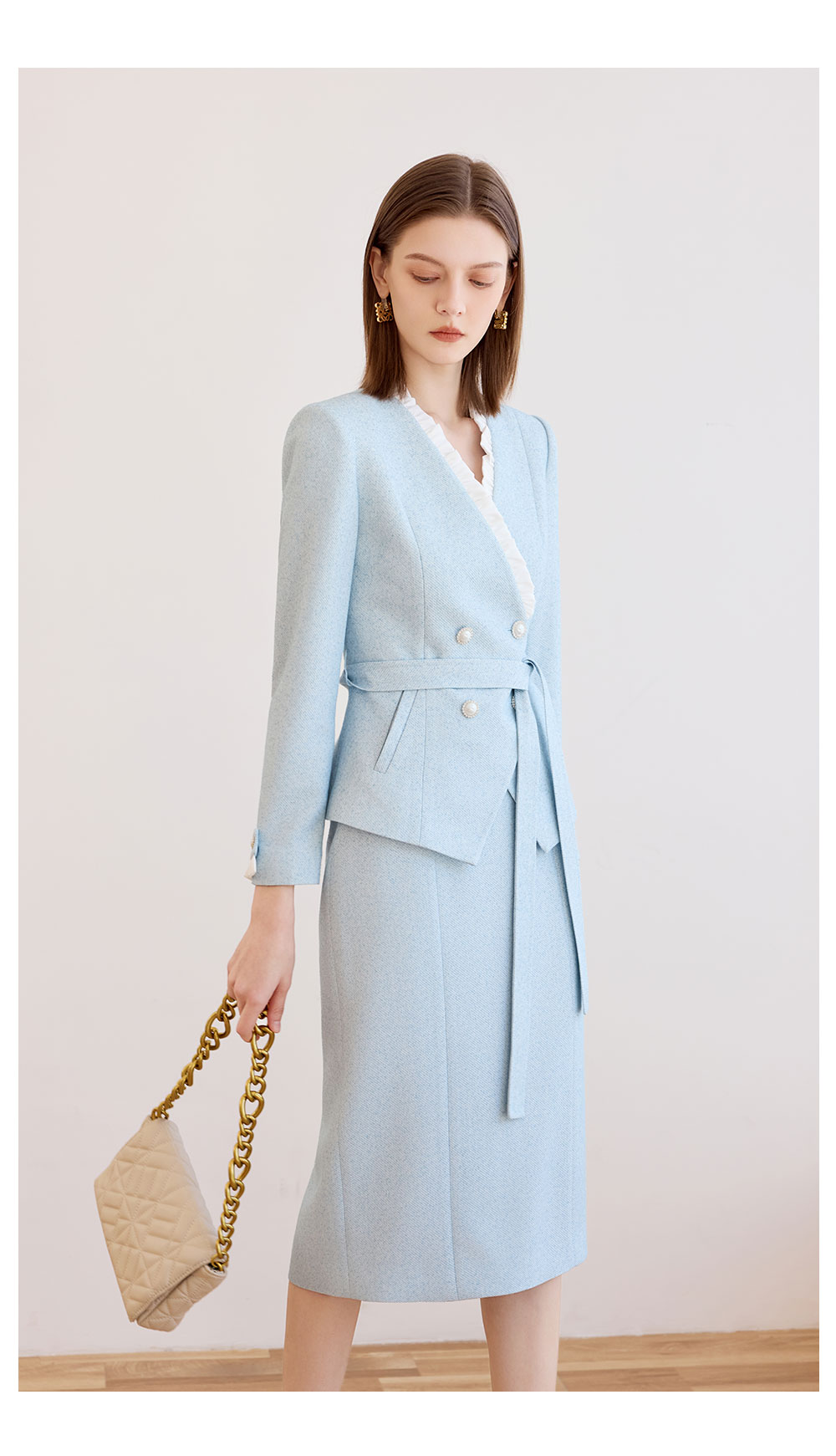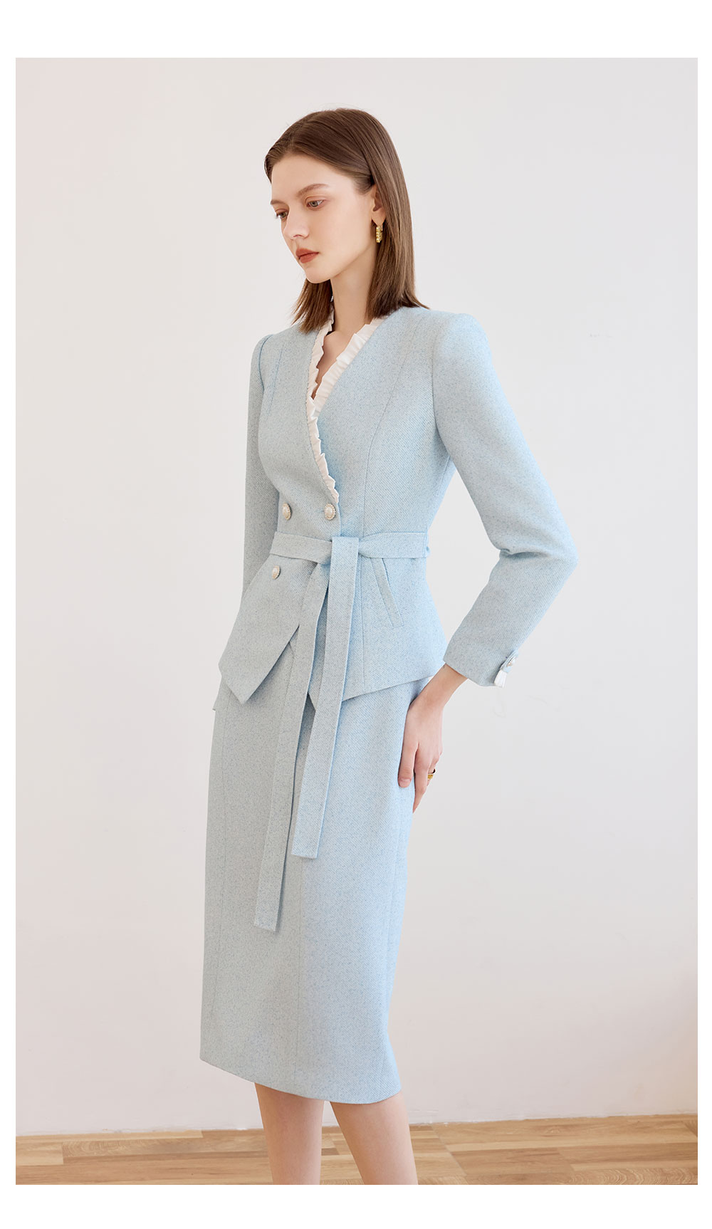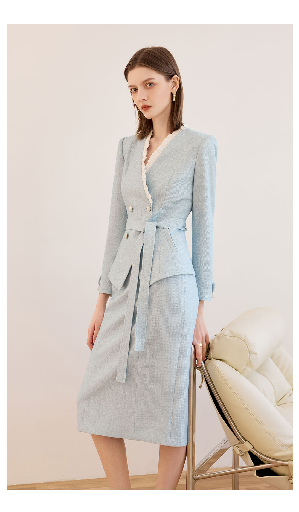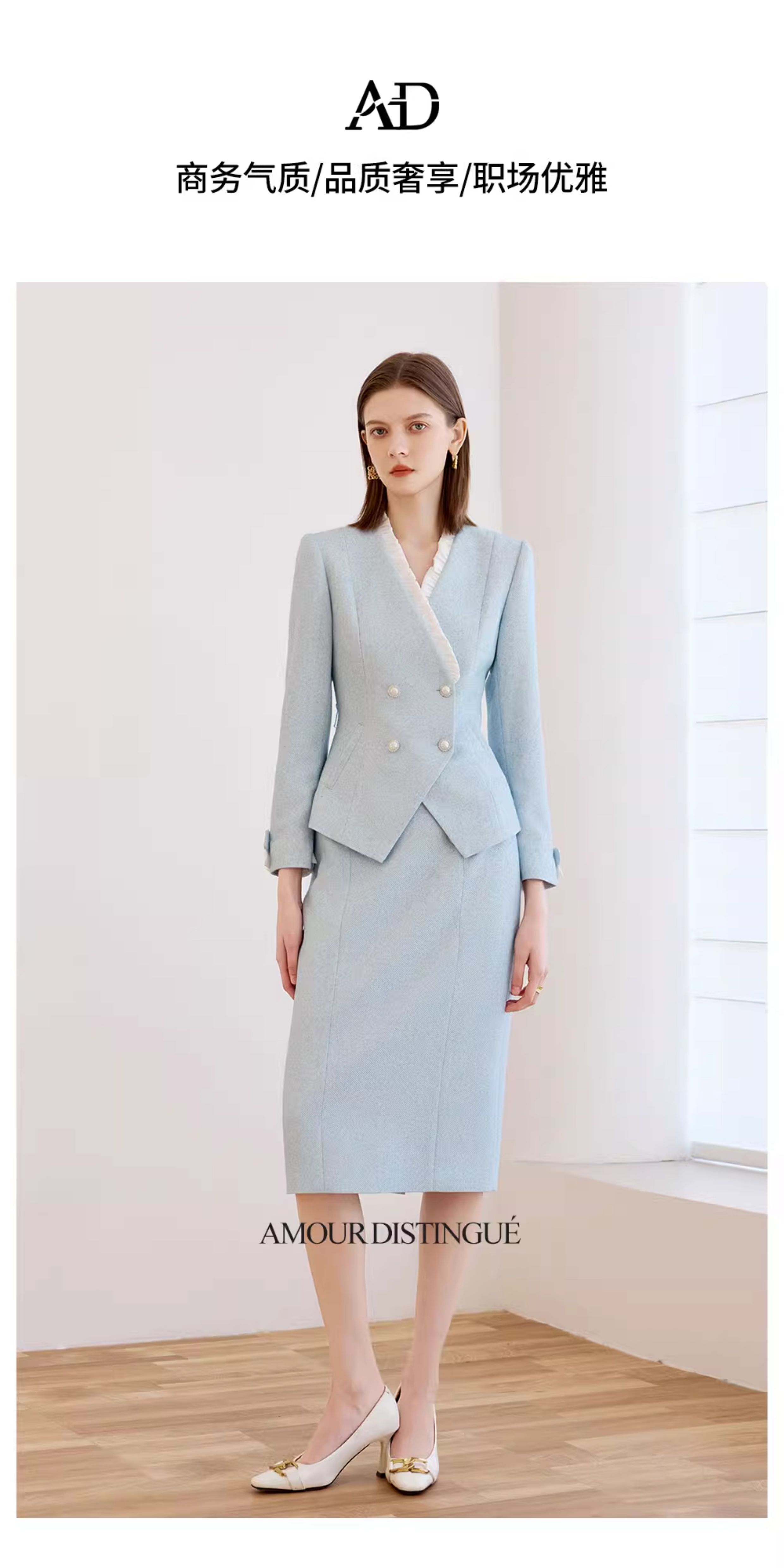 AD时尚气质套装女秋冬高级感蓝色木耳边长袖外套上班通勤两件套