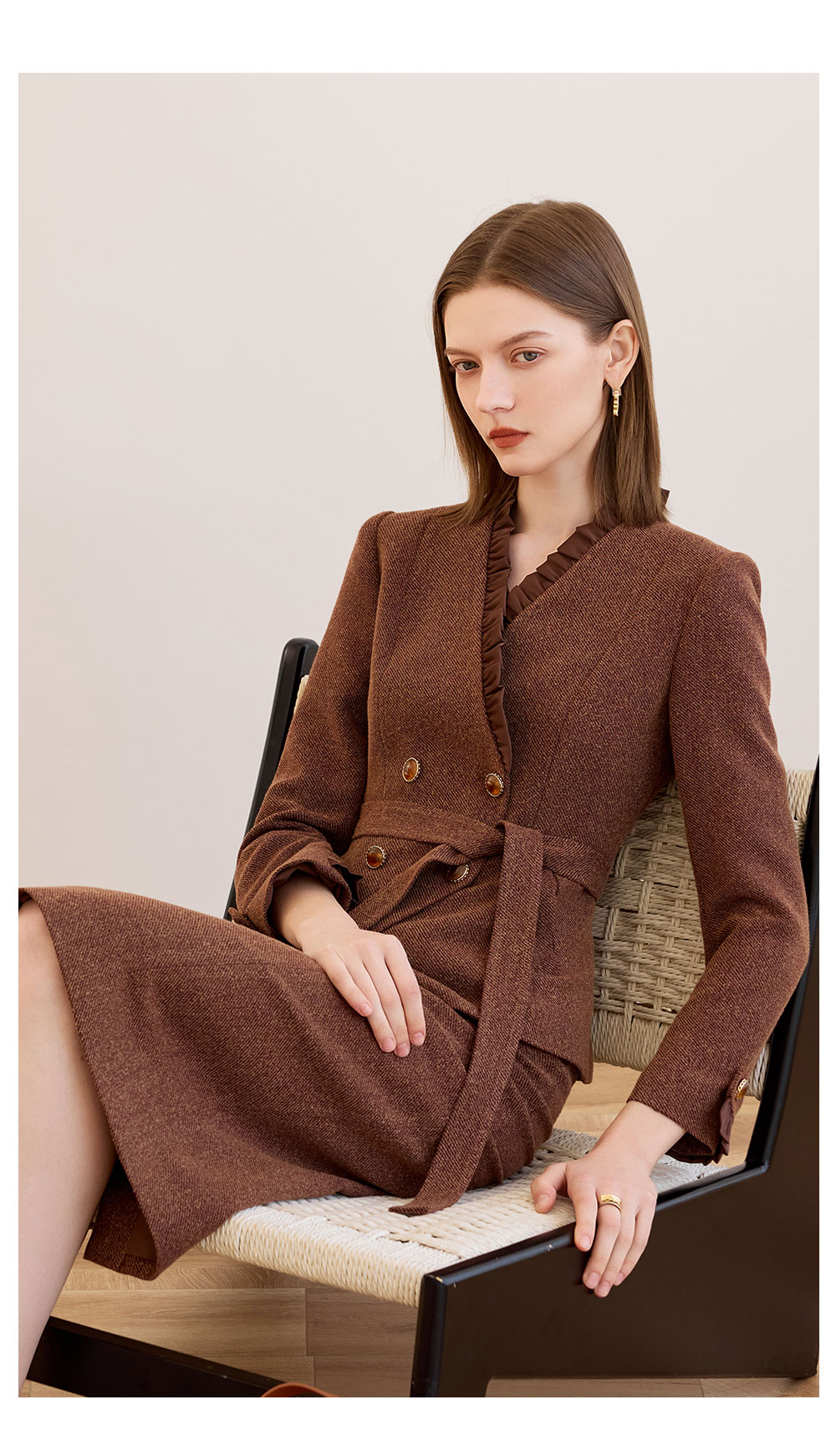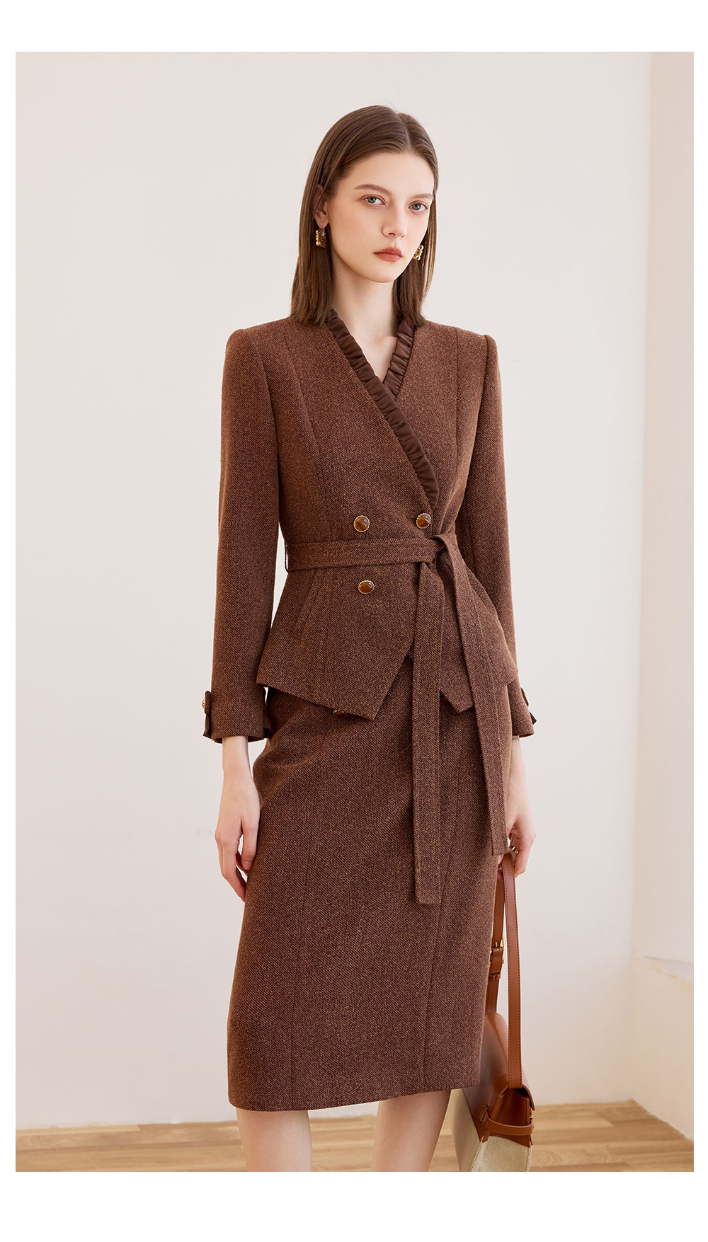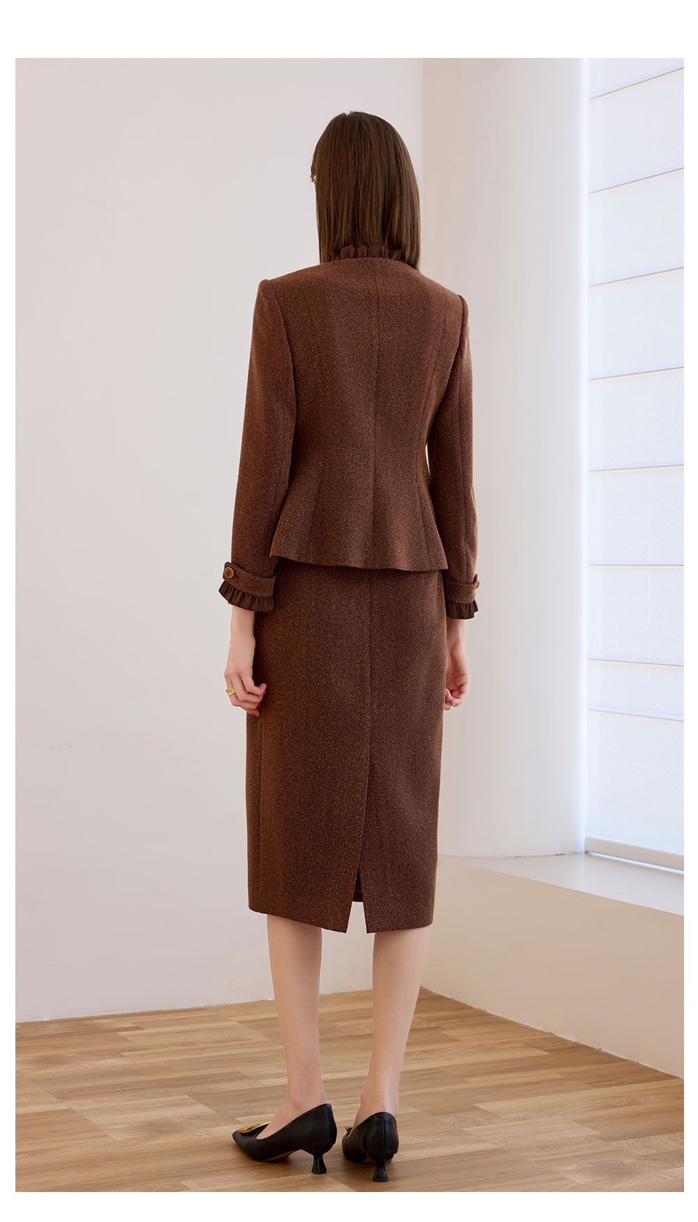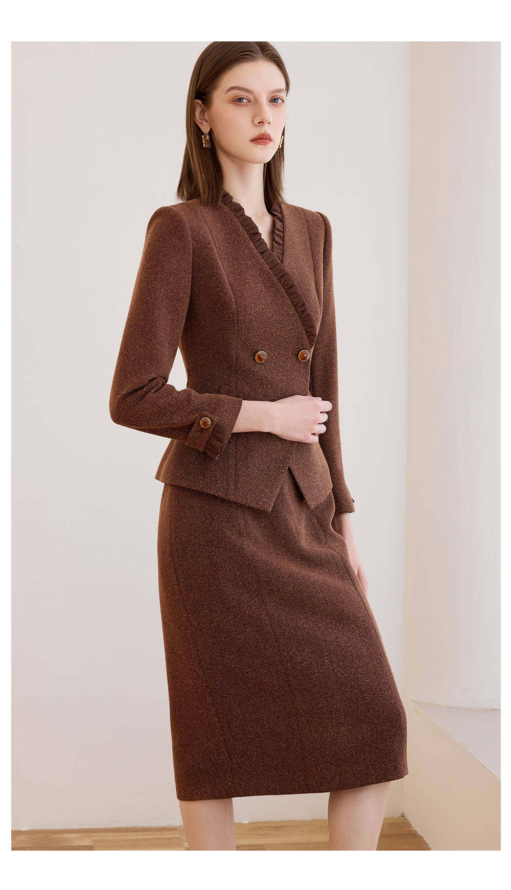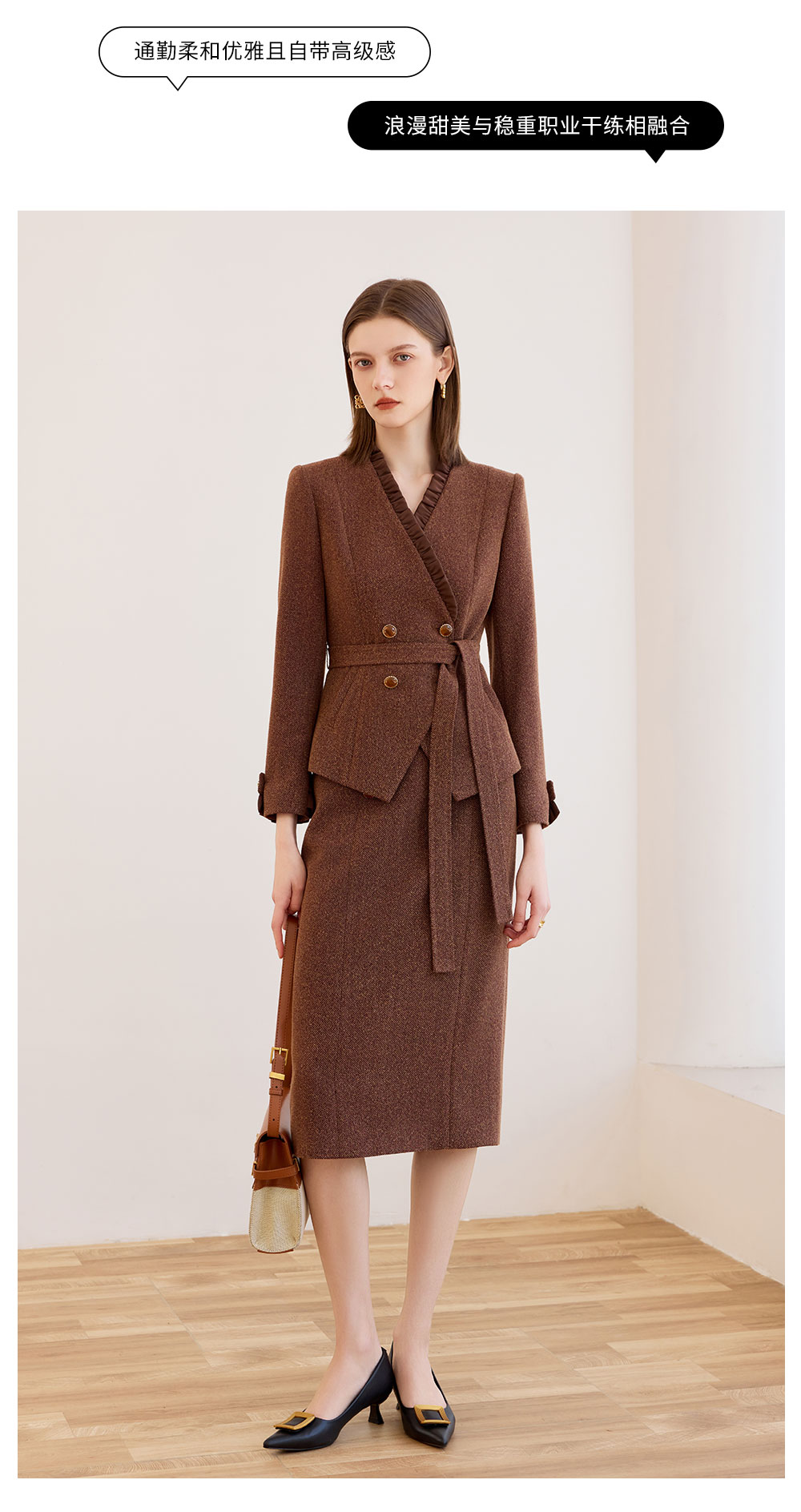 AD时尚气质套装女秋冬高级感蓝色木耳边长袖外套上班通勤两件套
