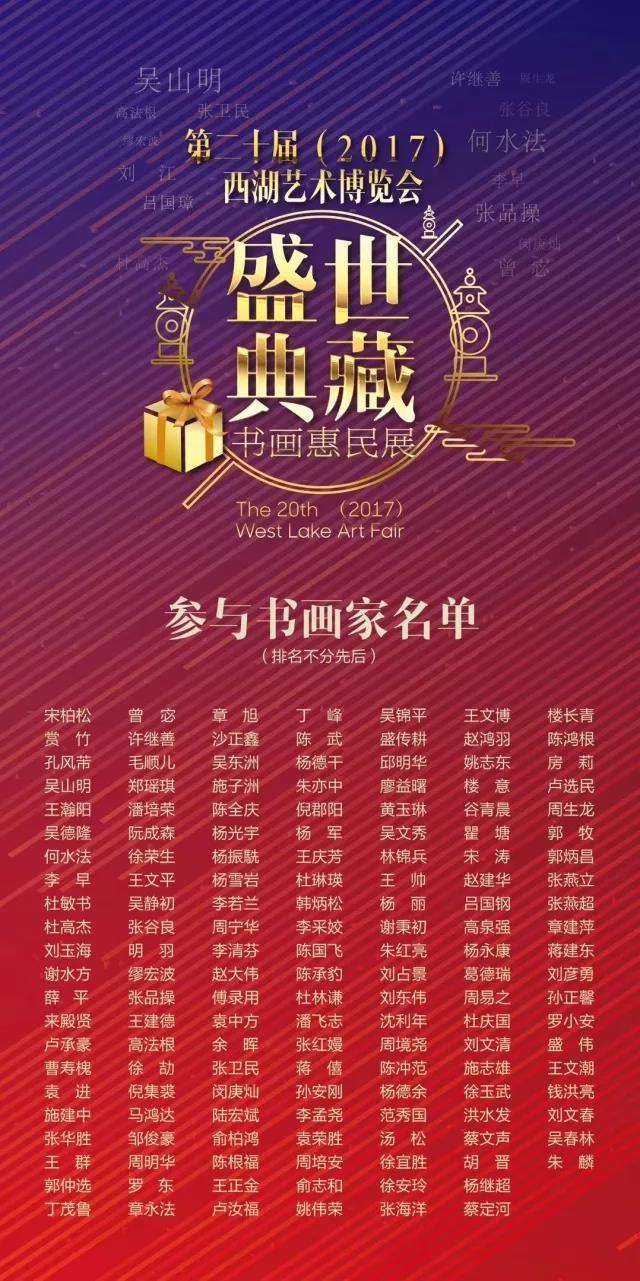 西湖艺术博览会“书画惠民”活动特别邀约吴山民、何水法、闵庚灿、杜高杰、宋松柏、吴静初、曹寿怀、高法根、倪郡阳等在内的、国内外百位以上书画艺术家共同参与创作,作品将以最高端的规格,通过博彩书画惠民大礼包的形式,让你也可以拥有名家书画作品。