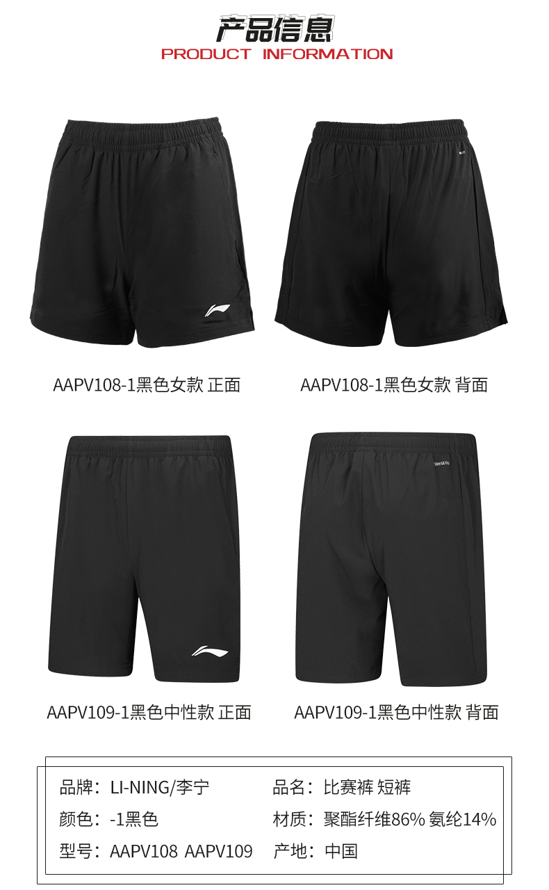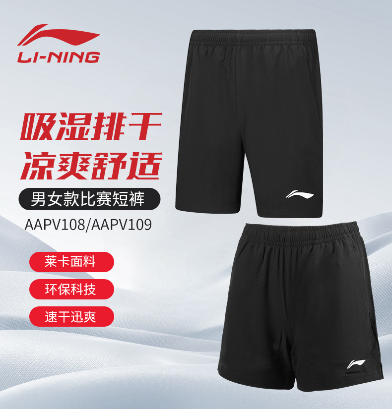 李宁新款羽毛球服短裤AAPV108 AAPV109男女款比赛舒适羽毛球短裙短裤