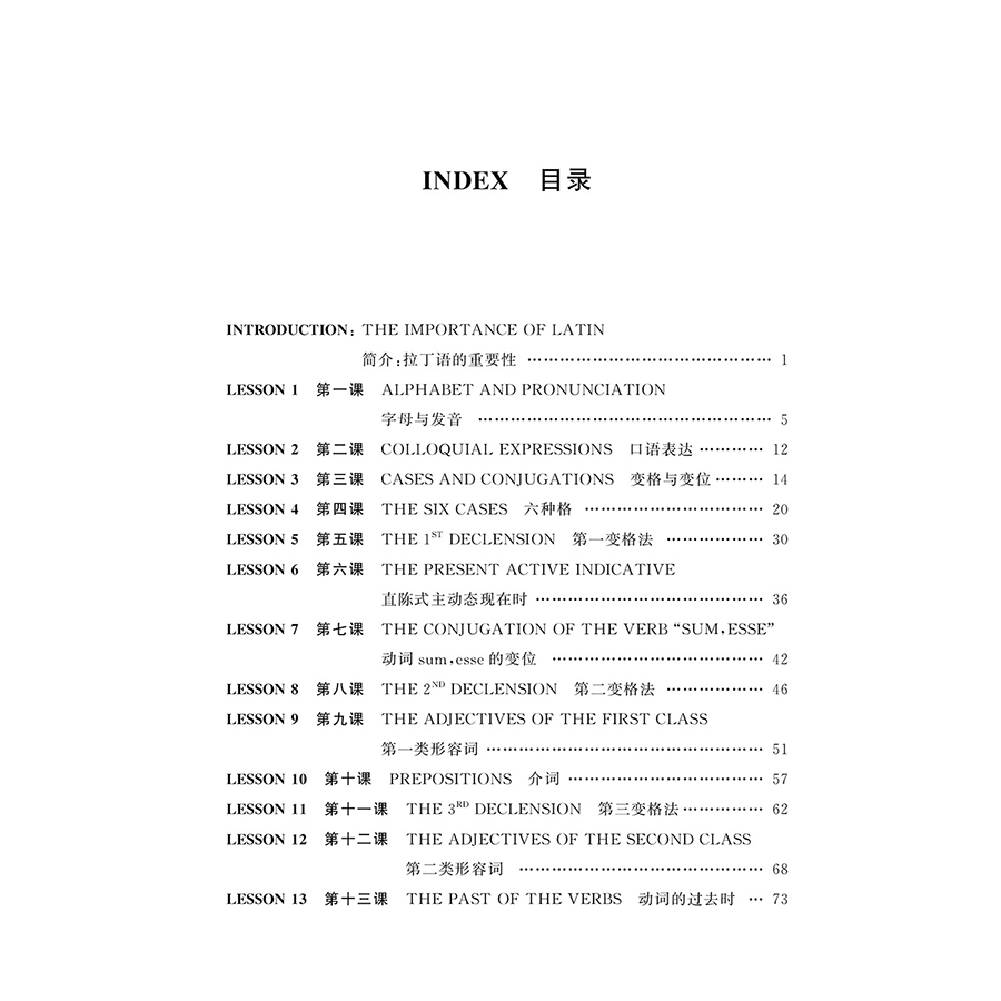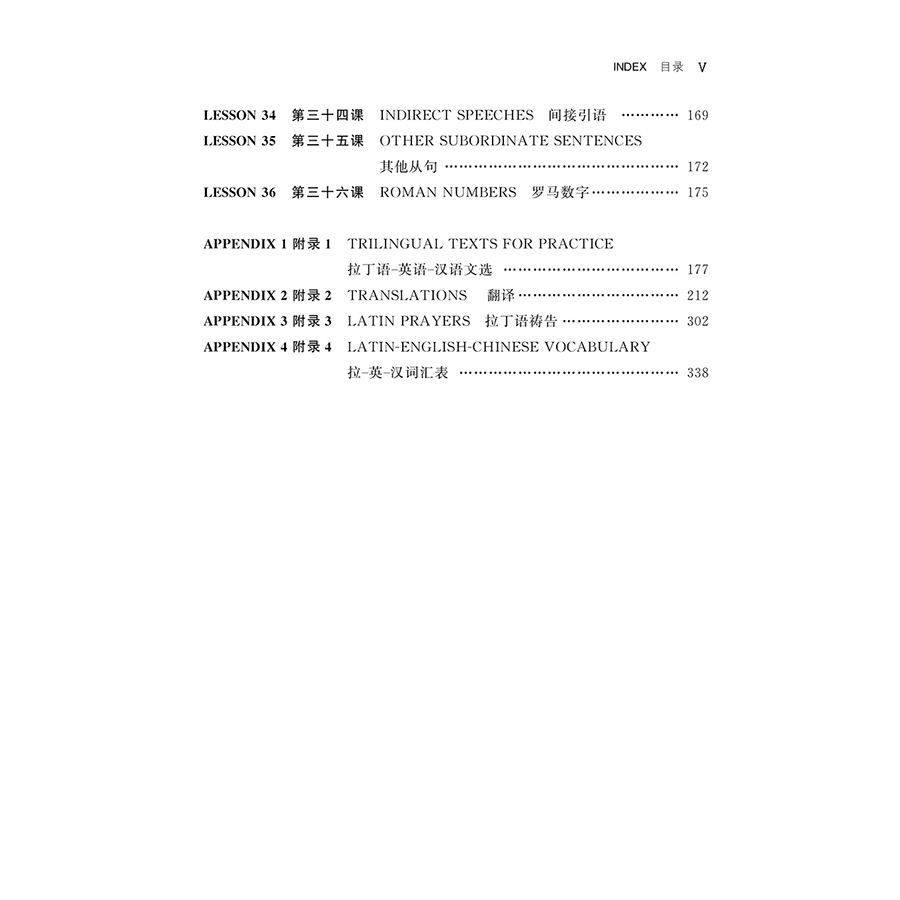附录包含每课练习、原典阅读部分的英汉双语译文,拉丁语文选及其英汉双语译文,拉英汉三语祈祷文,以及拉英汉三语总词汇表。