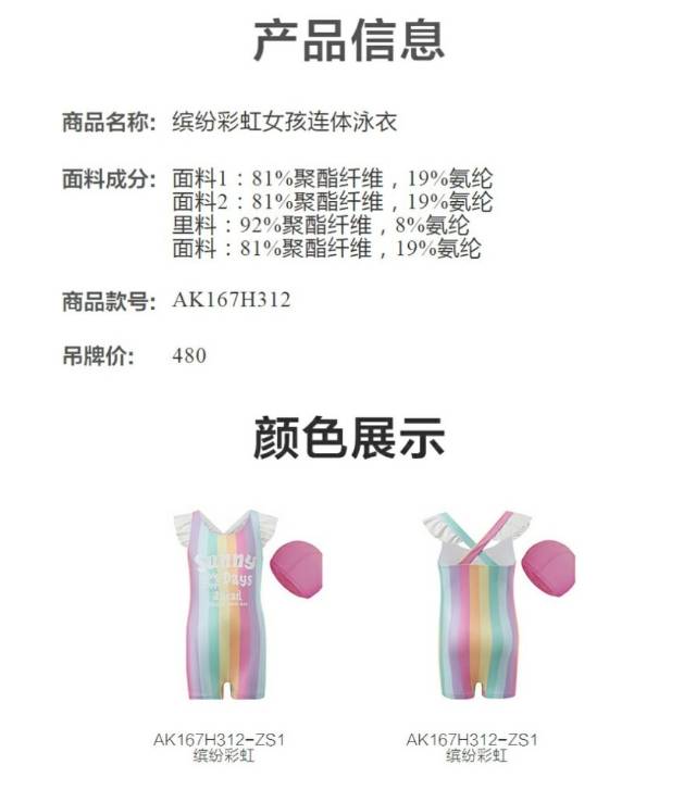 【春上新】8楼爱慕儿童Aimer Kids女孩2件装-缤纷彩虹连体泳衣AK167H312,吊牌价480元