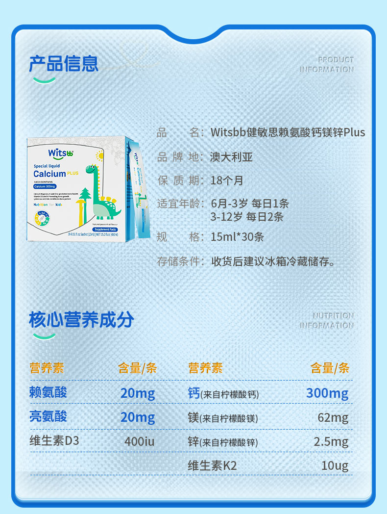 【草莓口味】Witsbb健敏思赖氨酸钙镁锌30条/盒