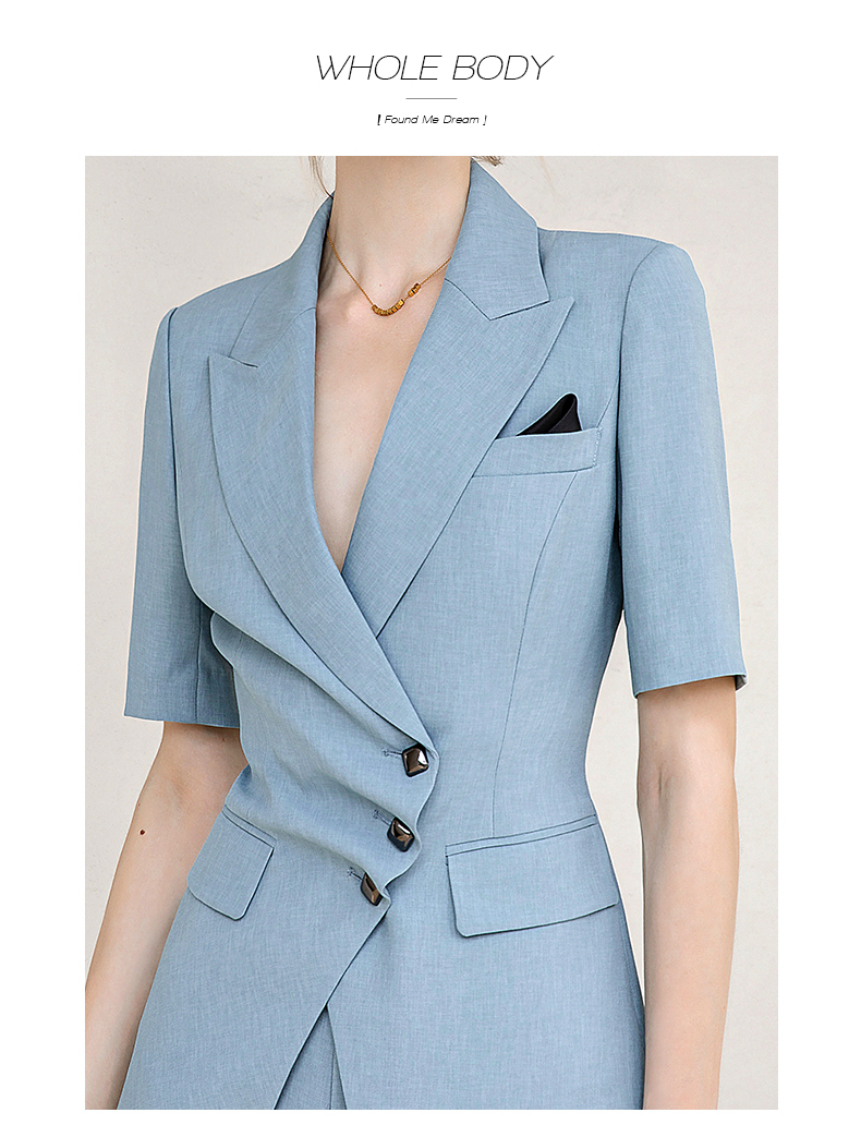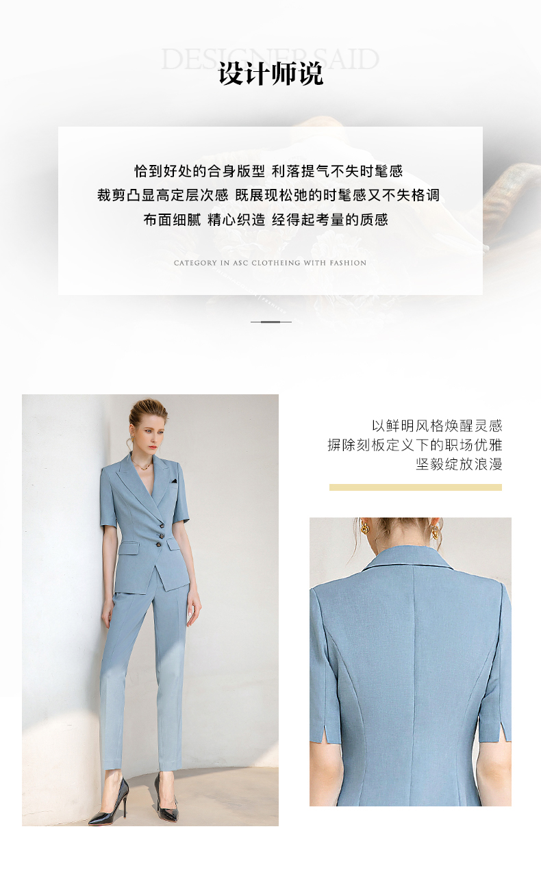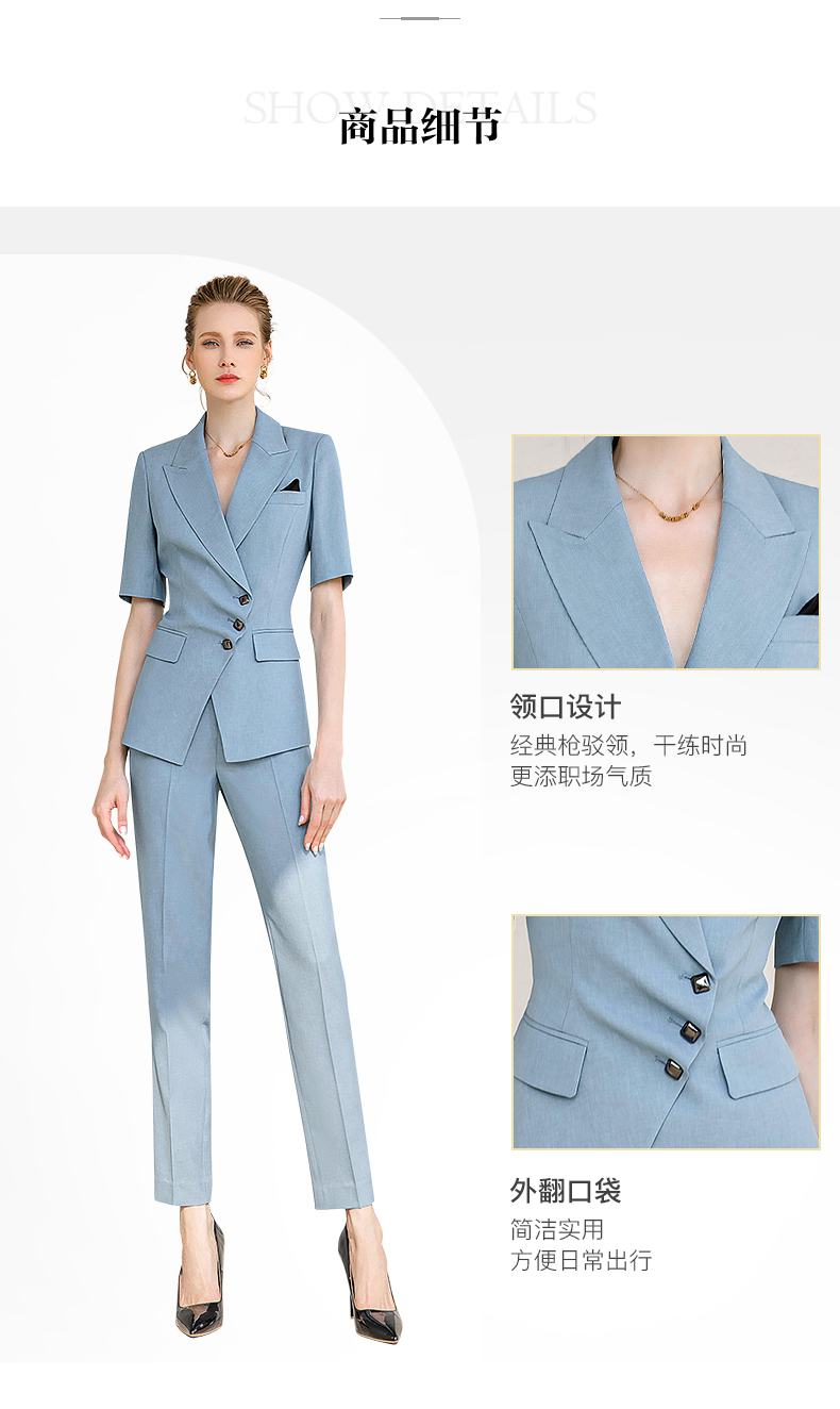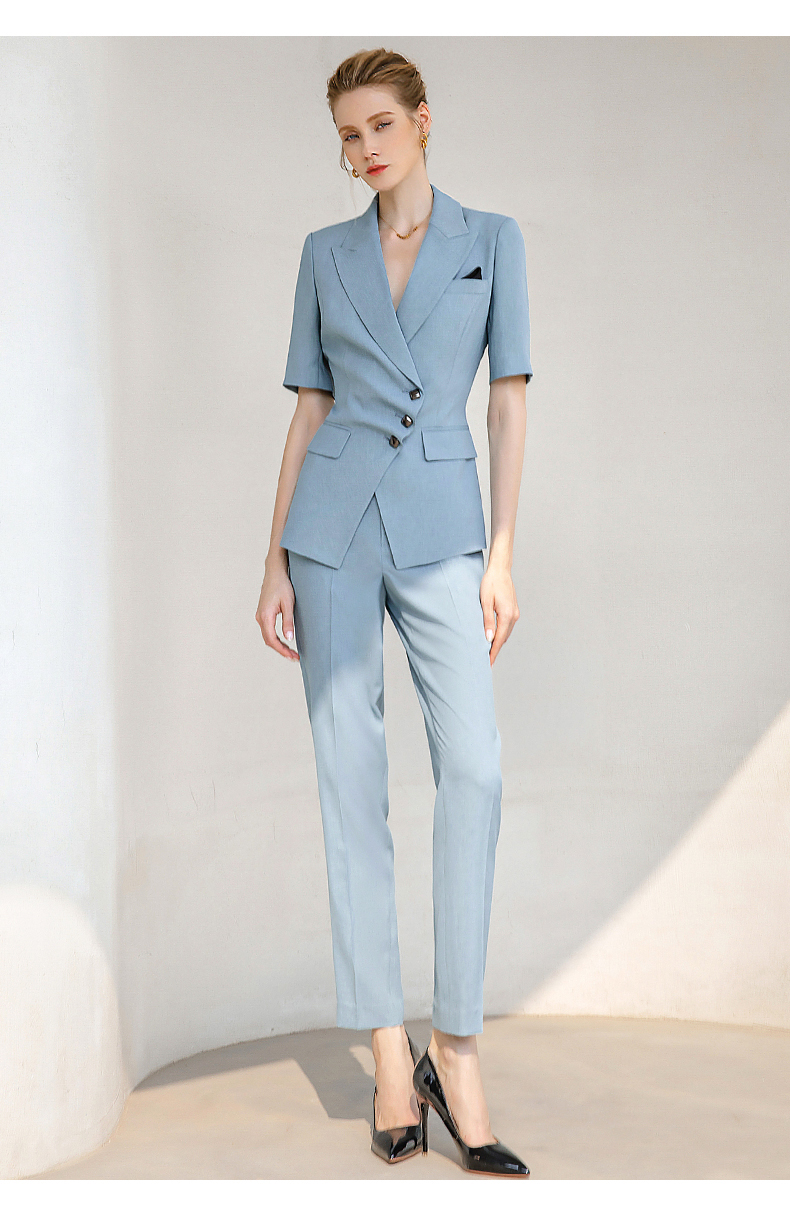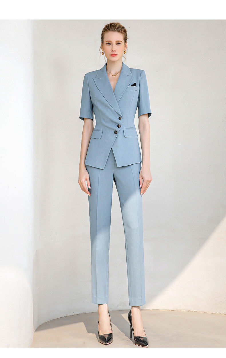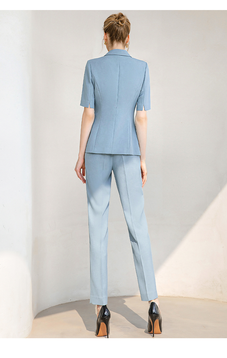蓝色短袖西装小脚裤套装女气质正装职业装工作服夏季时尚西服套裤