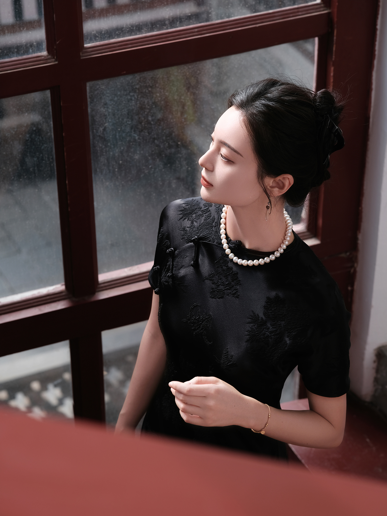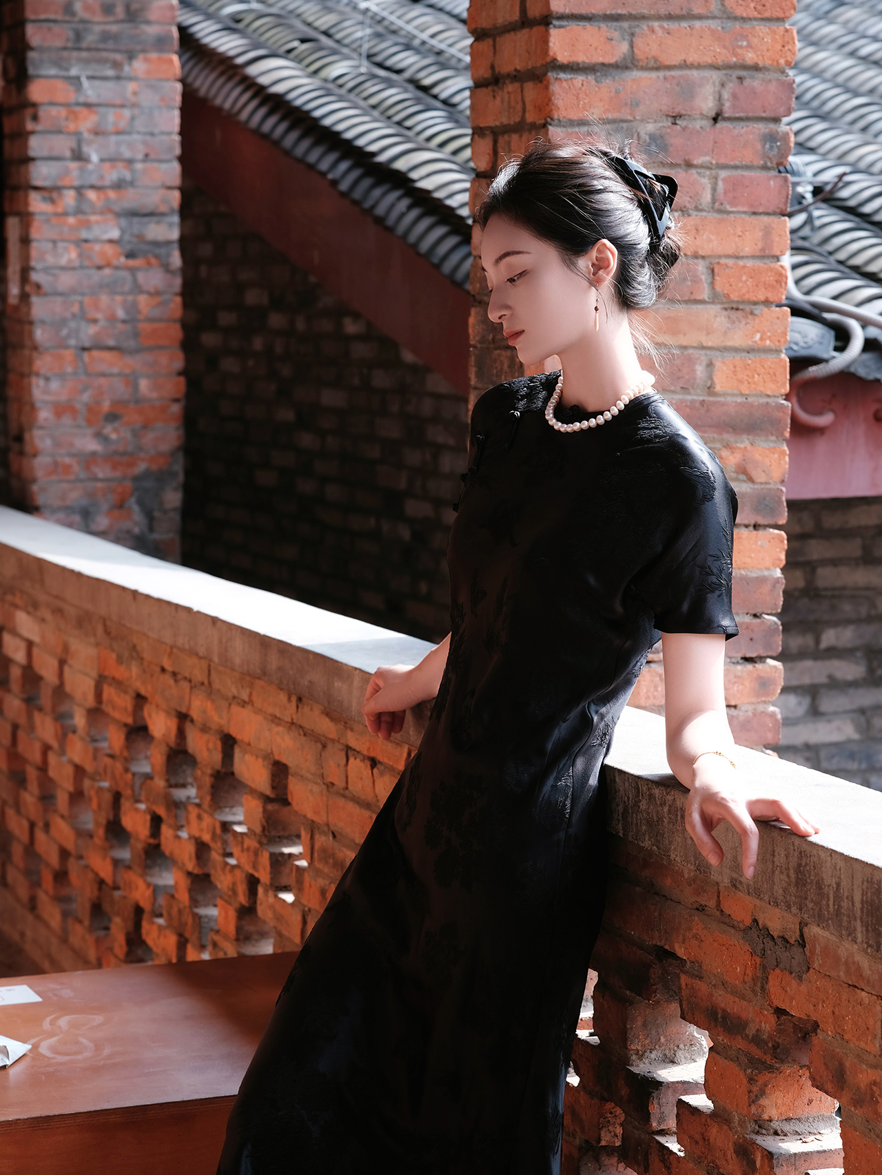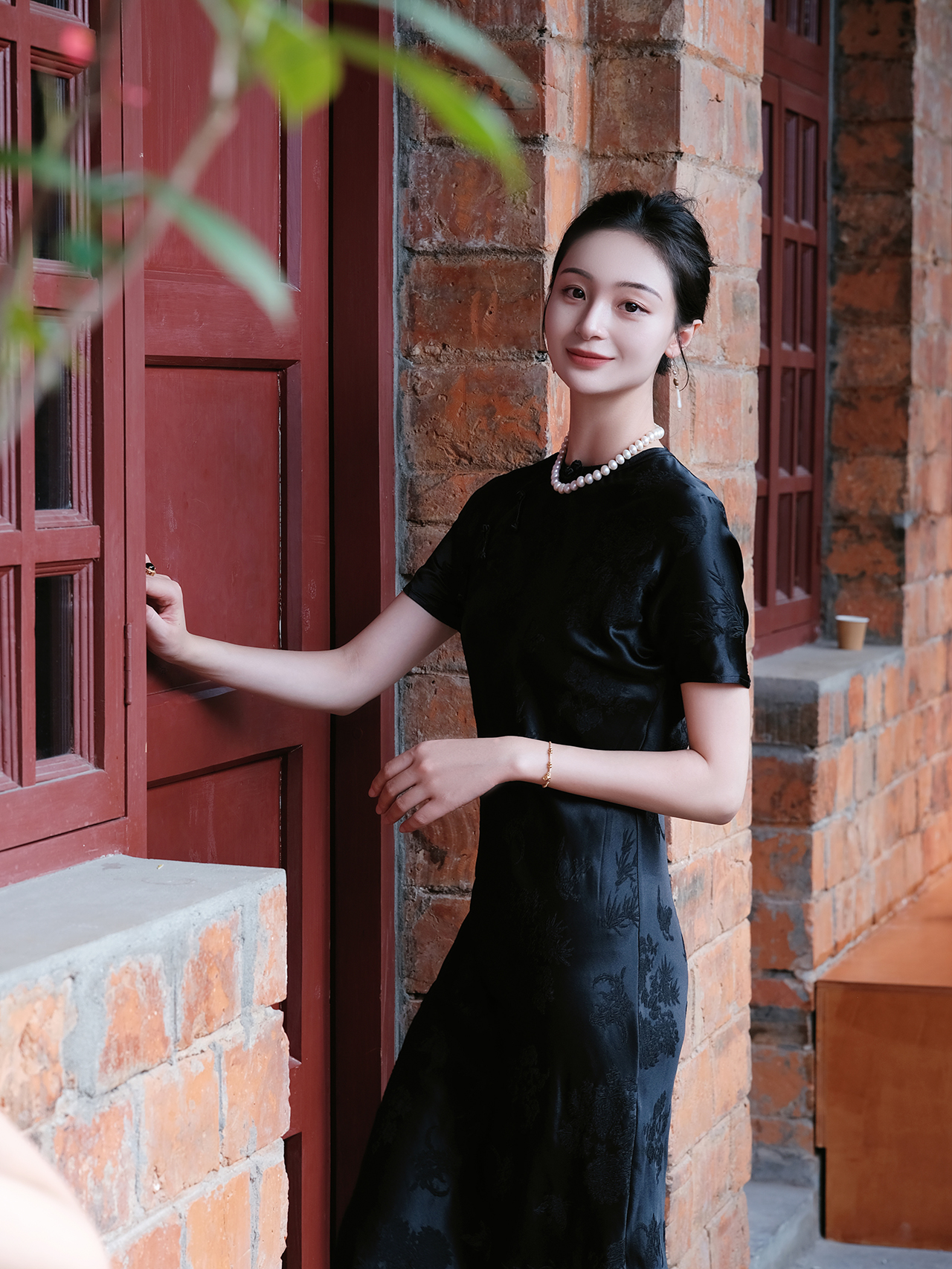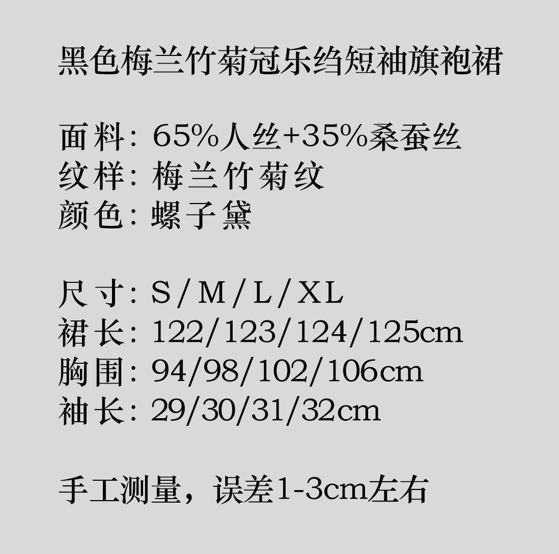 盛唐牡丹 |黑色梅兰竹菊冠乐绉短袖旗袍裙