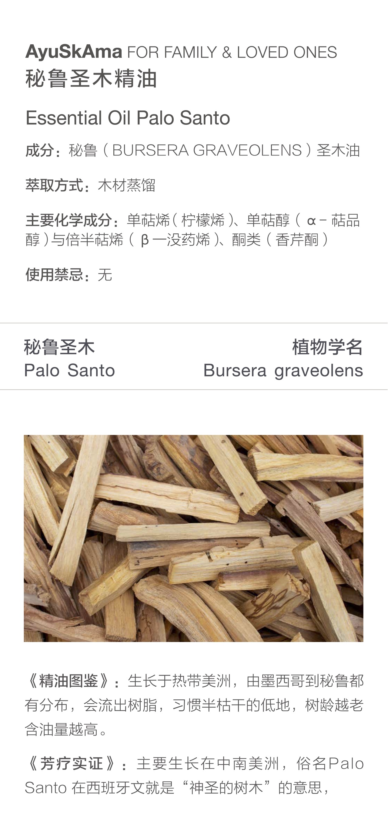秘鲁圣木,主要生长在中南美洲,当地的民俗用法会拿来治疗胃痛与关节炎,而萨满信仰会燃烧其木材,用来净化人或空间的能量与气场,时至今日,当地人仍保留用秘鲁圣木薰香的习惯。而秘鲁圣木精油蒸馏自木质,能很好的帮助妔菌、妔病毒,提振免疫力。