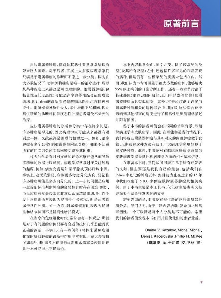 皮肤附属器肿瘤非常复杂,许多肿瘤在命名和分类上存在争议。一般的病理诊断标准有时并不适用于判断附属器肿瘤的良恶性诊断, 的诊断可使低度恶性附属器肿瘤患者避免不必要的治疗。本书内容包括所有附属器肿瘤的病理改变,并囊括了许多少见变异。按分化来源进行章节分类,并把特定的区域病变如眼睑、颈部、肚脐、肛门生殖器等专门分类,整理有序而查找非常方便,文字和插图简洁清晰,包括低倍镜全景和局部高倍镜特写。每个疾病按如下结构编写:临床特征、组织学、免疫组化、遗传特征及鉴别诊断。
