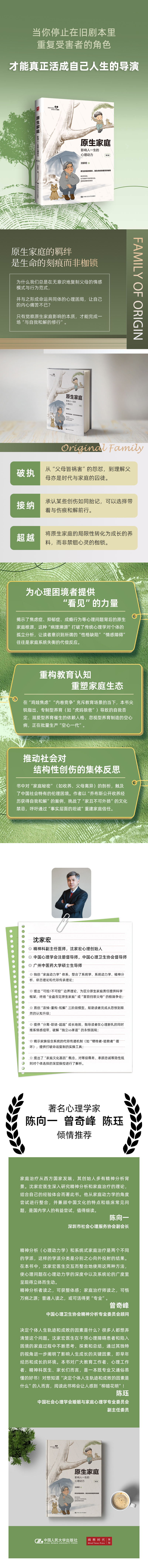本书作者沈家宏医生,融汇精神病学与心理治疗学的精粹,以三十多年临床实践与理论探索,发现了影响个体成长的关键性环节和因素,这些发现被作者命名为“家庭动力学”,其中的核心思想就是“个体的早年经历会影响或决定其人生状态”。这一理论体系承袭精神分析、沟通分析、依恋理论及代际传承理论的精髓,更以独到视角聚焦于塑造人格的早期密码,包括个体的出生方式、喂养模式、抚养人特质、家庭排行、原生家庭结构、重大创伤事件、父母关系质量、家庭文化信念等。这些看似琐碎的细节,实则编织成一张无形之网,潜移默化地定义着我们的人生轨迹。