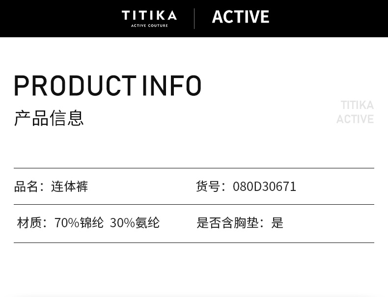 - 2009年,Titika Active Couture诞生于北美时尚之都,重新定义运动服饰,让运动时尚,前卫、性感,更宣扬一种无畏自由的生活态度。TITIKA缇缇卡不断求变,为品牌添加多种元素