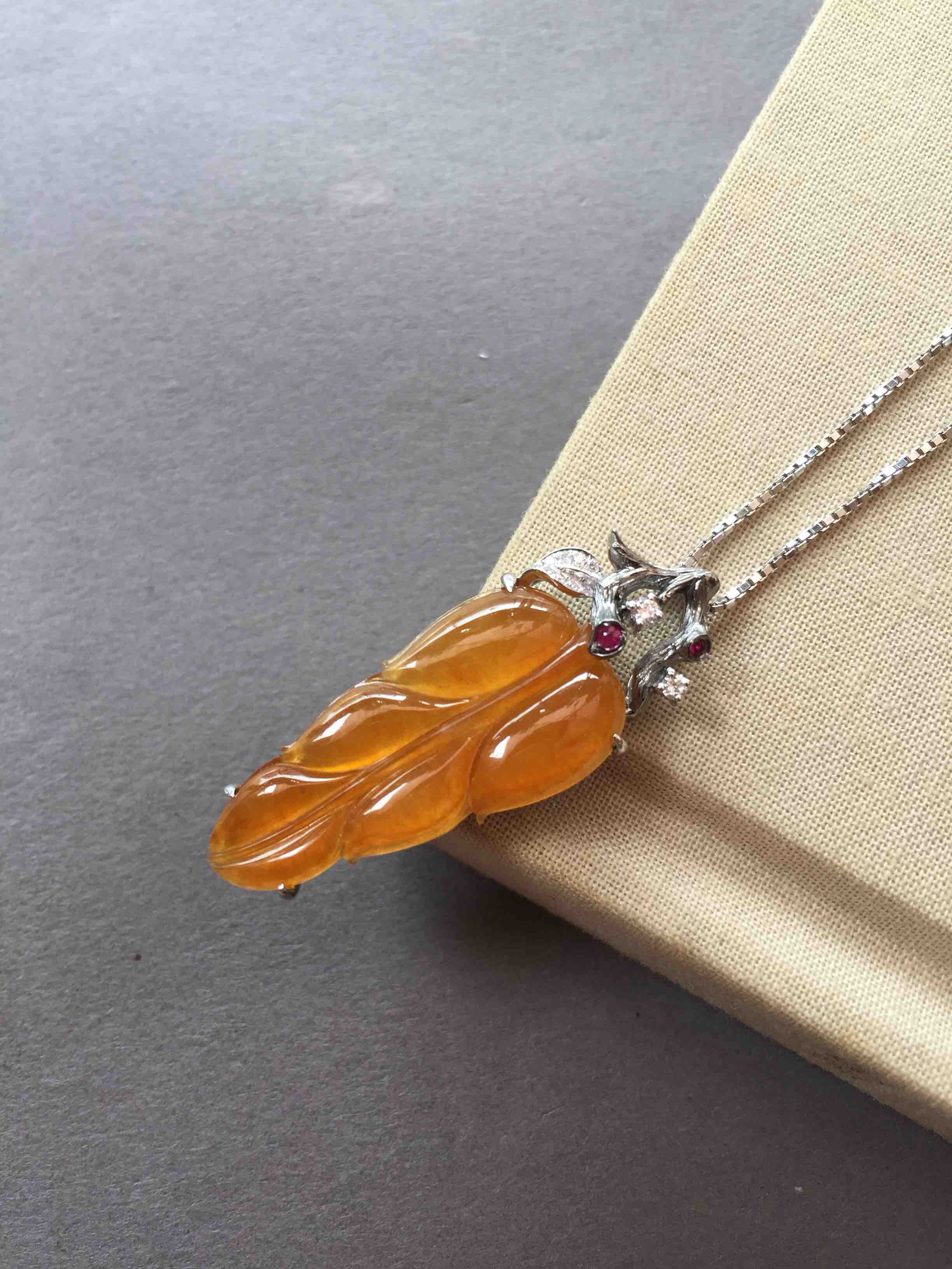 标本级的黄翡精品,芬达色,设计师款,种水晶莹剔透,荧光四射,黄色艳丽无比,29.5×14×4.1mm,镶嵌后37.3×14.4×6.6mm,黄翡存在于原石表层,通常很小很薄,种水粗糙,颜色容易受到干扰,碰到这样少见的黄翡,一定要做个别致的镶嵌设计才不亏待,18k黑金工艺,镶嵌钻石和红宝石,细节精致,不容错过的精品推荐