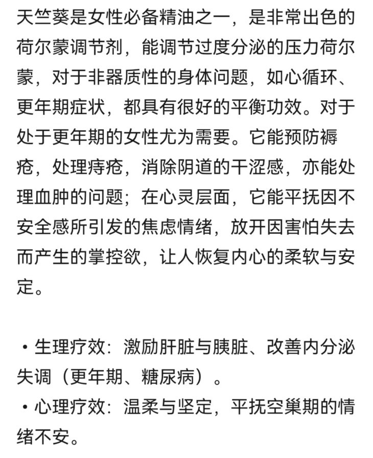 天竺葵的功效也是超多的,但精油的用法非常让人头大,芳疗小白确实很难正确使用,所以天竺葵精油我也主要是用来香薰,超好闻,是玫瑰平替了!除了用仪器,平时还会滴两滴在小香囊上,做为随身香气,很是温暖,心情会变好好!用于护肤的话,可以直接选天竺葵精露,现成的,紧实收敛的效果特别好,降燥去红,可喷可敷,也可以加50滴在温润油里,用来做身体油!还有个特别的用法,可以取2-8滴精油(自己尝试,滴了有效且无不适感即可),直接滴在贴会阴部位的内裤处,稍作揉搓,让精油充分附着再穿上,带豆腐渣样,泛黄,异味,特别适合用天竺葵精油,不差钱的试试玫瑰精油,更好。