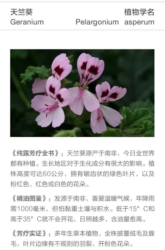 它的疗效其实与波旁天竺葵很类似,对于荷尔蒙的调整也佷出色,但临床上比较常用来保养生殖泌尿系统,具有激励补身之功效;用于护肤上,紧实收敛的效果颇佳。玫瑰天竺葵的气味宜人,很适合用来调制随身香气,全身按摩效果美妙,可以安抚极端忙碌后随即而来的空虚与寂寞,温暖疲惫的身心。