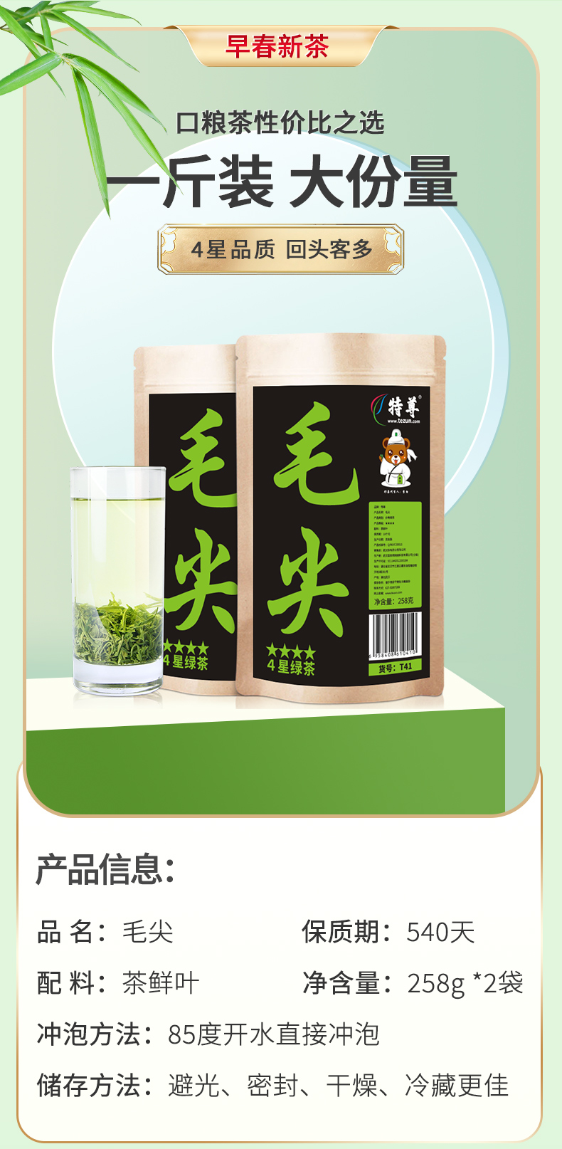 2026新茶 特尊茶4星毛尖明前春茶毛尖绿茶258g*2袋