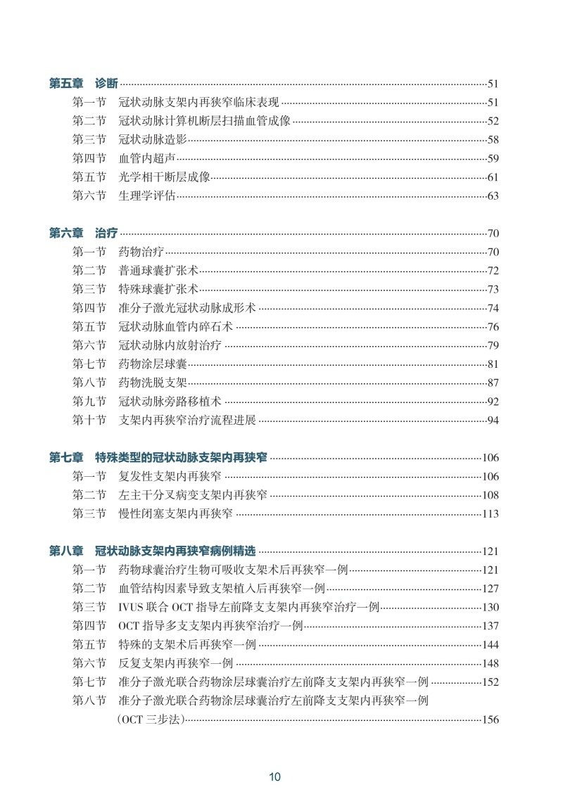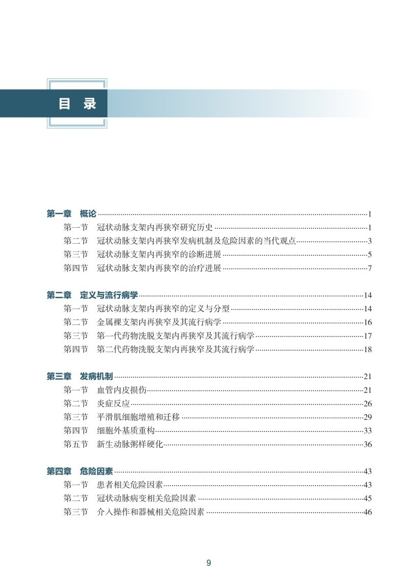 本书分为8章43节:①概论,包括冠状动脉支架内再狭窄研究历史、发病机制及危险因素的当代观点、诊断进展、治疗进展;②定义与流行病学特征,包括冠状动脉支架内再狭窄定义,以及金属裸支架、第一代药物洗脱支架、第二代药物洗脱支架内再狭窄发生率;③发病机制,包括血管内皮损伤、平滑肌细胞增殖和迁移、炎症反应、血管外基质重构、新生动脉粥样硬化;④危险因素,包括患者相关、冠状动脉病变相关、介入操作和器械相关危险因素;⑤诊断,包括冠状动脉支架内再狭窄临床表现、计算机断层成像、冠状动脉造影、血管内超声、光学相干断层成像、生理学评估;⑥治疗,包括药物治疗、普通球囊扩张术、特殊球囊扩张术、斑块消蚀术、血管内碎石术、冠状动脉内放射治疗、药物涂层球囊、药物洗脱支架、冠状动脉旁路移植术、支架内再狭窄治疗流程进展;⑦特殊类型冠状动脉支架内再狭窄,包括复发性支架内再狭窄、左主干支架内再狭窄、慢性闭塞支架内再狭窄;⑧冠状动脉支架内再狭窄病例精选。