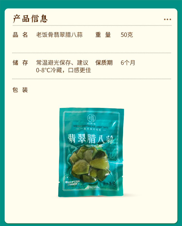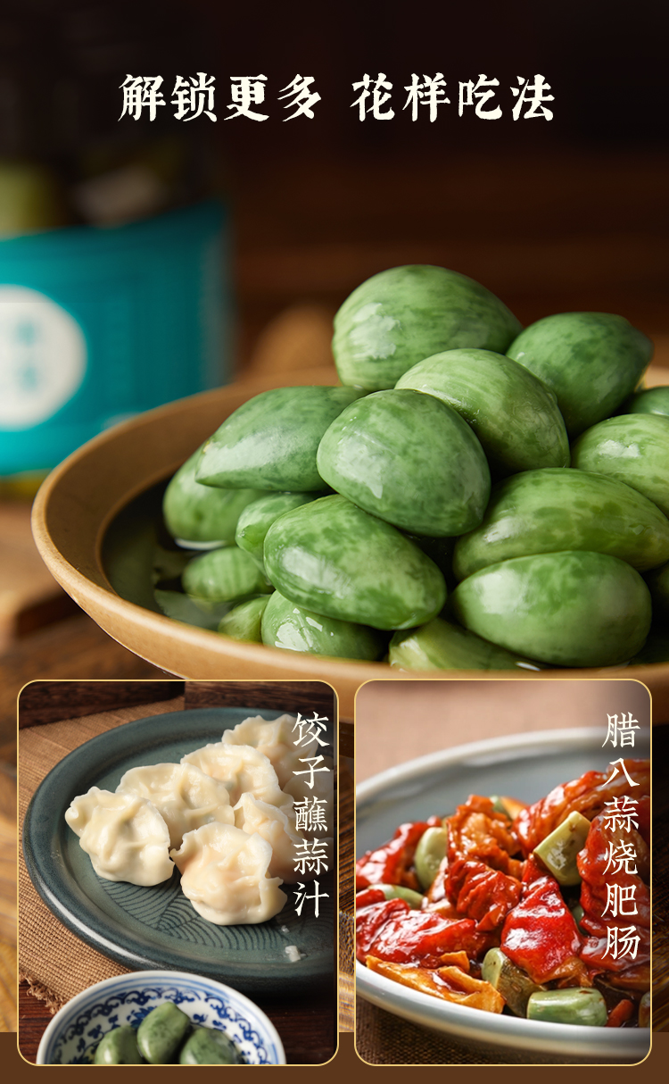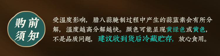 温馨小提示:温度对腊八蒜色泽与风味均有影响,建议收到货后,立即将其置于冰箱冷藏保存。低温环境能够减缓蒜蓝素的分解速度,保持腊八蒜的鲜亮色泽与纯正风味。