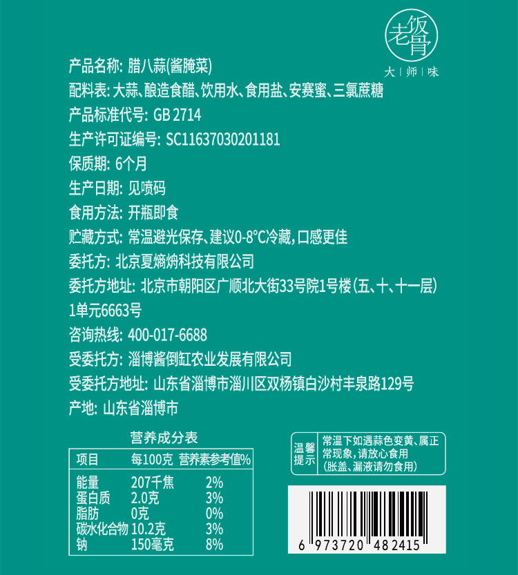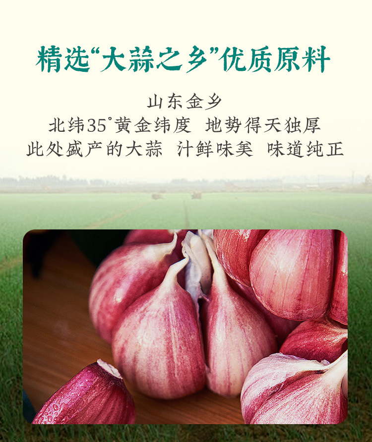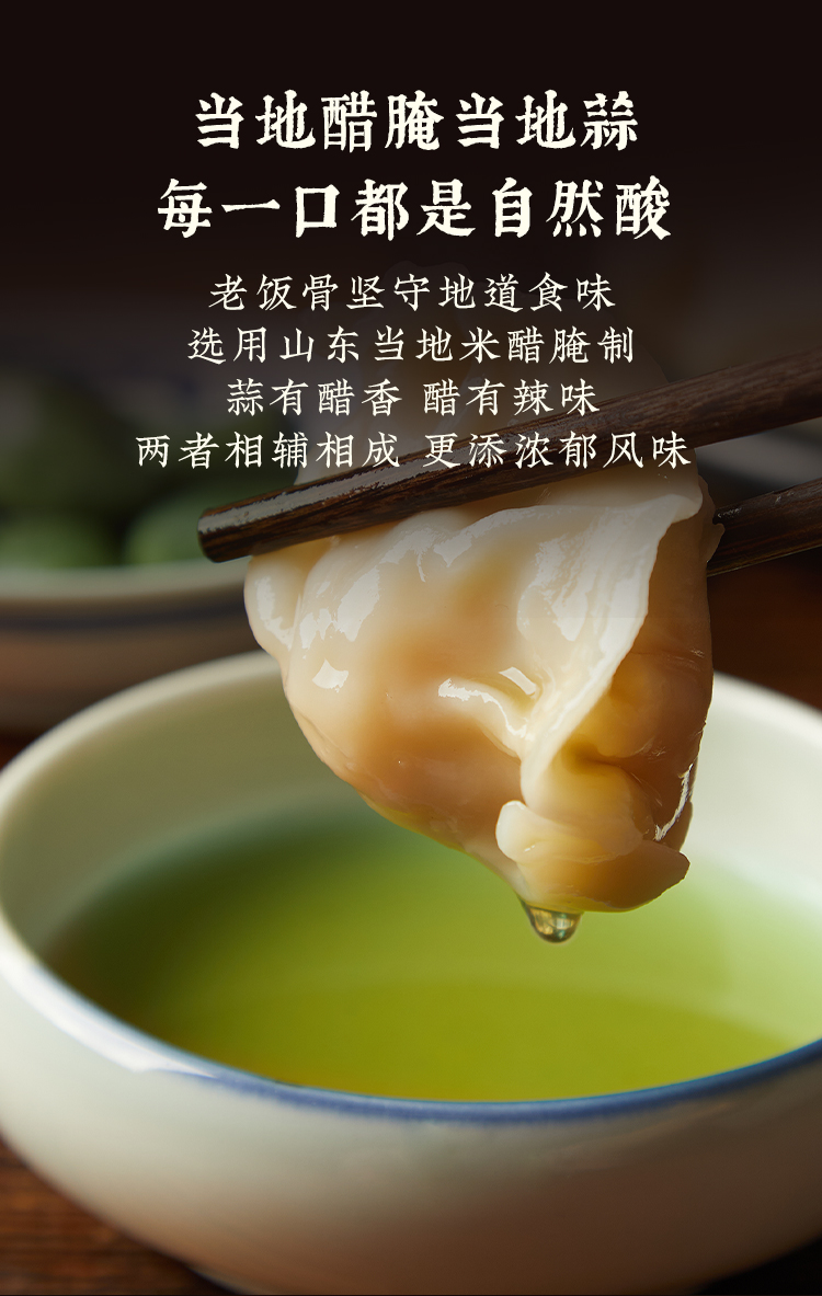 老饭骨腊八蒜的蒜头,源自“大蒜之乡”山东金乡,这片被北纬35°黄金纬度拥抱的土地,以其得天独厚的自然条件,孕育出汁鲜味美、味道纯正的优质大蒜。老饭骨遵循古法,采用山东当地特有的米醋进行腌制,色泽清亮,酸香浓郁,与金乡大蒜的辛辣完美融合,经过时间的洗礼,蒜中融入了醋的醇厚,醋里又带上了蒜的鲜辣,两者相互渗透,相互成就,形成了一种难以言喻的浓郁风味。同时,老饭骨还进行了深入的研究与实验,通过精确控制腌制温度和时长,有效降低了蒜臭素的产生,吃着更香,臭得也不那么明显!