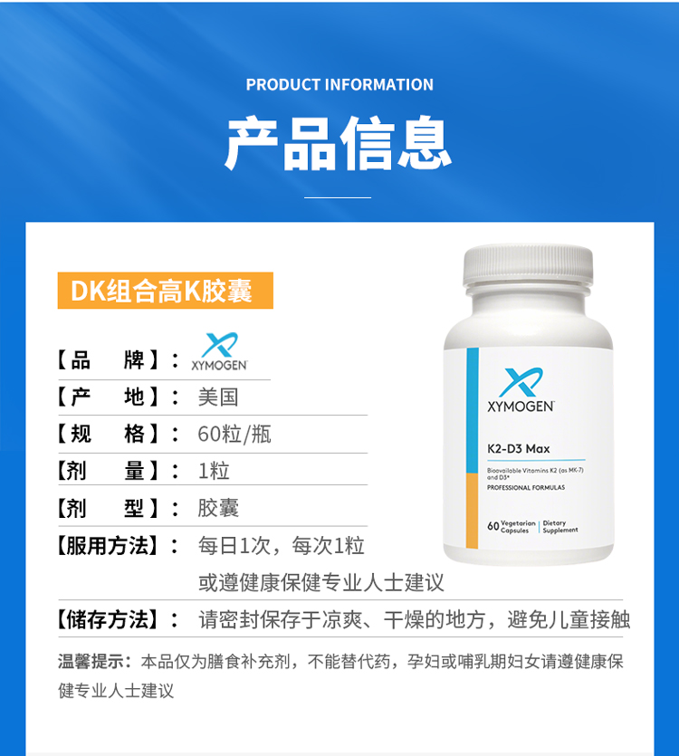 【效期至27年3月】DK组合高K胶囊XYMOGENK2-D3 Max60粒/瓶