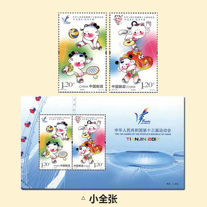 中国邮政定于2017年8月27日发行《中华人民共和国第十三届运动会》纪念邮票一套2枚,小全张一枚。邮票图案内容分别为:竞技体育、群众体育。
