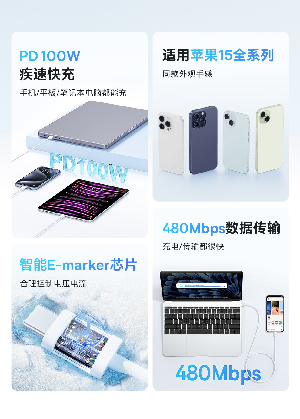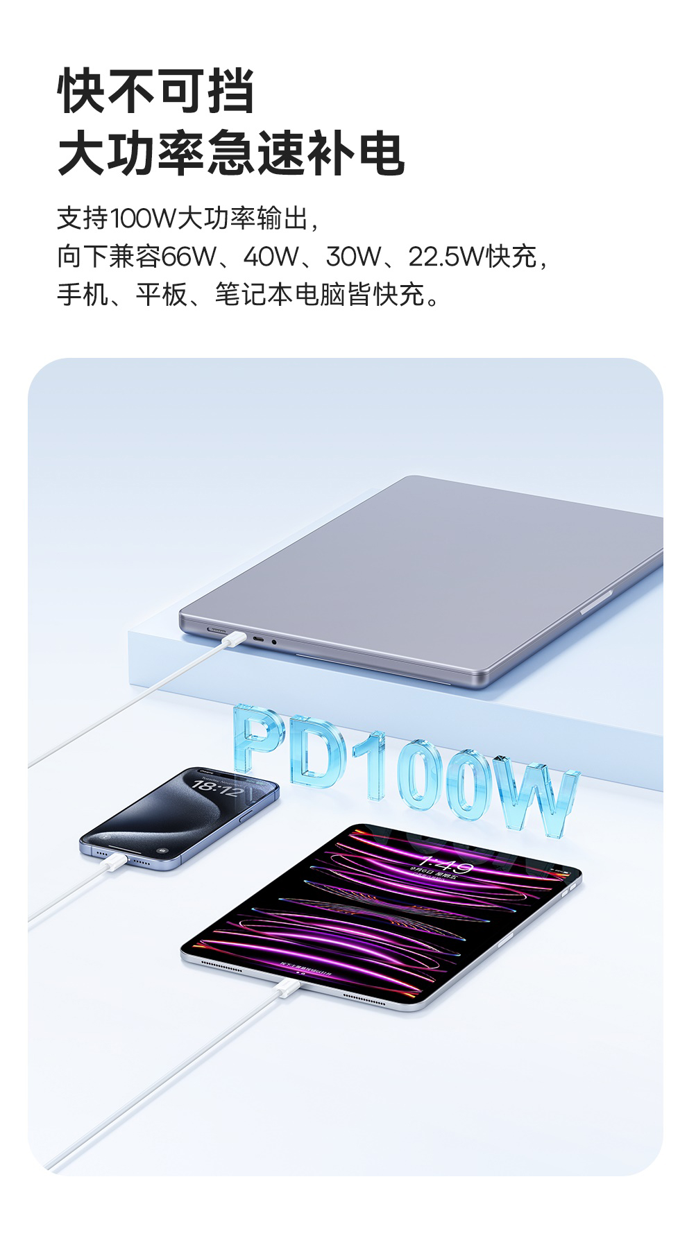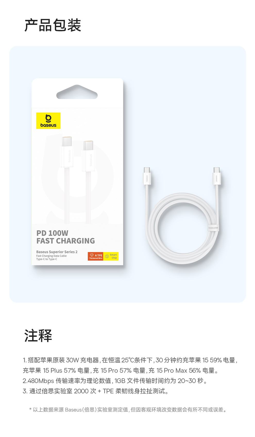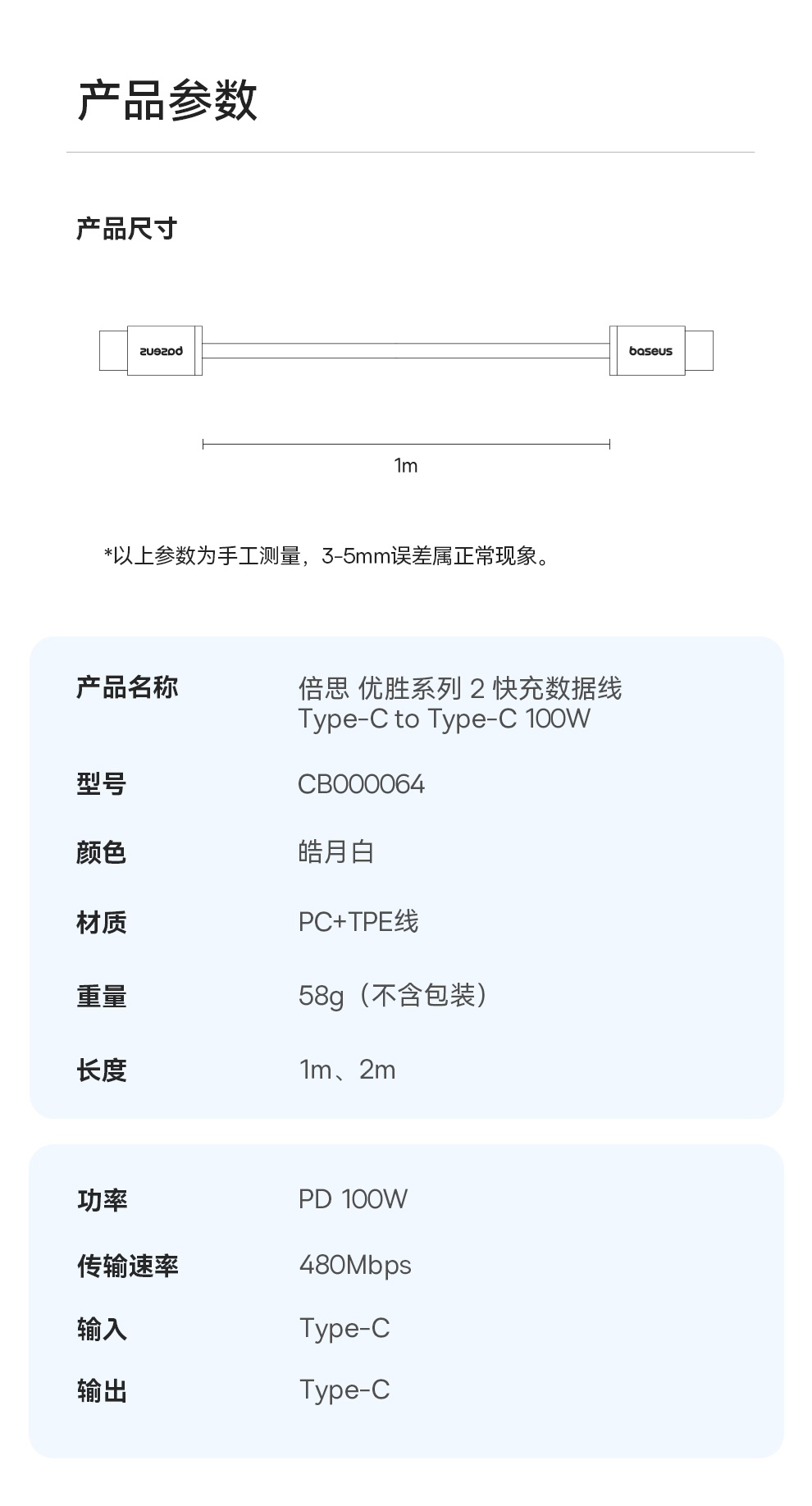 倍思 优胜系列 2 快充数据线 Type-C to Type-C 100W 安卓快充 苹果15系列通用
