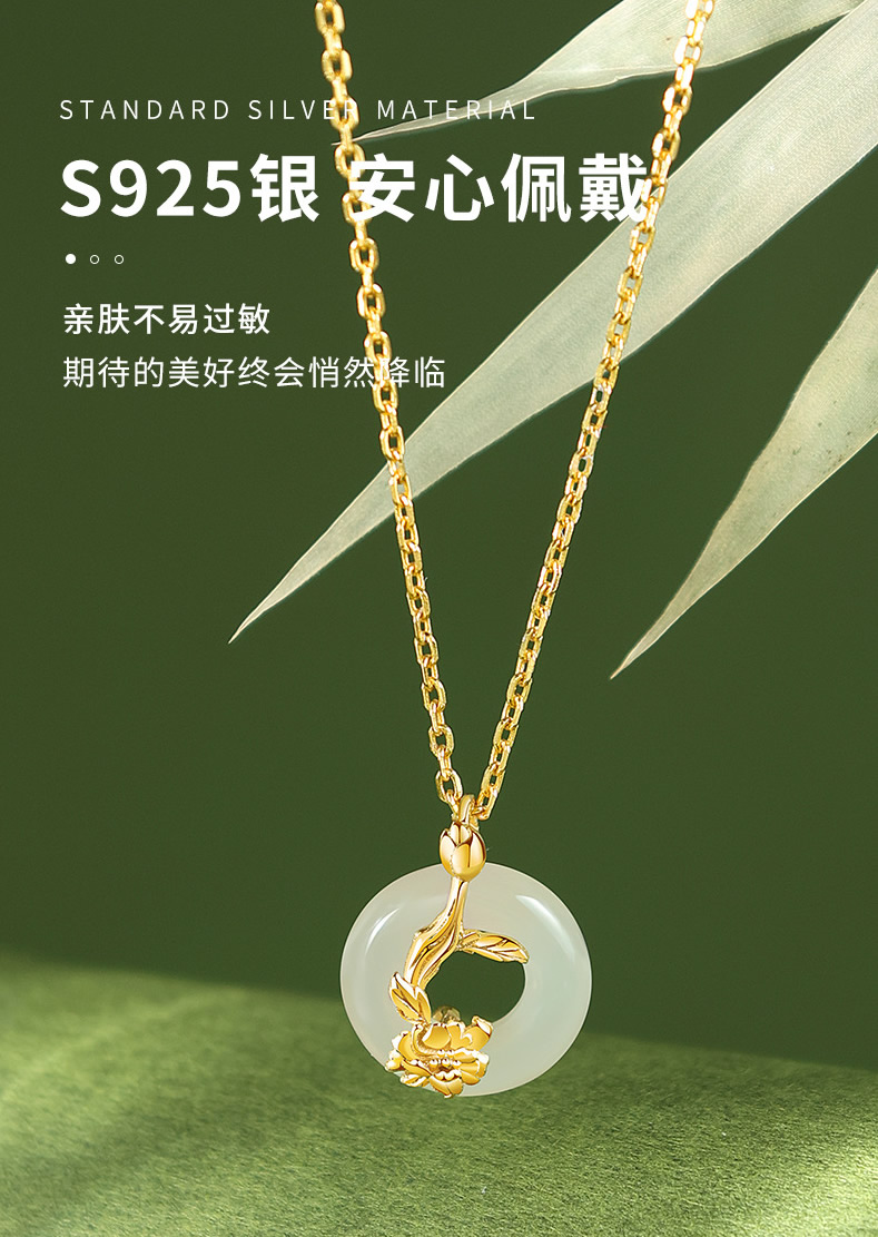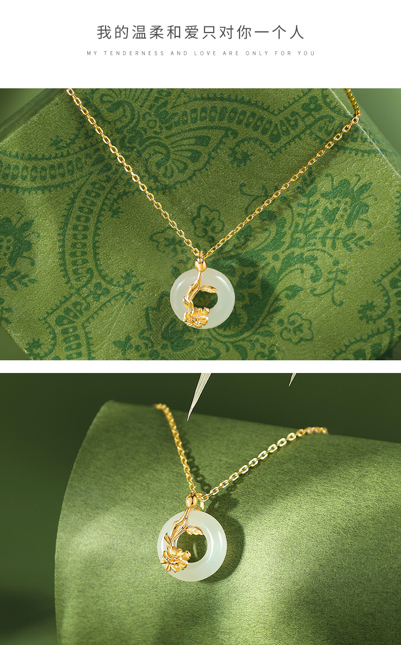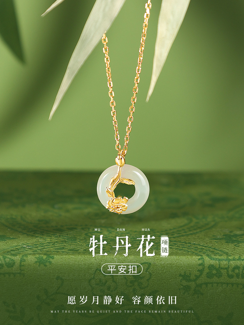 【母亲节礼物】六鑫珠宝 牡丹花平安扣和田玉项链 送妈妈婆婆