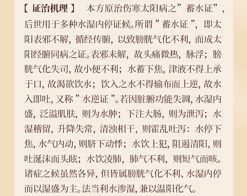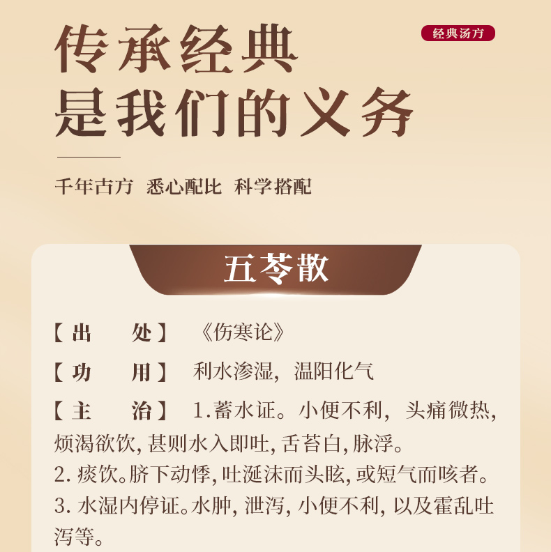 五苓散48g/剂(桂枝/白术/猪苓/茯苓/泽泻) 出自《伤寒论》