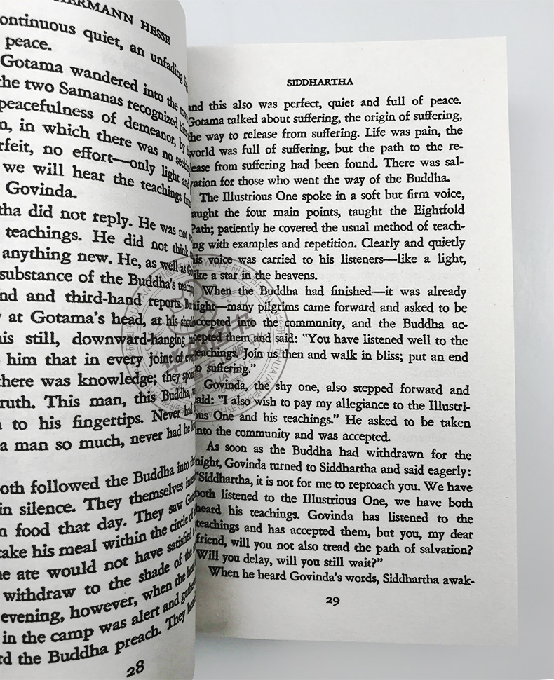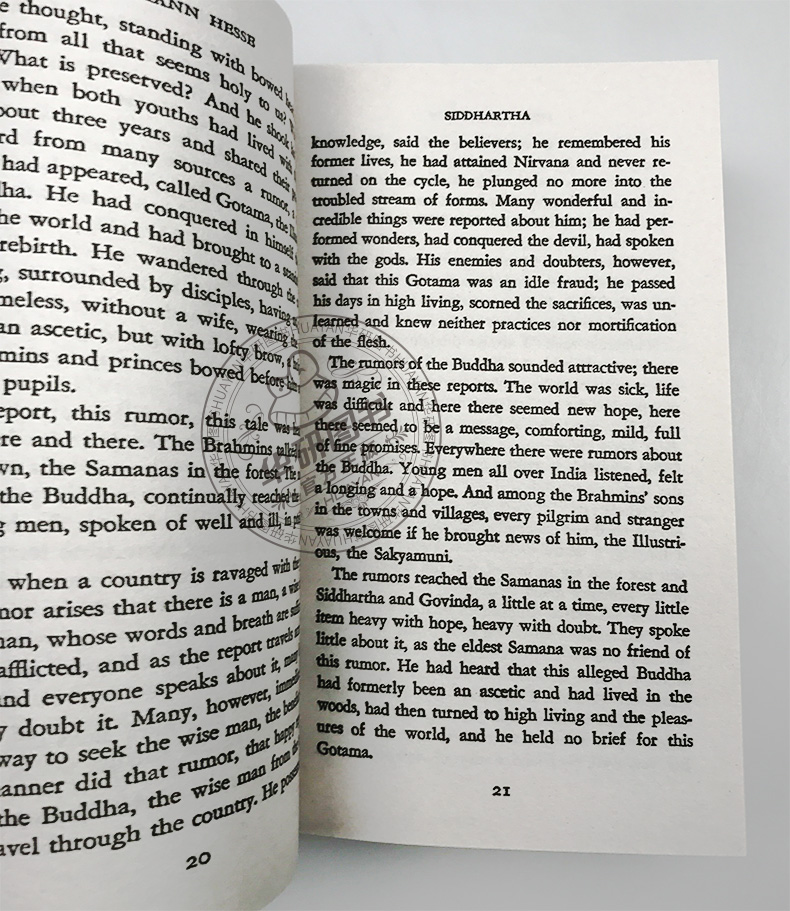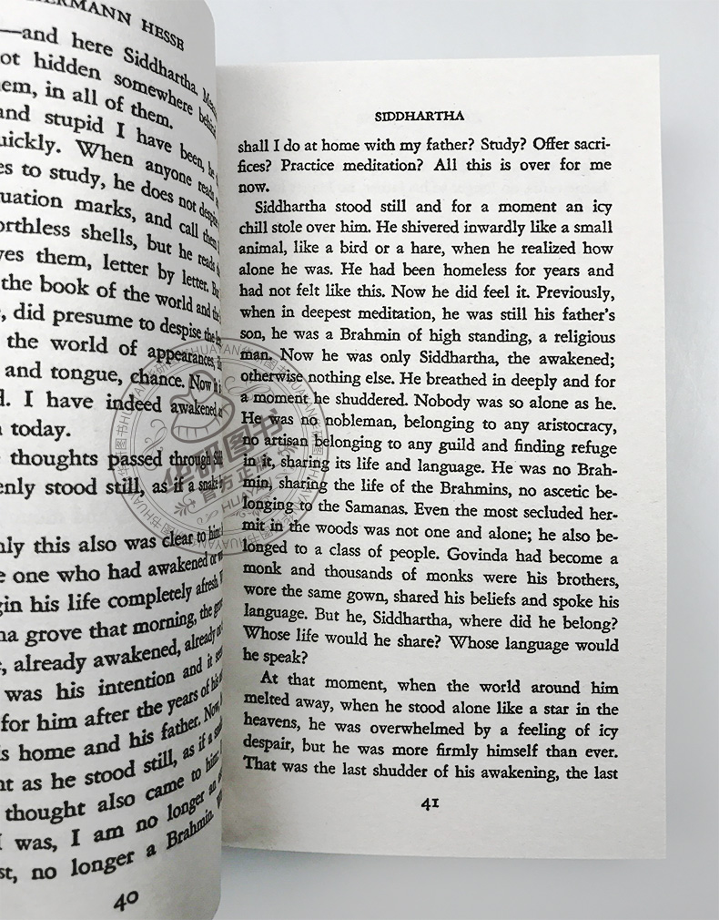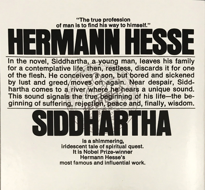 Siddhartha《悉达多》是黑塞的第九部作品,在书中,悉达多求道的过程,折射出隐藏于世人内心的不安和迷惑。经过一生的追求,悉达多终于体验到万事万物的圆融统一,以及所有生命不可摧毁的本性,并将自我融入瞬间的永恒之中。《悉达多》带领读者以一种平和、不执妄的喜悦心,追求真我;炉火纯青的文字,细腻而精确地表达了现代人的心灵。