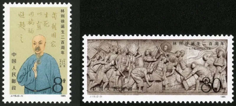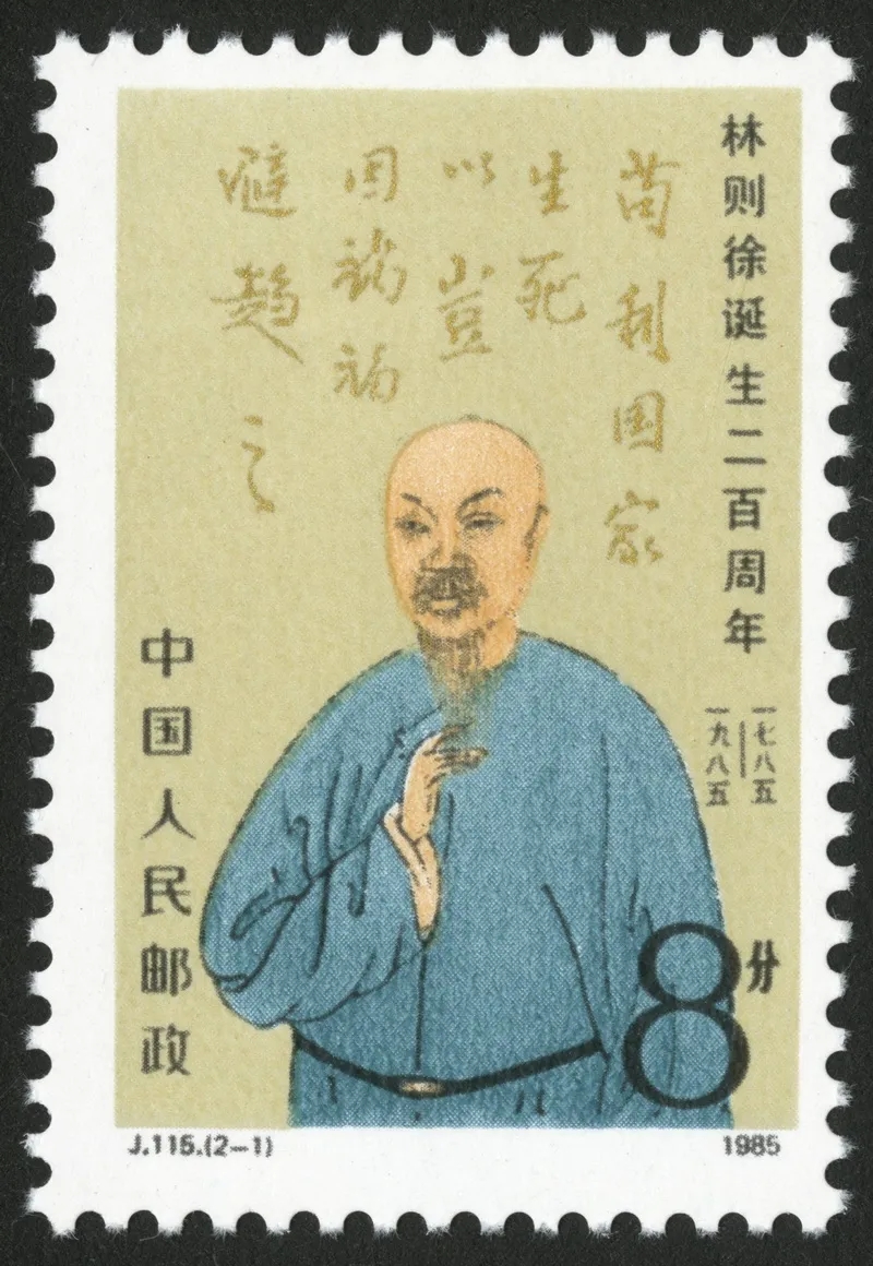 2-1为“林则徐画像”。邮票图案是中国革命博物馆藏的一幅林则徐写生像,画面背景为费孝通抄录的林则徐《赴戍登程口占示家》中的两句诗:“苟我国家生死以,岂因祸福避趋之”。意思是说:如与国家的生死存亡有关,岂能因个人得失,避祸就福。