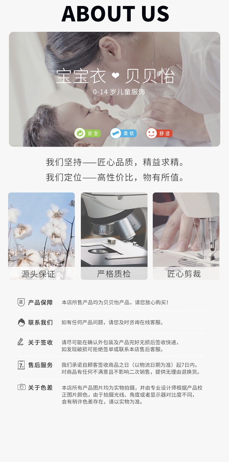 - 贝贝怡专注0-6岁婴幼儿服饰,坚持安全、柔软、舒适的产品理念,为千万中国家庭提供超高品质、安全可靠的婴幼儿服饰产品,妈妈放心,宝宝开心!