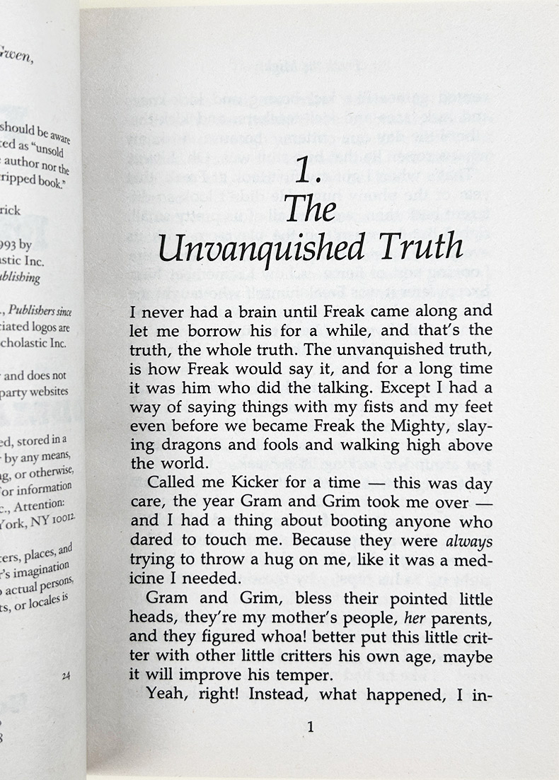 I never had a brain until Freak came along and let me borrow his for a while, and that’s the truth, the whole truth. The unvanquished truth, is how Freak would say it, and for a long time it was him who did the talking. Except I had a way of saying things with my first and my feet even before we became Freak the Mighty, slaying dragons and fools and walking high above the world.