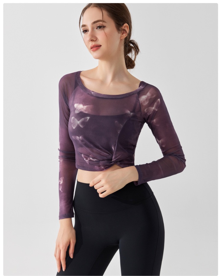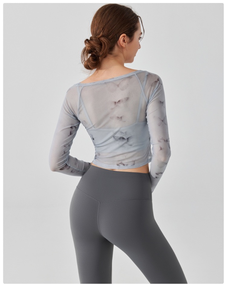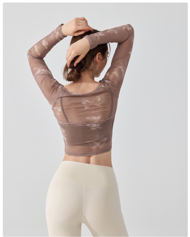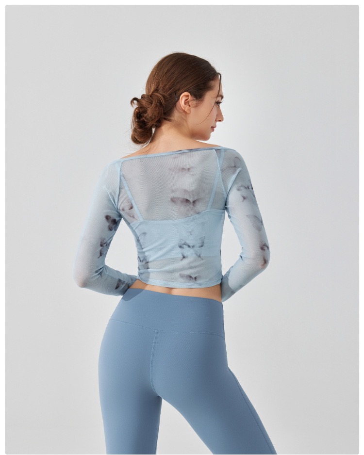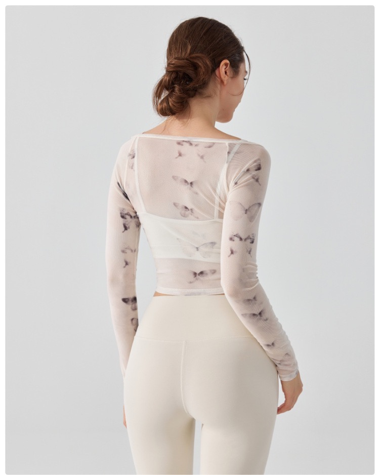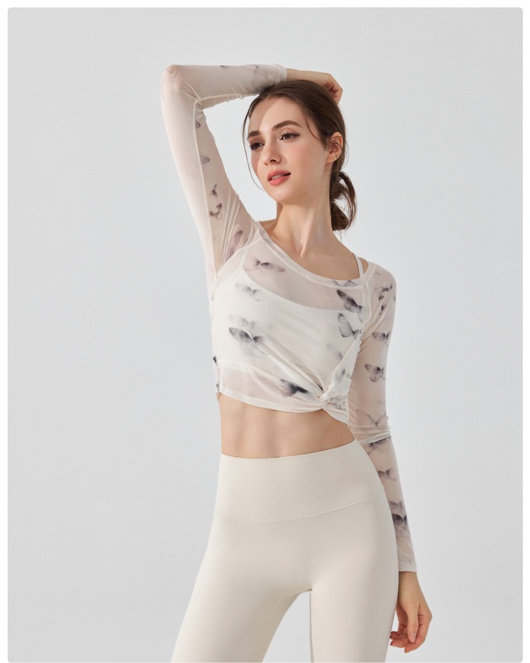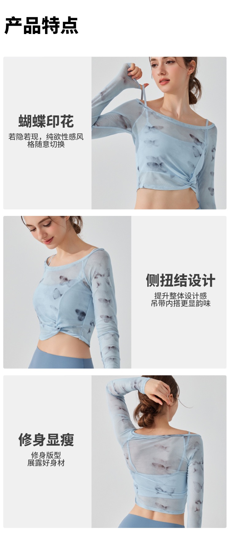 新款假两件蝴蝶网纱运动普拉提瑜伽服长袖固定式胸垫速干罩衫JL YC337