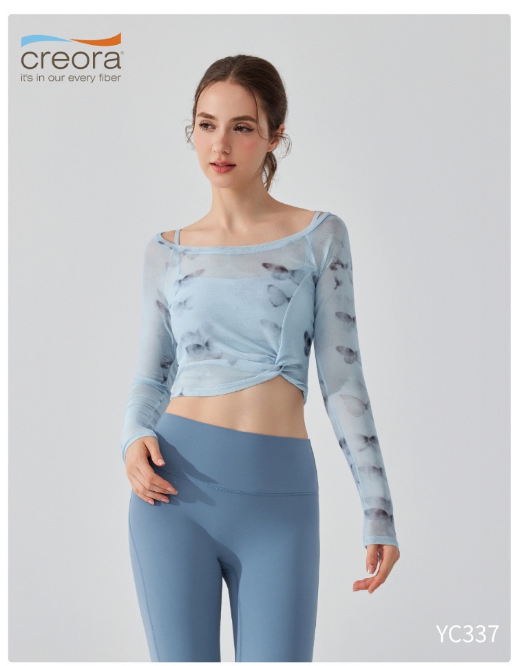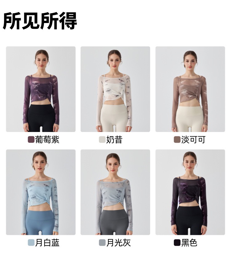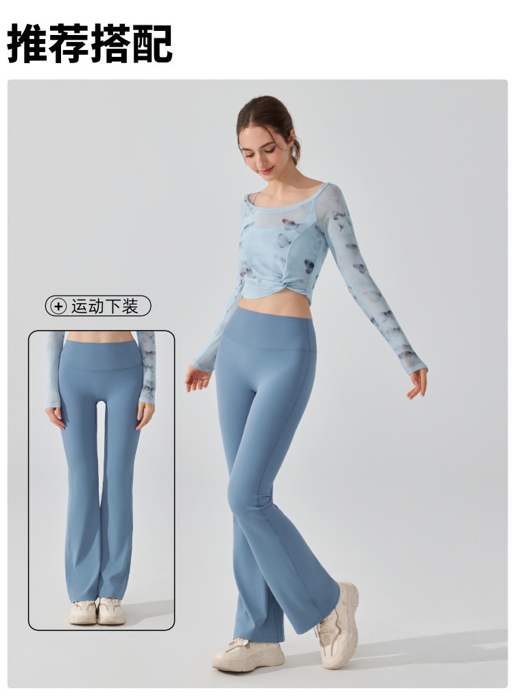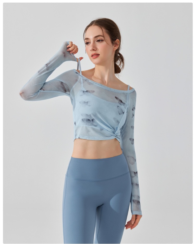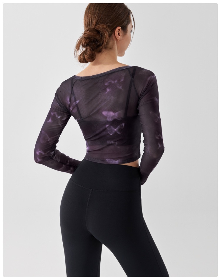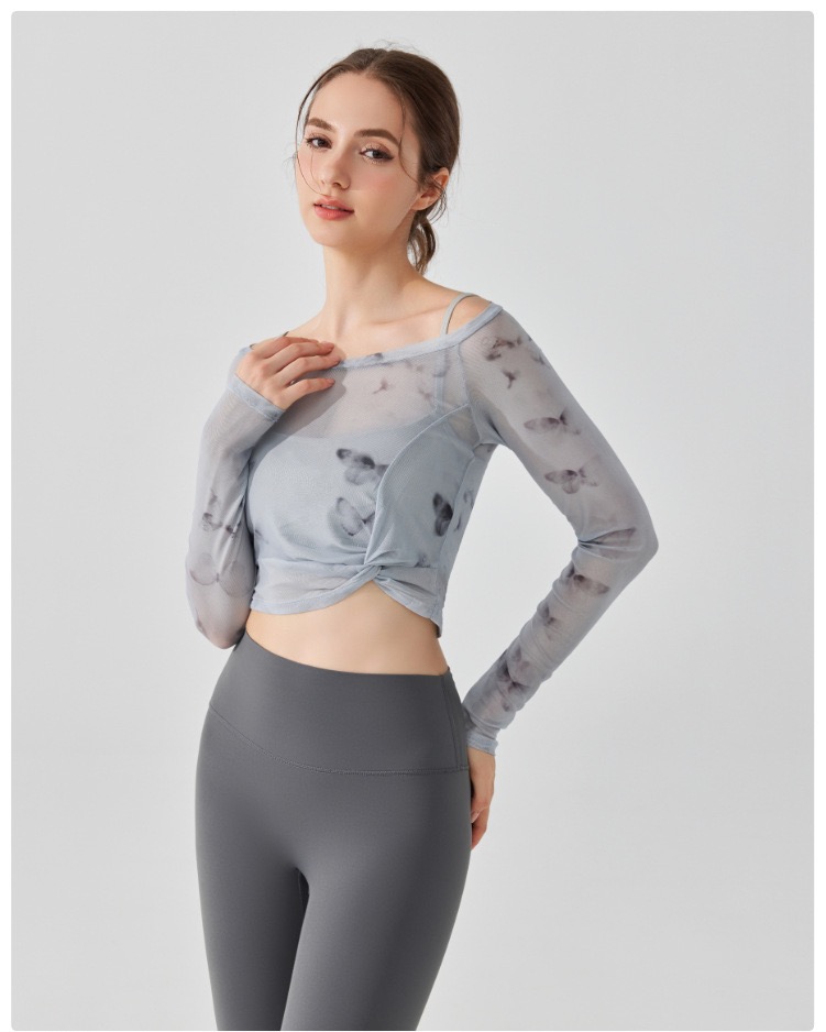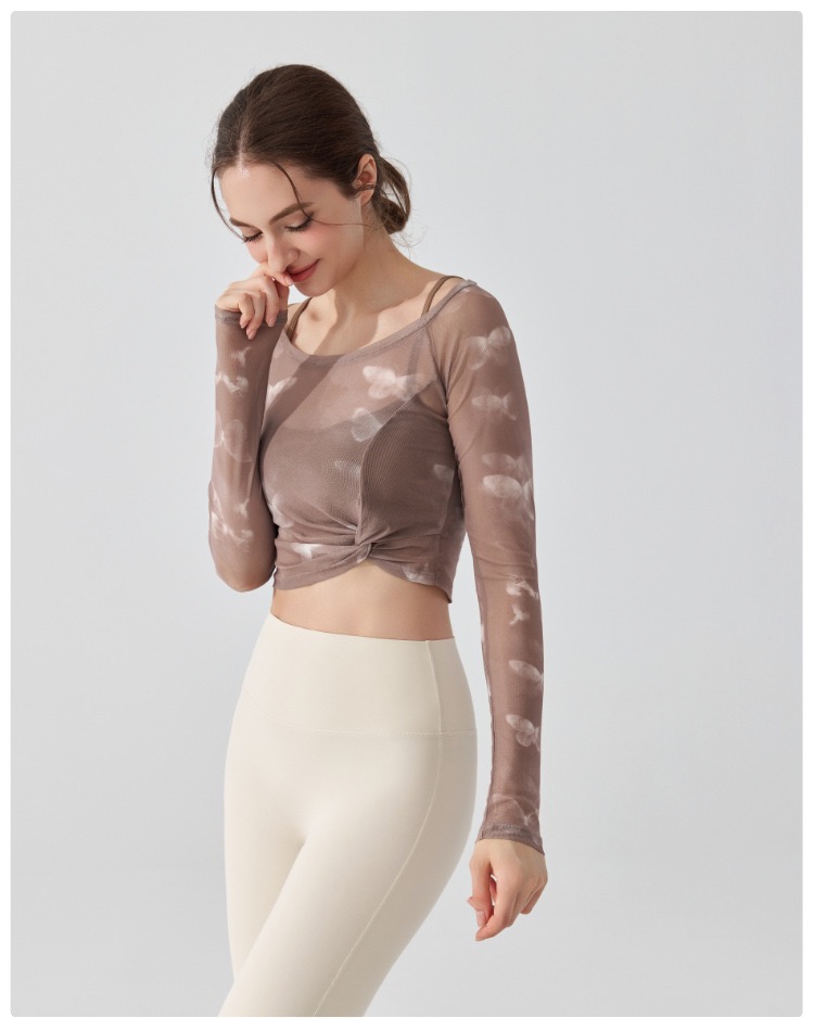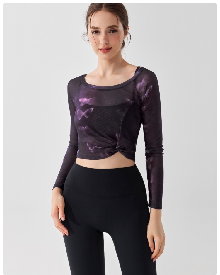 新款假两件蝴蝶网纱运动普拉提瑜伽服长袖固定式胸垫速干罩衫JL YC337