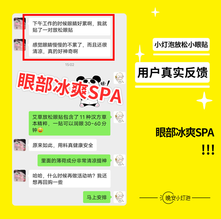 后来用了这款放松小眼贴,冰冰凉凉的非常舒服,眼睛不累了,上课都更有精神了,现在每天都带着眼贴学习!