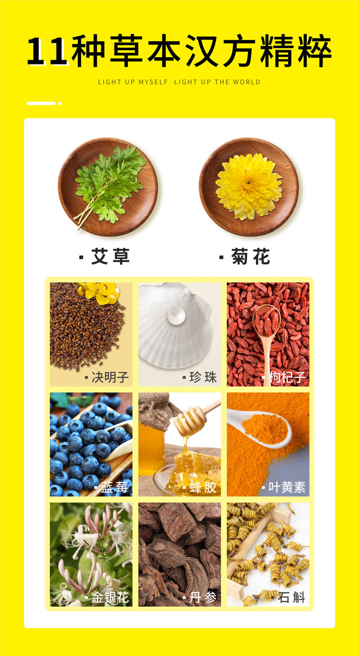同时搭配决明子、珍珠、枸杞子、蓝莓、蜂胶、叶黄素、金银花、丹参、石斛等汉方草本精粹,用草本之力呵护双眼👀