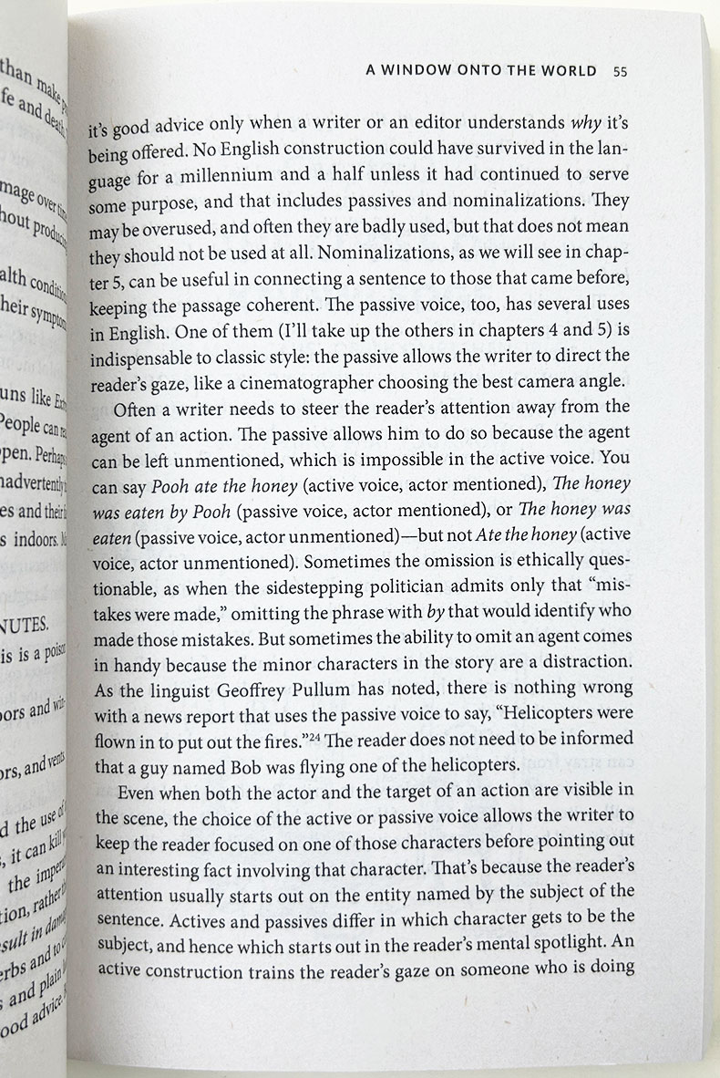 Prologue I love style manuals. Ever since I was assigned Strunk and White’s The Elements of Style in an introductory psychology course, the writing guide has been among my favorite literary genres. It’s not just that I welcome advice on the lifelong challenge of perfecting the craft of writing. It’s also that credible guidance on writing must itself be well written, and the best of the manuals are paragons of their own advice. William Strunk’s course notes on writing, which his student E. B. White turned into their famous little book, was studded with gems of self-exemplification such as “Write with nouns and verbs,” “Put the emphatic words of a sentence at the end,” and best of all, his prime directive, “Omit needless words.” Many eminent stylists have applied their gifts to explaining the art, including Kingsley Amis, Jacques Barzun, Ambrose Bierce, Bill Bryson, Robert Graves, Tracy Kidder, Stephen King, Elmore Leonard, F. L. Lucas, George Orwell, William Safire, and of course White himself, the beloved author of Charlotte’s Web and Stuart Little. Here is the great essayist reminiscing about his teacher: I like to read style manuals for another reason, the one that sends botanists to the garden and chemists to the kitchen: it’s a practical application of our science. I am a psycholinguist and a cognitive scientist, and what is style, after all, but the effective use of words to engage the human mind? It’s all the more captivating to someone who seeks to explain these fields to a wide readership. I think about how language works so that I can best explain how language works. But my professional acquaintance with language has led me to read the traditional manuals with a growing sense of unease. Strunk and White, for all their intuitive feel for style, had a tenuous grasp of grammar.2 They misdefined terms such as phrase, participle, and relative clause, and in steering their readers away from passive verbs and toward active transitive ones they botched their examples of both. There were a great number of dead leaves lying on the ground, for instance, is not in the passive voice, nor does The cock’s crow came with dawn contain a transitive verb. Lacking the tools to analyze language, they often struggled when turning their intuitions into advice, vainly appealing to the writer’s “ear.” And they did not seem to realize that some of the advice contradicted itself: “Many a tame sentence . . . can be made lively and emphatic by substituting a transitive in the active voice” uses the passive voice to warn against the passive voice. George Orwell, in his vaunted “Politics and the English Language,” fell into the same trap when, without irony, he derided prose in which “the passive voice is wherever possible used in preference to the active.” Self-contradiction aside, we now know that telling writers to avoid the passive is bad advice. Linguistic research has shown that the passive construction has a number of indispensable functions because of the way it engages a reader’s attention and memory. A skilled writer should know what those functions are and push back against copy editors who, under the influence of grammatically naïve style guides, blue-pencil every passive construction they spot into an active one. Style manuals that are innocent of linguistics also are crippled in dealing with the aspect of writing that evokes the most emotion: correct and incorrect usage. Many style manuals treat traditional rules of usage the way fundamentalists treat the Ten Commandments: as unerring laws chiseled in sapphire for mortals to obey or risk eternal damnation. But skeptics and freethinkers who probe the history of these rules have found that they belong to an oral tradition of folklore and myth. For many reasons, manuals that are credulous about the inerrancy of the traditional rules don’t serve writers well. Although some of the rules can make prose better, many of them make it worse, and writers are better off flouting them. The rules often mash together issues of grammatical correctness, logical coherence, formal style, and standard dialect, but a skilled writer needs to keep them straight. And the orthodox stylebooks are ill equipped to deal with an inescapable fact about language: it changes over time. Language is not a protocol legislated by an authority but rather a wiki that pools the contributions of millions of writers and speakers, who ceaselessly bend the language to their needs and who inexorably age, die, and get replaced by their children, who adapt the language in their turn.